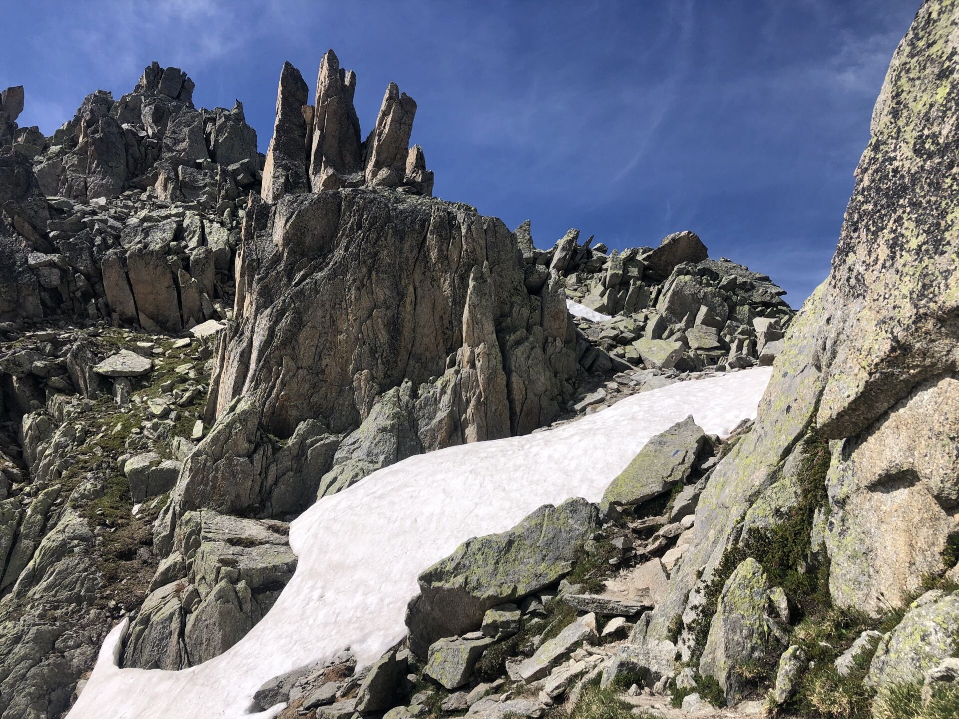 Zunächst geniessen wir nochmals die Gletscherblicke auf Augenhöhe, auch die Seitenblicke auf die prägnanten Felsnadeln des Grats sind mehr als faszinierend. Danach steigen wir durch das Couloir ab.