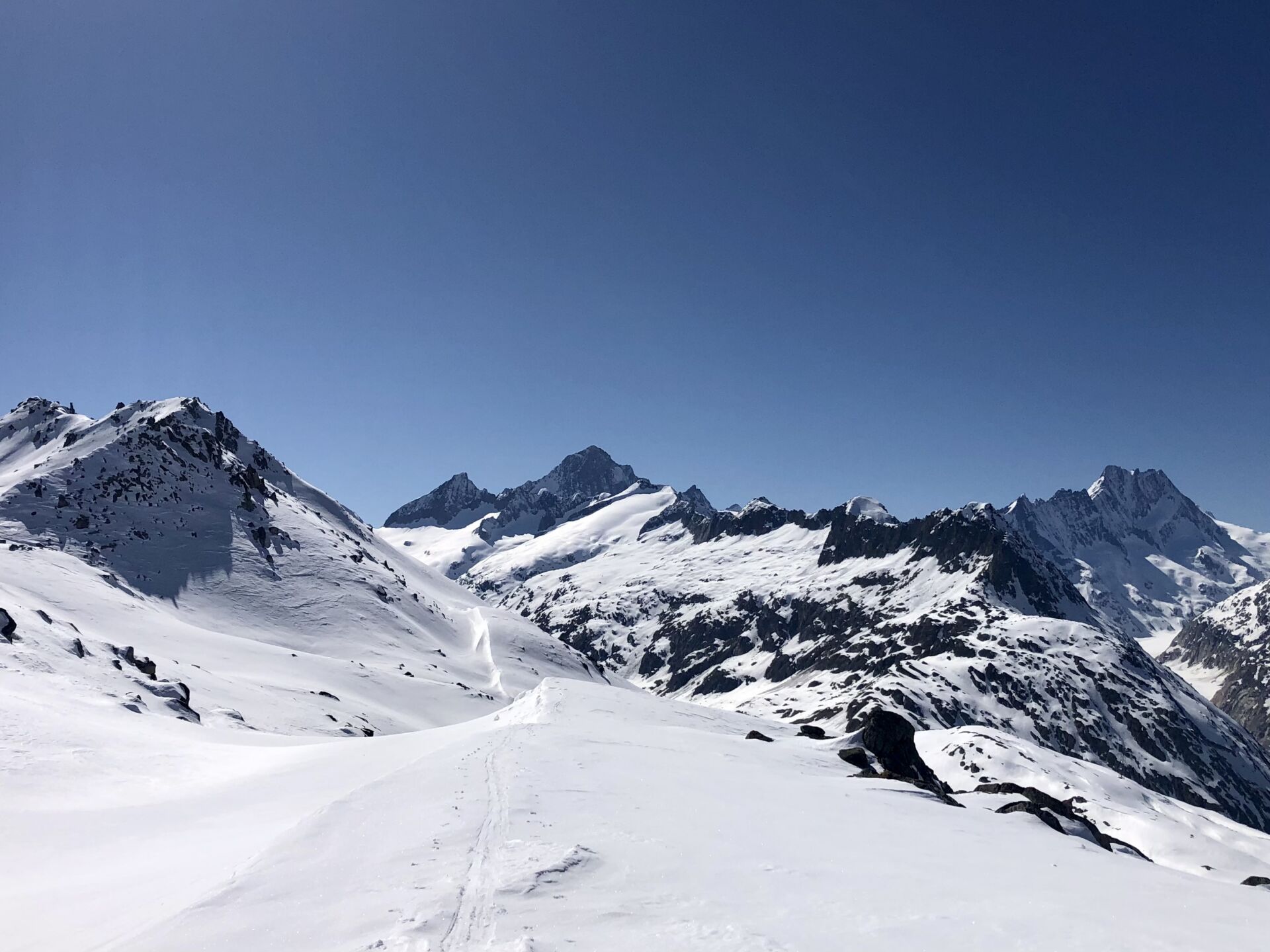 Aber es lohnt sich – und wie. Der Rückblick ins Oberaarmassiv, das kurze Grüssen von Lauteraar- und Schreckhorn. Nach vorne die Sicht ins Goms, darüber thronend unter anderem das Blinnenhorn und das Ofenhorn, die uns an eine der schönsten Etappen der Ost-West-Transversale in 2018 erinnern. So strahlt denn auch Walter, auch wenn er die kommende Abfahrt durch den dicken Sulz nach Oberwald nicht mehr zuoberst auf seiner Wunschliste hat, so schwer sind die Beine geworden. „Edwins Planungen“, seufzt er, „es ist nicht weit!“ Aber er kennt seinen Bruder schon zu lange um es ihm übel zu nehmen.