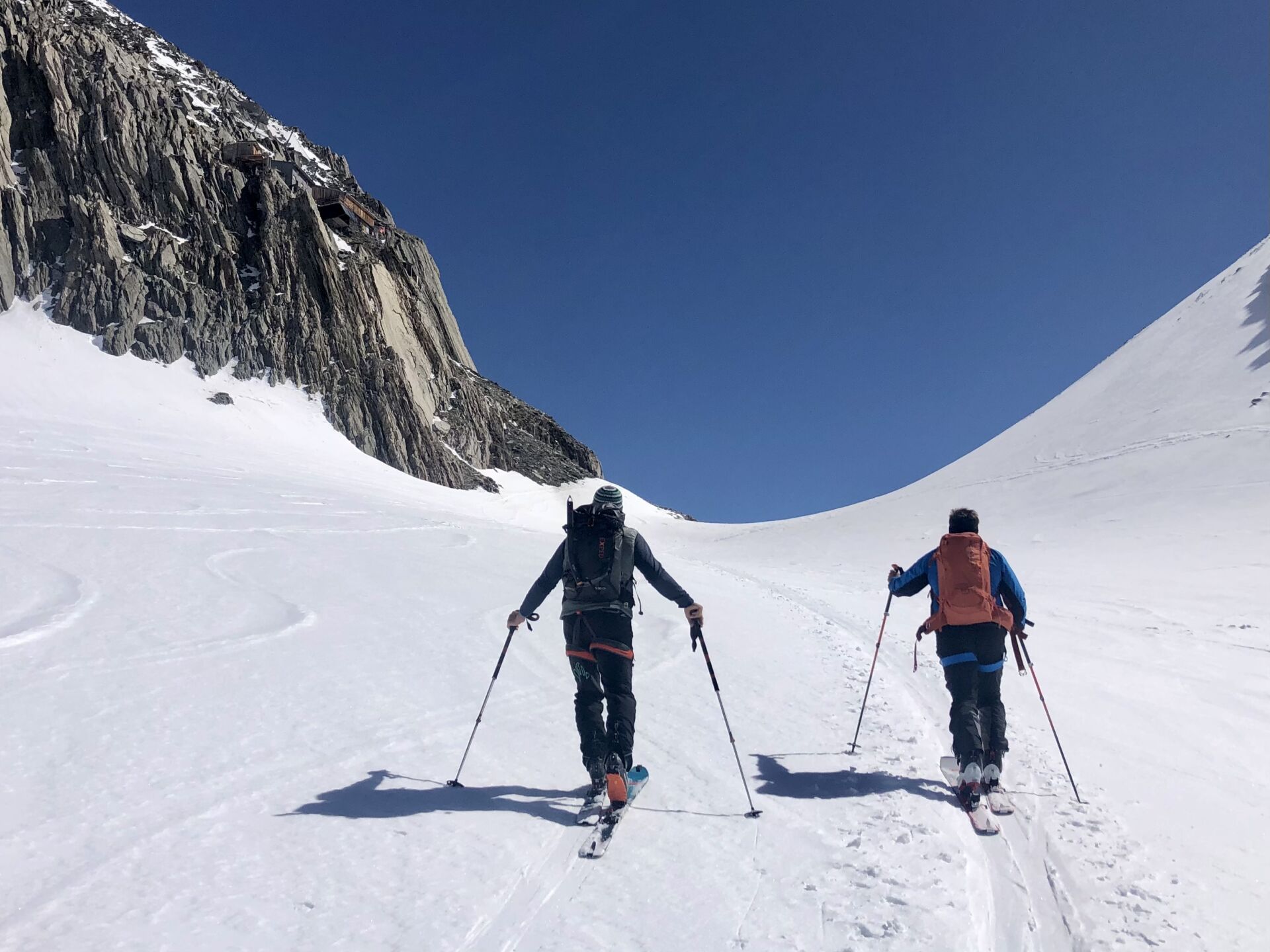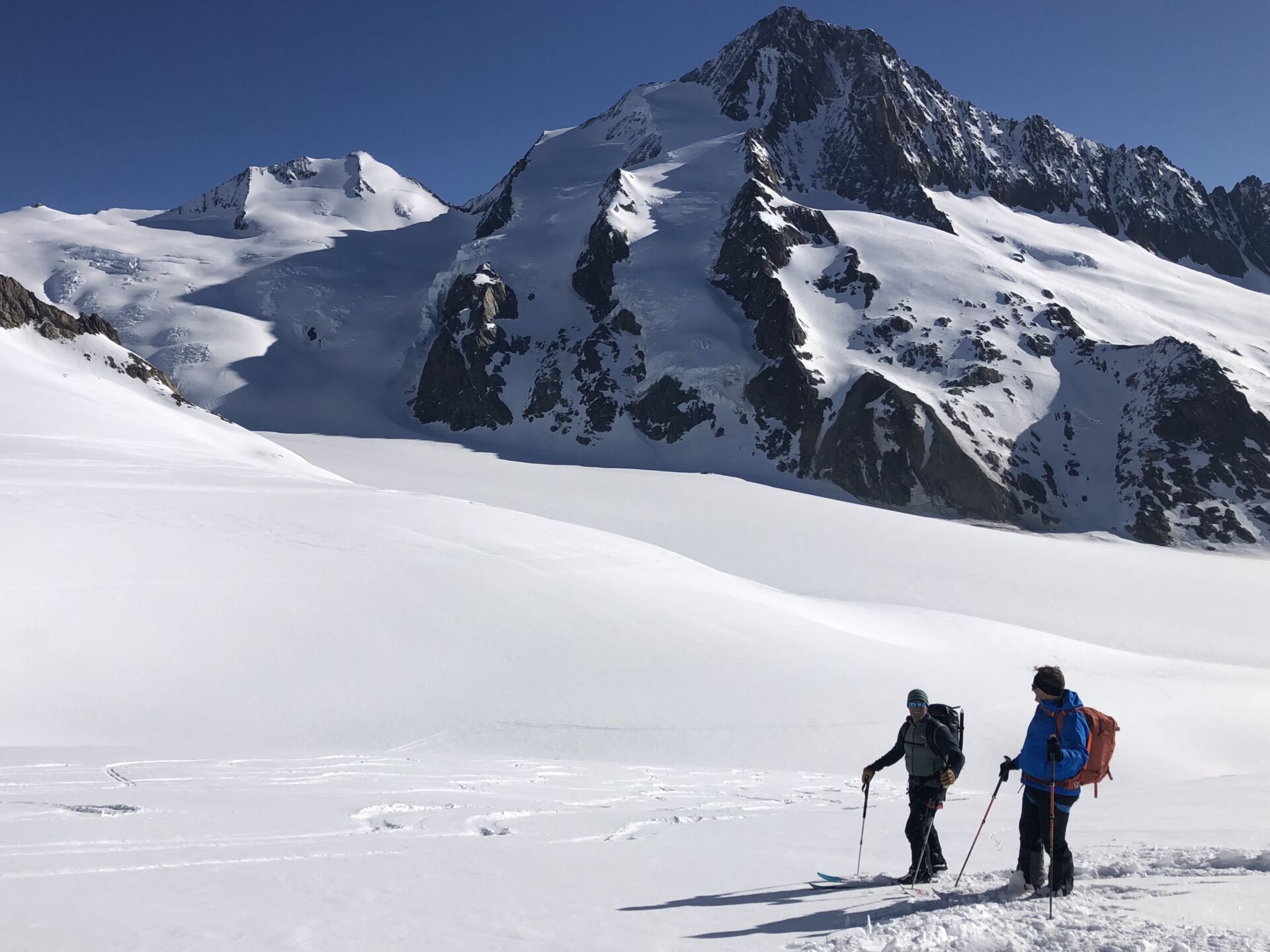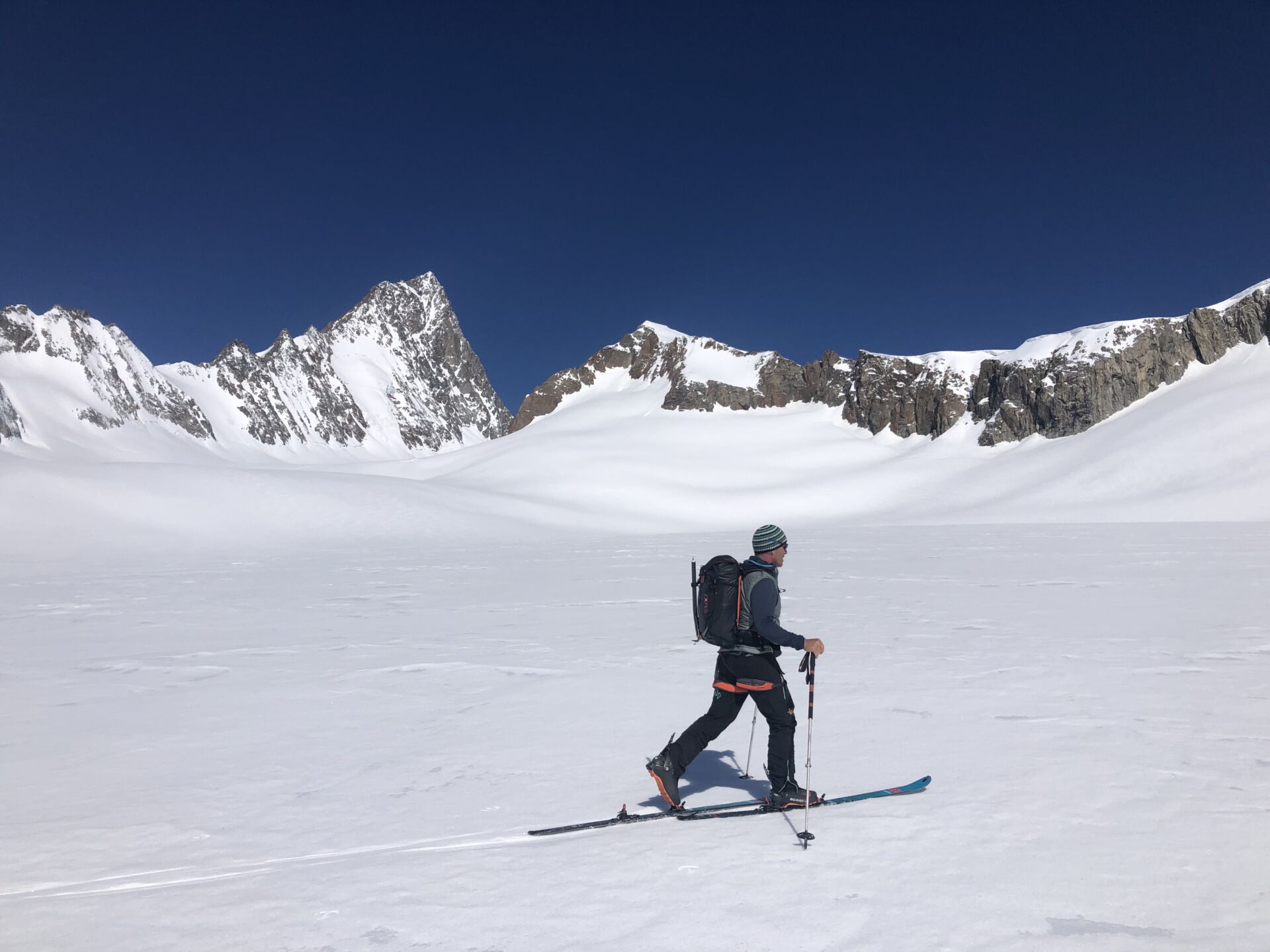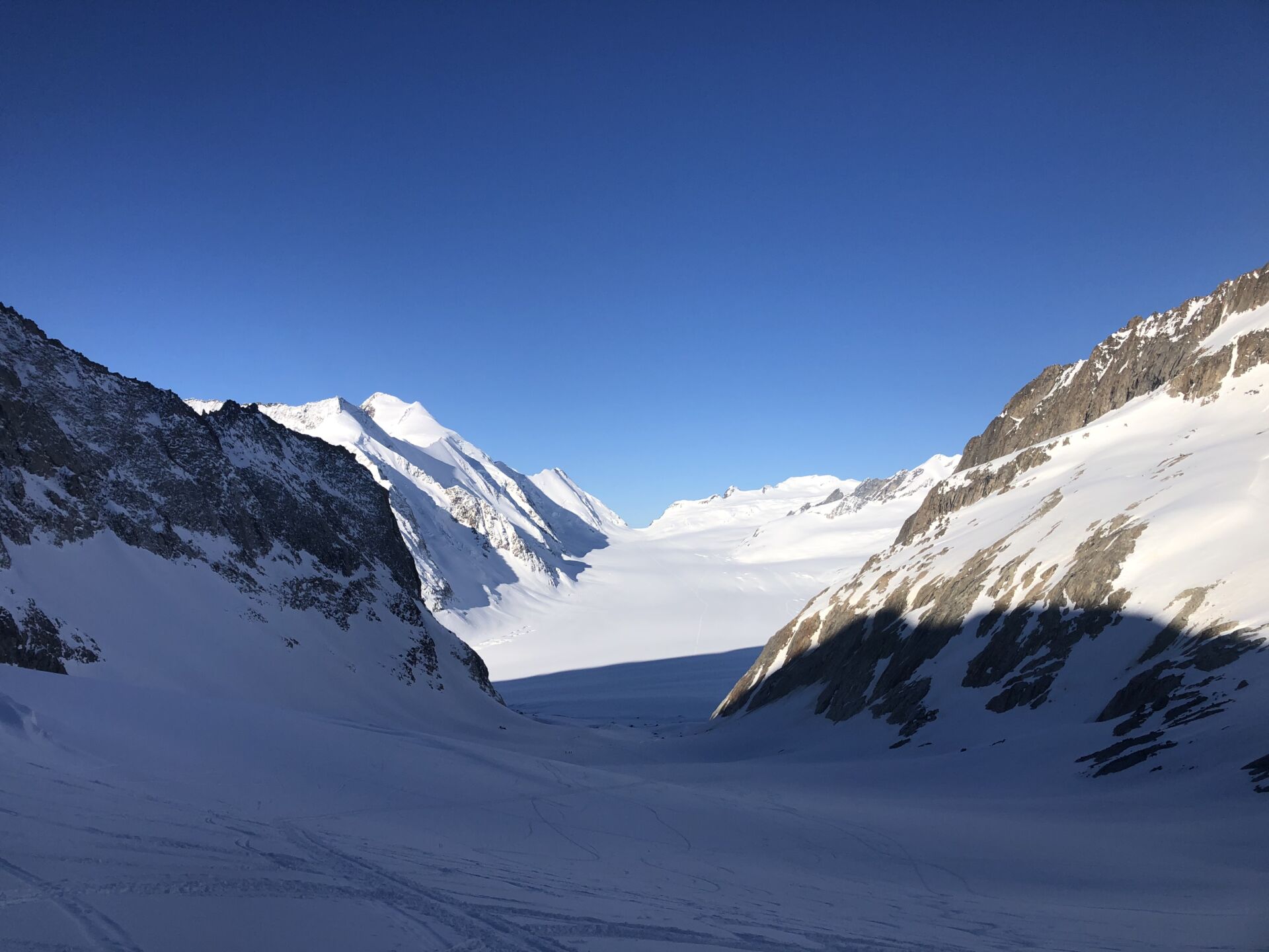 Der zweite, lange Tag unserer Gletschertrekkings durch die Berner Hochalpen führt zunächst vom Konkordiaplatz zur Grünhornlücke und um das majestätische Finsteraarhorn herum zur Oberaarjochhütte. Dort lädt uns ein unberührtes, weisses Laken zu einer begeisternden Abfahrt ein. Damit ist der Tag allerdings noch lange nicht zu Ende, der Aufstieg zur Triebteseelücke wird unerwartet zur kleinen Challenge.