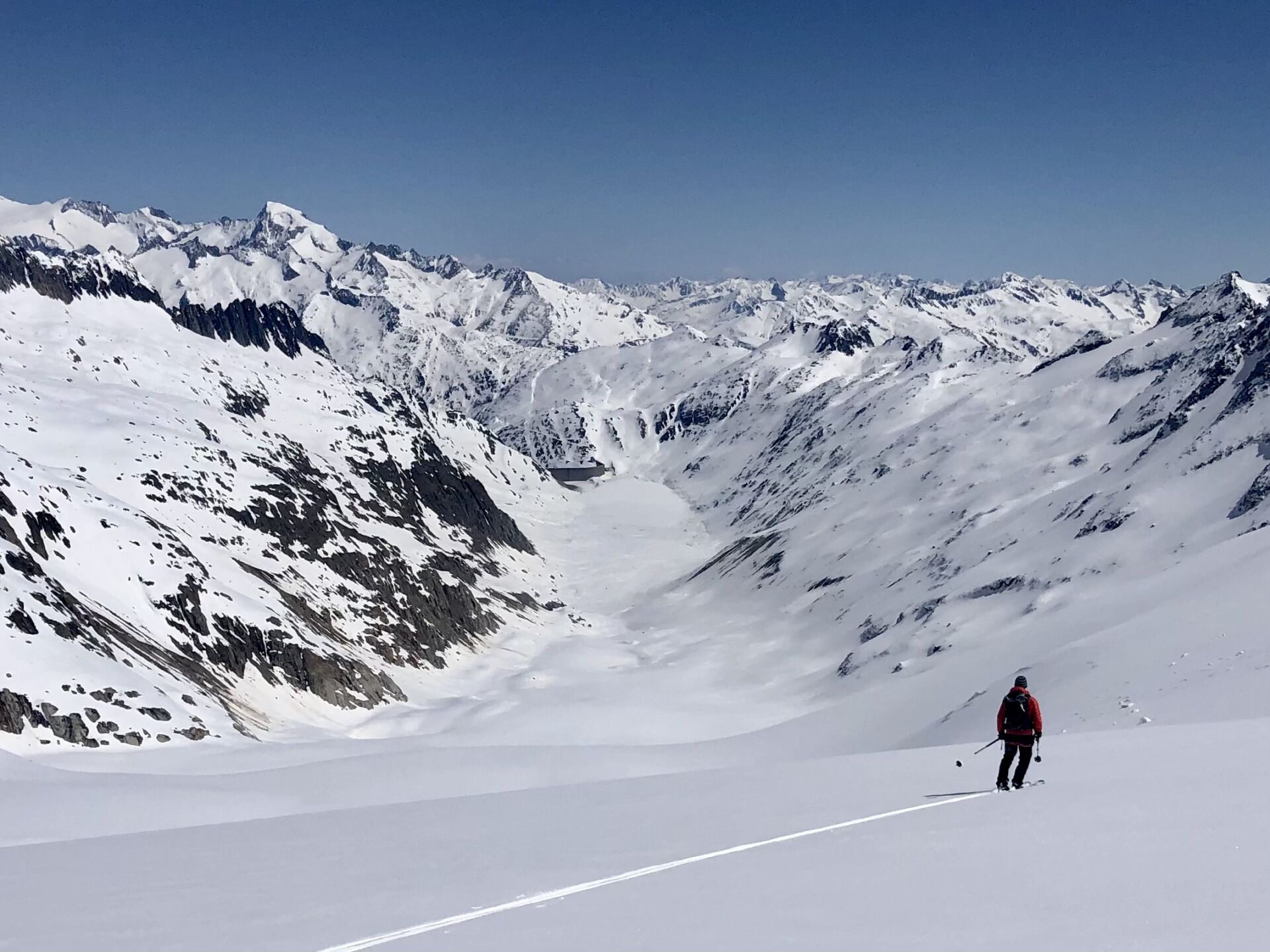 Mit vollen Mägen steigen wir zum Skidepot ab und schnappen uns jetzt das Filetstück (was Skifahren betrifft) des heutigen Tages. Der Oberaargletscher breitet sich, wie gerade mit frischen, weissen Laken bezogen, völlig unberührt vor uns aus. Diese Abfahrtsroute wird nur selten gewählt. Er hat nämlich ein Preisschild – und es gibt keinen Plan B. Wer die traumhaften, fast 1000 Höhenmeter über fünf Kilometer zum Stausee hinunterschwingt, muss nachher zuerst über Eisschollen zur Staumauer turnen (offenbar wird der See im Frühjahr abgelassen, um das Eis zu brechen) und dann wieder 400Hm hochsteigen. Aber eben – wer würde schon freiwillig auf dieses Fest (siehe Bild unten) verzichten?