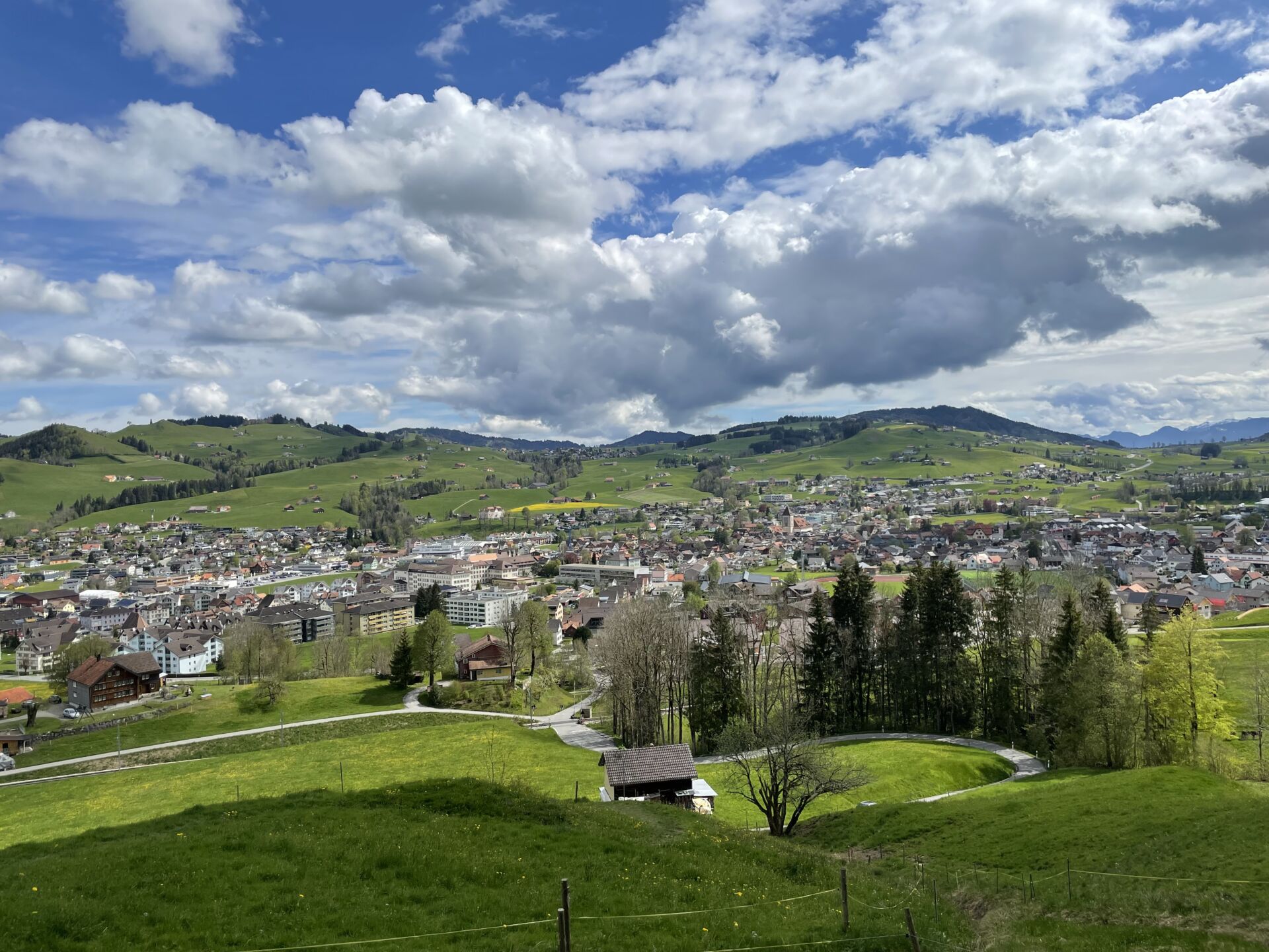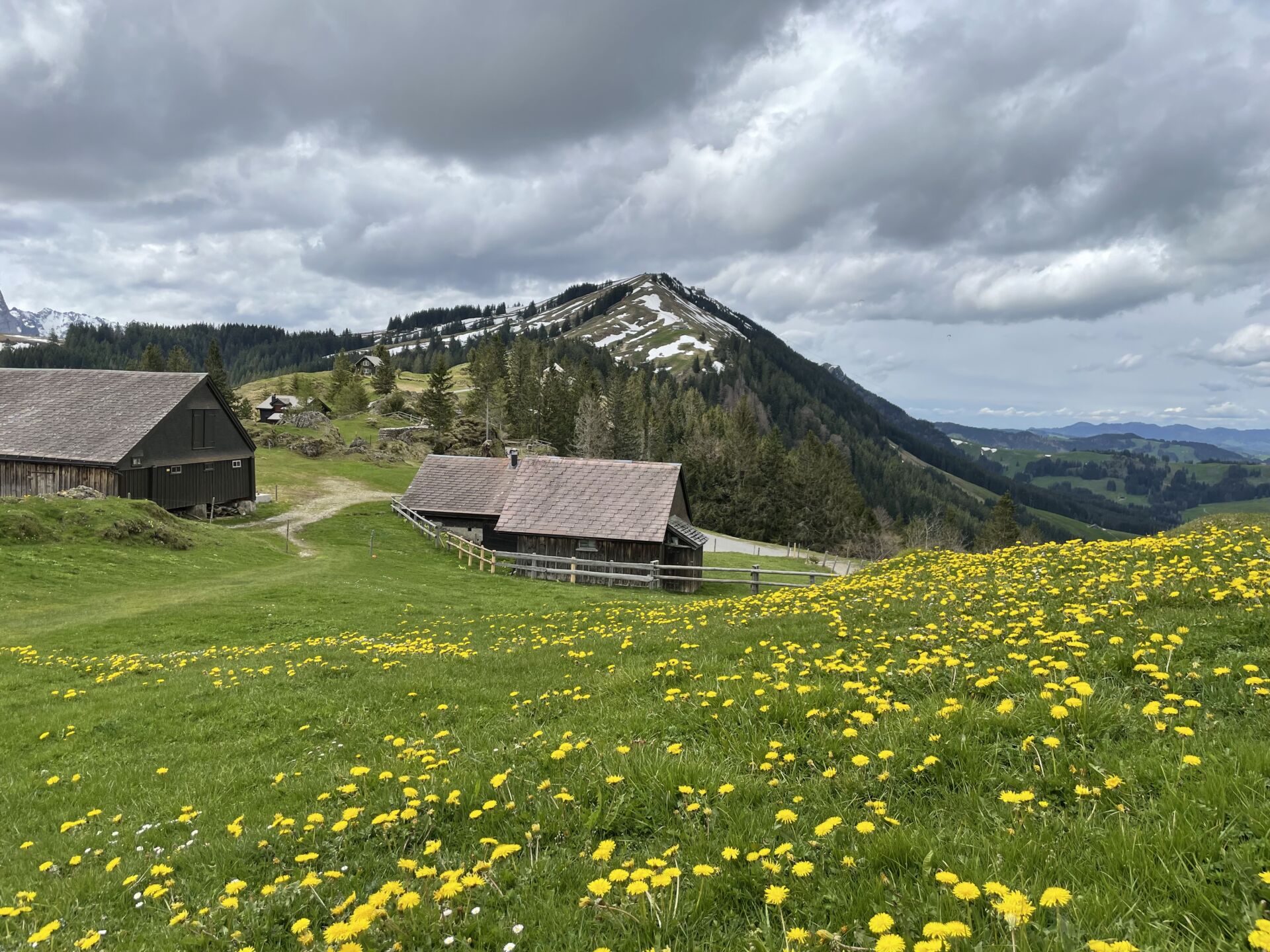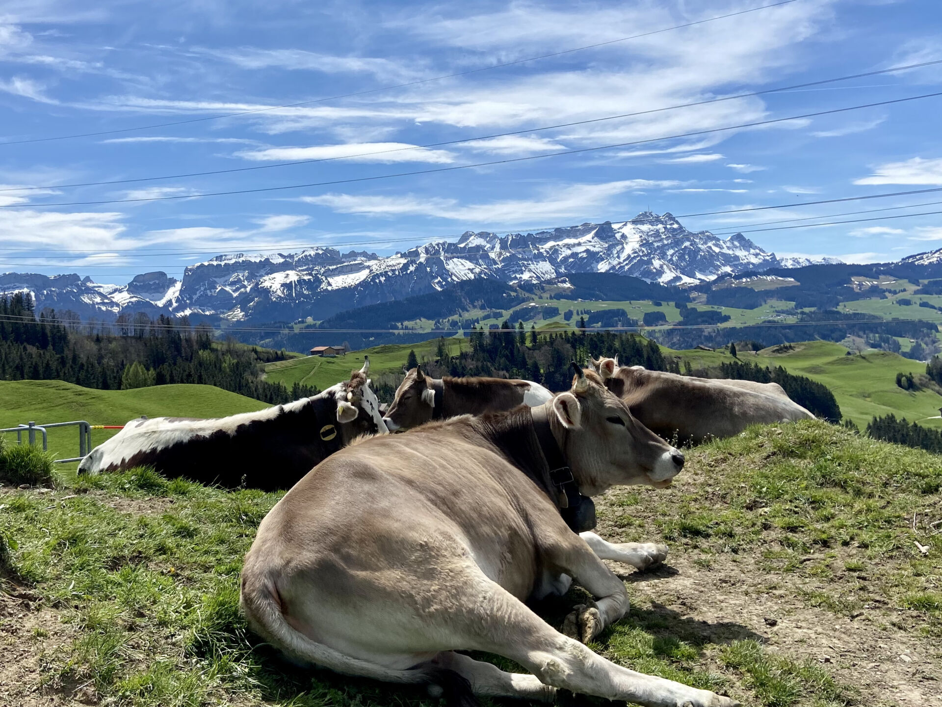Bald erreiche ich die Höhen der Hügelkette, der Blick auf den noch sehr weissen Säntis wird frei. Nach ein paar weiteren Kurven und Wiesen stehe ich hoch über Appenzell in Egg (Pt. 1022), ein grossartiger Panoramaplatz. Die weite „grüne Pfanne“ rund um das Städtchen, das sich so stark unterscheidet von der „Eierschachtel“ des Ausserrhodischen. Es sieht malerisch aus, die verstreuten Bauernhöfe, das saftige Gras, die Kühe und die Ziegen. Und dahinter dieser einzigartige Alpstein, den man von Appenzell aus allerdings nicht sieht. Ein guter Ort, um mit den drei Kameras meines neuen iPhones zu experimentieren. Coole Sache!