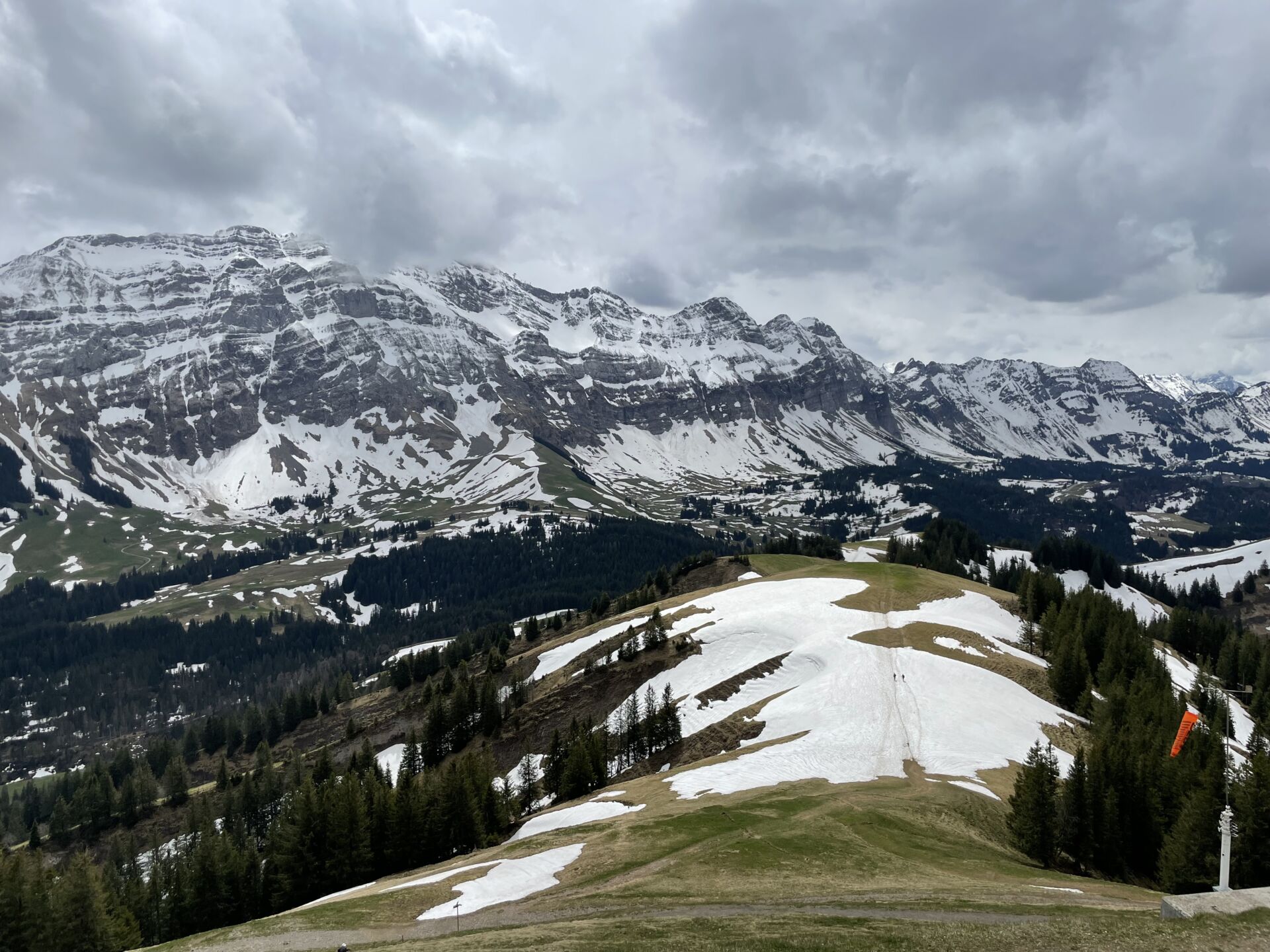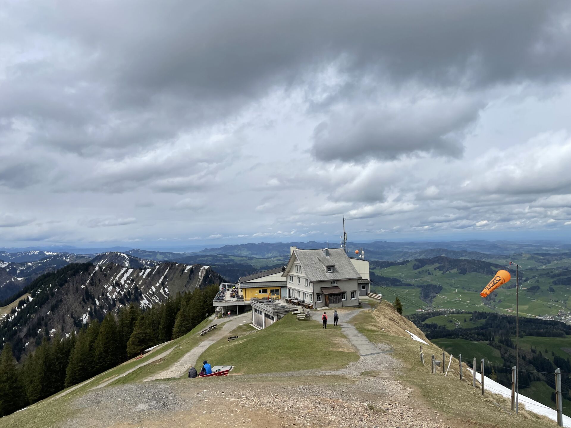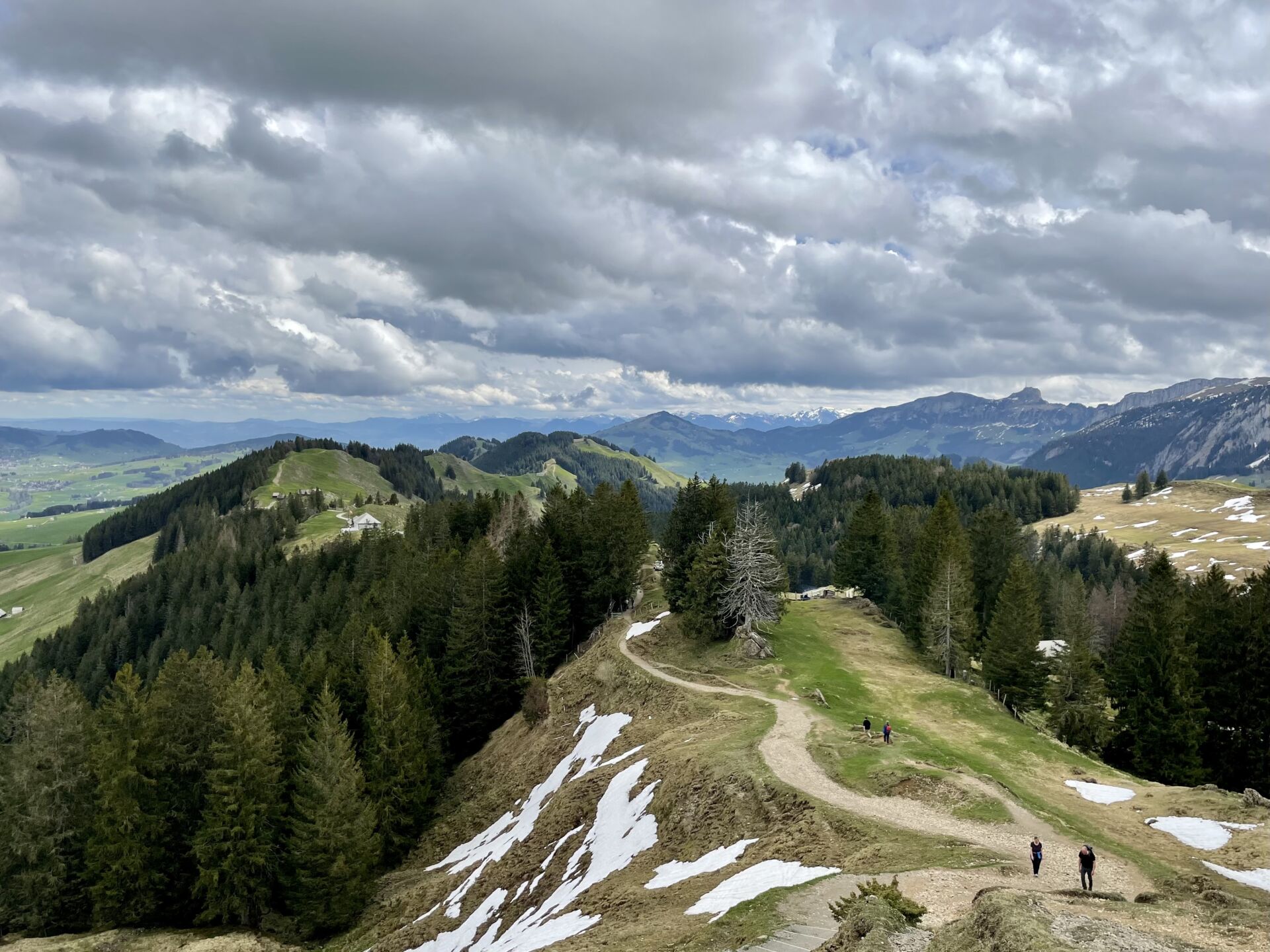 Nach der Alpwirtschaft Scheidegg wird es steiler. Der wenige Restschnee ist allerdings kein Hindernis, so reiche ich meiner Schwester gut zwei Stunden nach dem Abmarsch aus Appenzell auf dem Kronberg die Hand. Wir machen es uns auf der bedienten Terrasse gemütlich, ein dickes Schaffell im Rücken hilft gegen den kälter gewordenen Wind. Ich verknurre Pauline dazu, mit mir Chäshörnli mit Siedwurst zu teilen, die hier oben wirklich sehr fein sind, aber für einen alleine kaum zu schaffen sind.