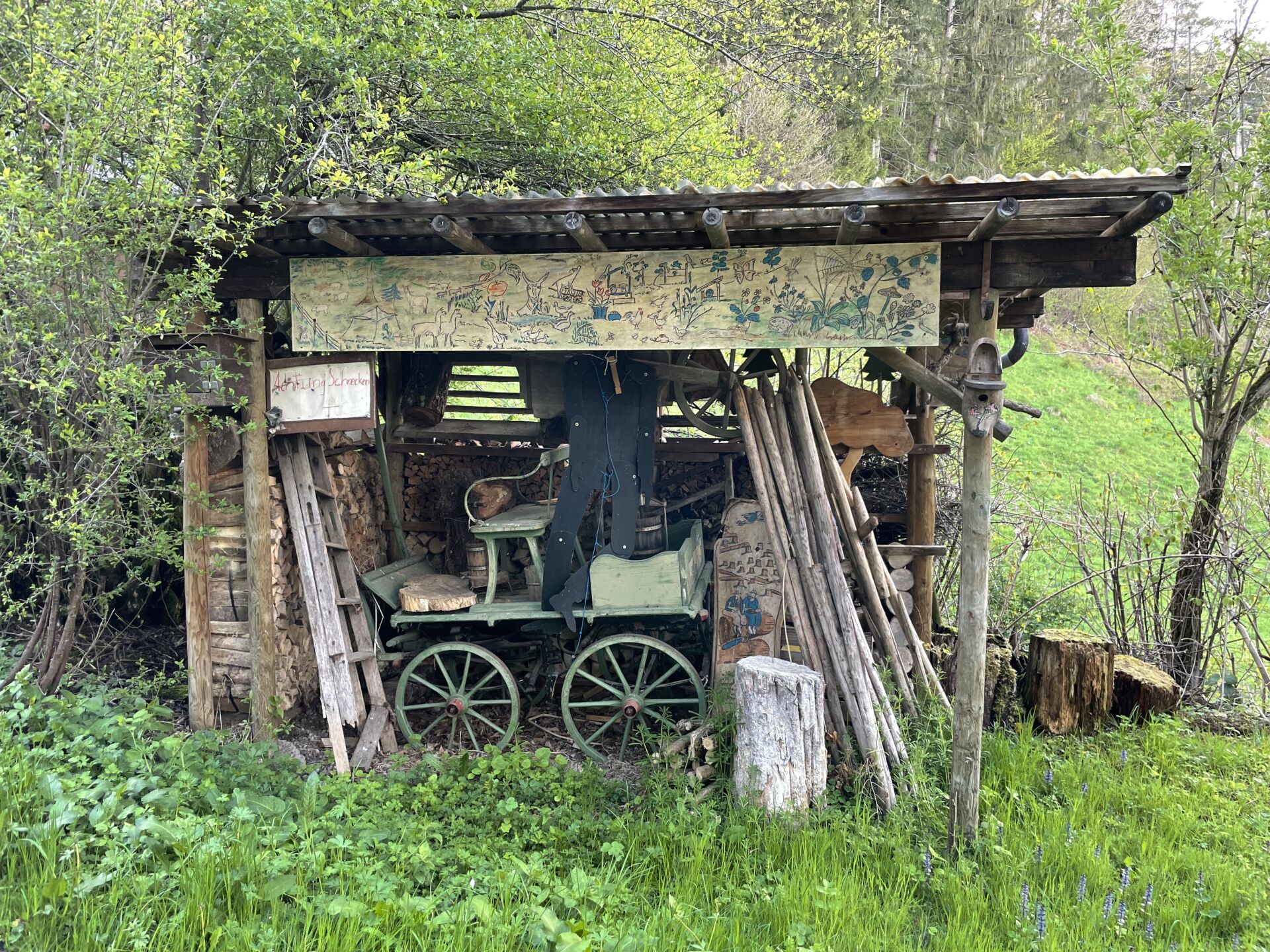 Ich entsteige dem roten Zügli der Appenzellerbahnen in Bühler und suche die Wegweiser mit der grün-weissen „3“. Sie führen rasch steigend aus dem engen Rotbachtal hinaus auf die Anhöhen des Gehrenbergs, das Appenzell Innerrhoden gegen Norden abgrenzt. Ich lasse die Maschine gleich etwas hochtourig laufen, um zu testen, ob mein glimpflich verlaufener Ausflug in die Corona-Welt Spuren hinterlassen hat. Zum Glück nicht. Nur beim Durchschreiten eines Schrebergarten-ähnlichen Waldstücks mit allerlei skurrilen Kunstgegenständen (Säulen, Skulpturen und vieles mehr) halte ich kurz inne, um ein paar Fotos zu machen.
