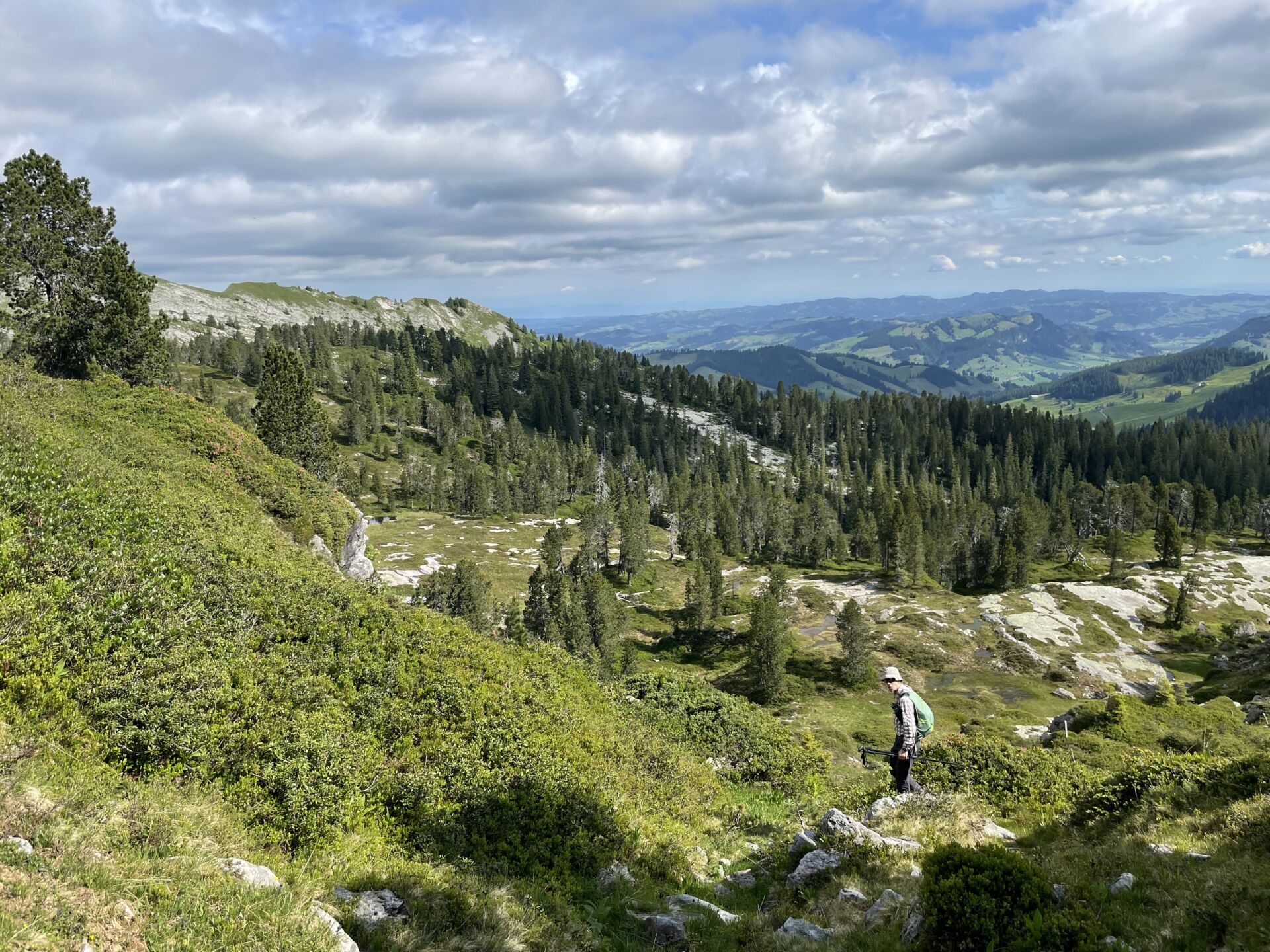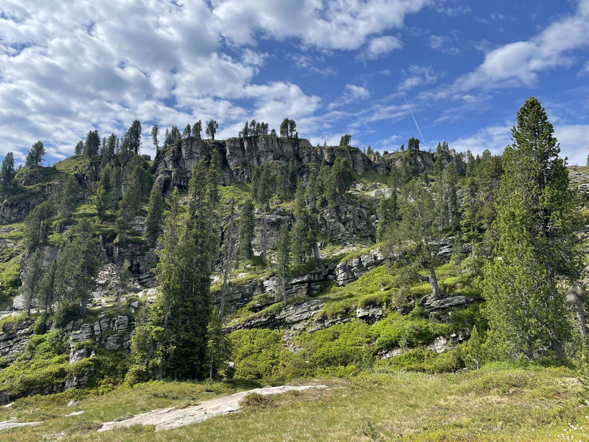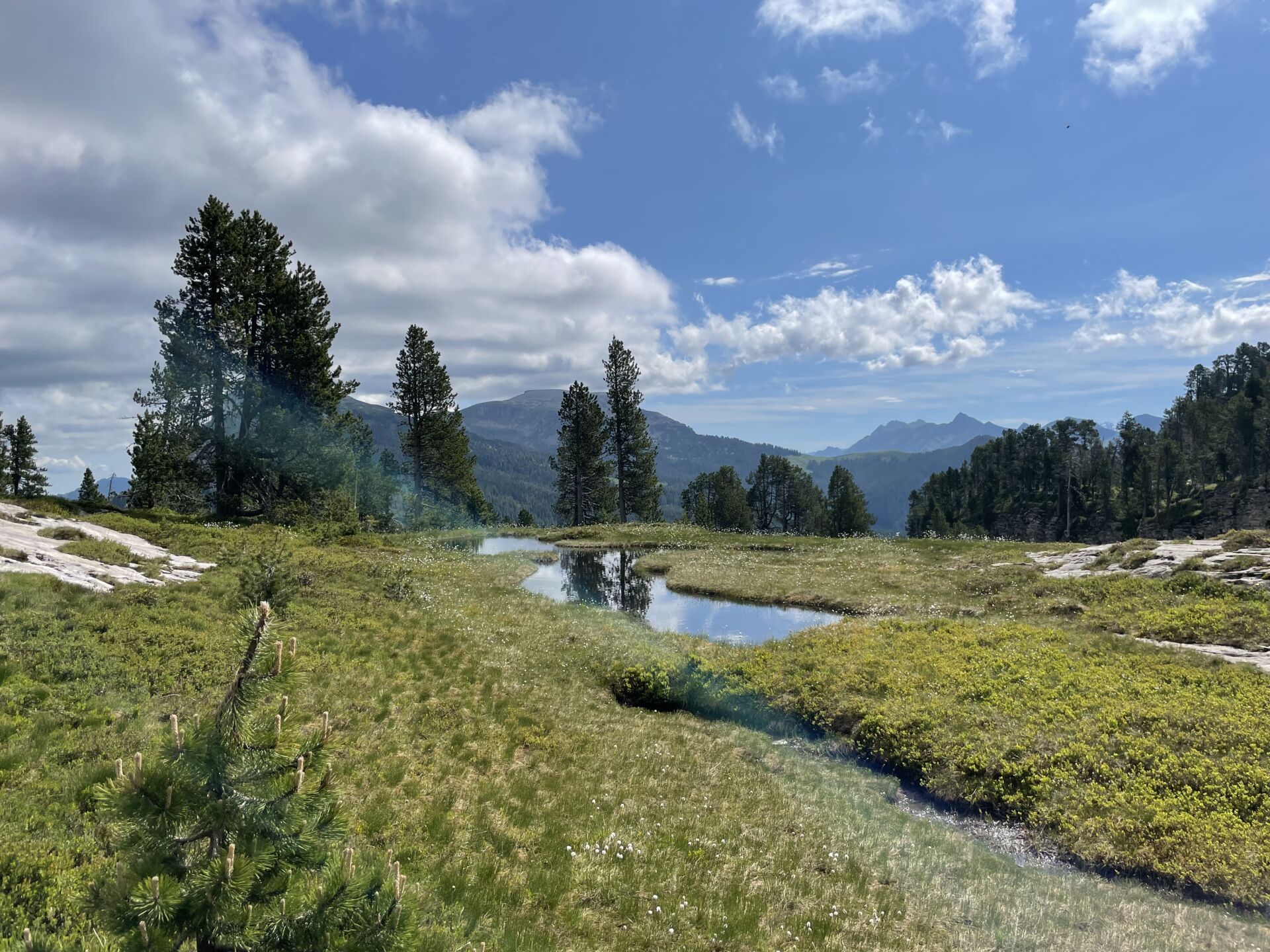Die blumenstrotzenden Weiden werden nun von intensiv duftenden Nadelbäumen abgelöst. Wir streifen durch den Wald und erreichen bald die Chromatta, eine flache Alp, die wohl einst aus einem verlandeten See entstanden ist. Es folgt eine etwas steilere Rampe, die uns auf das Seefeld führt. So wird das ganze Gebiet genannt, das sich vor den Karrenfelder unterhalb der Sibe Hängste ausbreitet. Es ist ein Traum: Wir wähnen uns in der Taiga: offener Wald, moorige Böden, coupiertes Gelände. Ein markierter Weg führt uns noch bis zum Tropfloch hoch, ein unscheinbarer Zugang zu einem neun Kilometer langen Höhlensystem, das hier oben seinen Anfang nimmt.