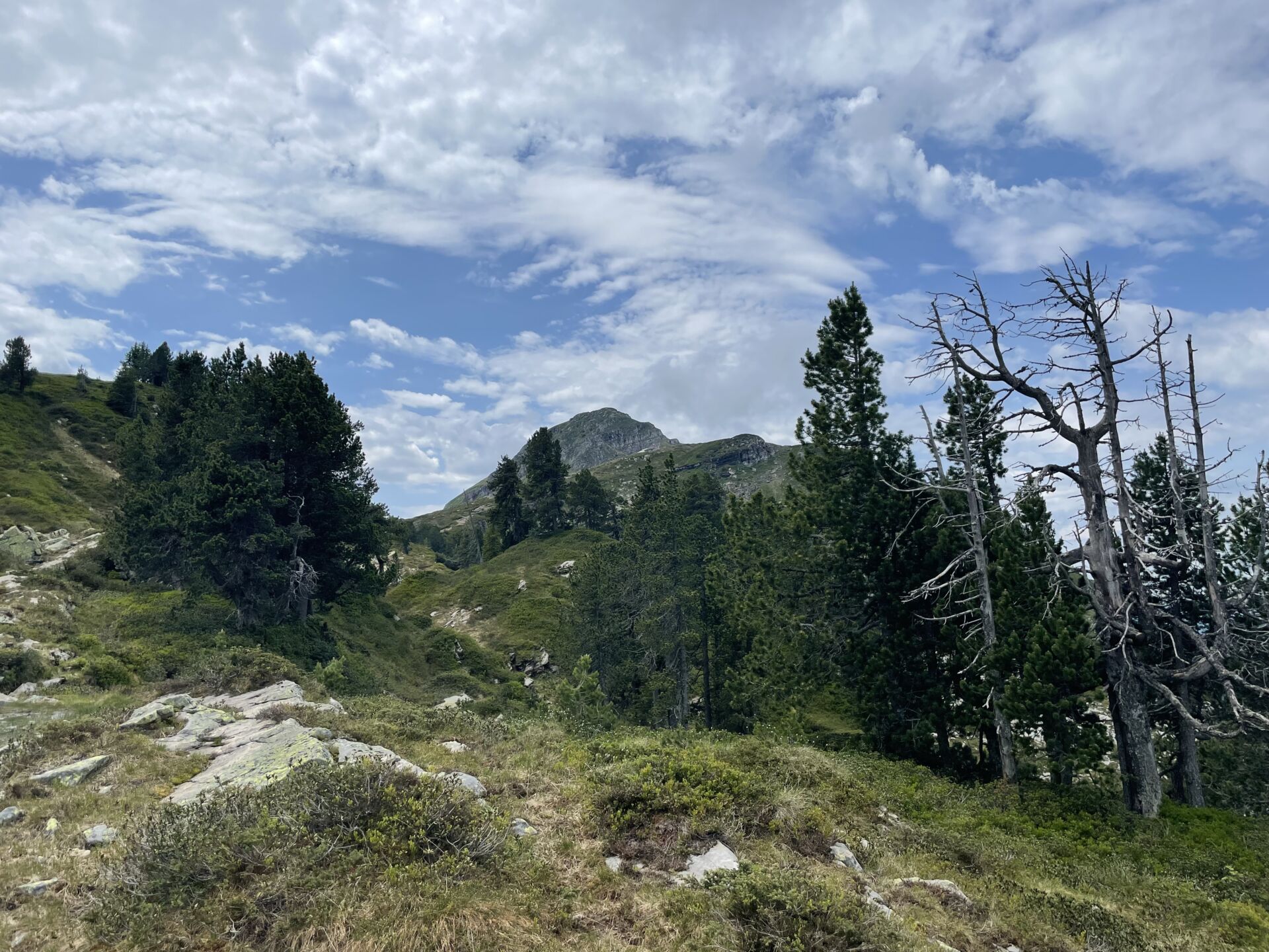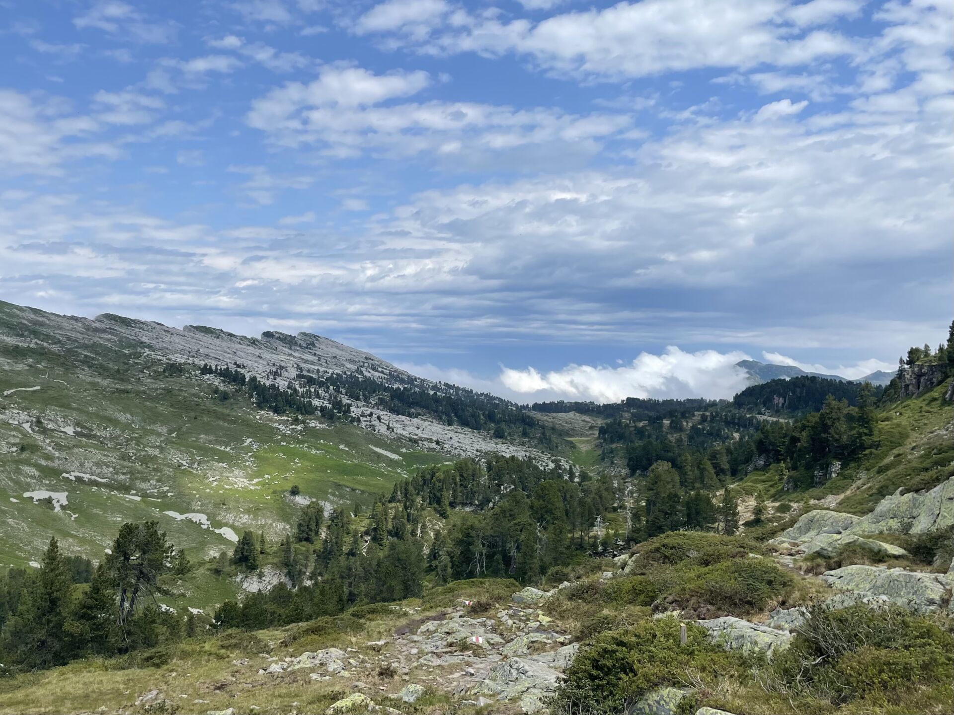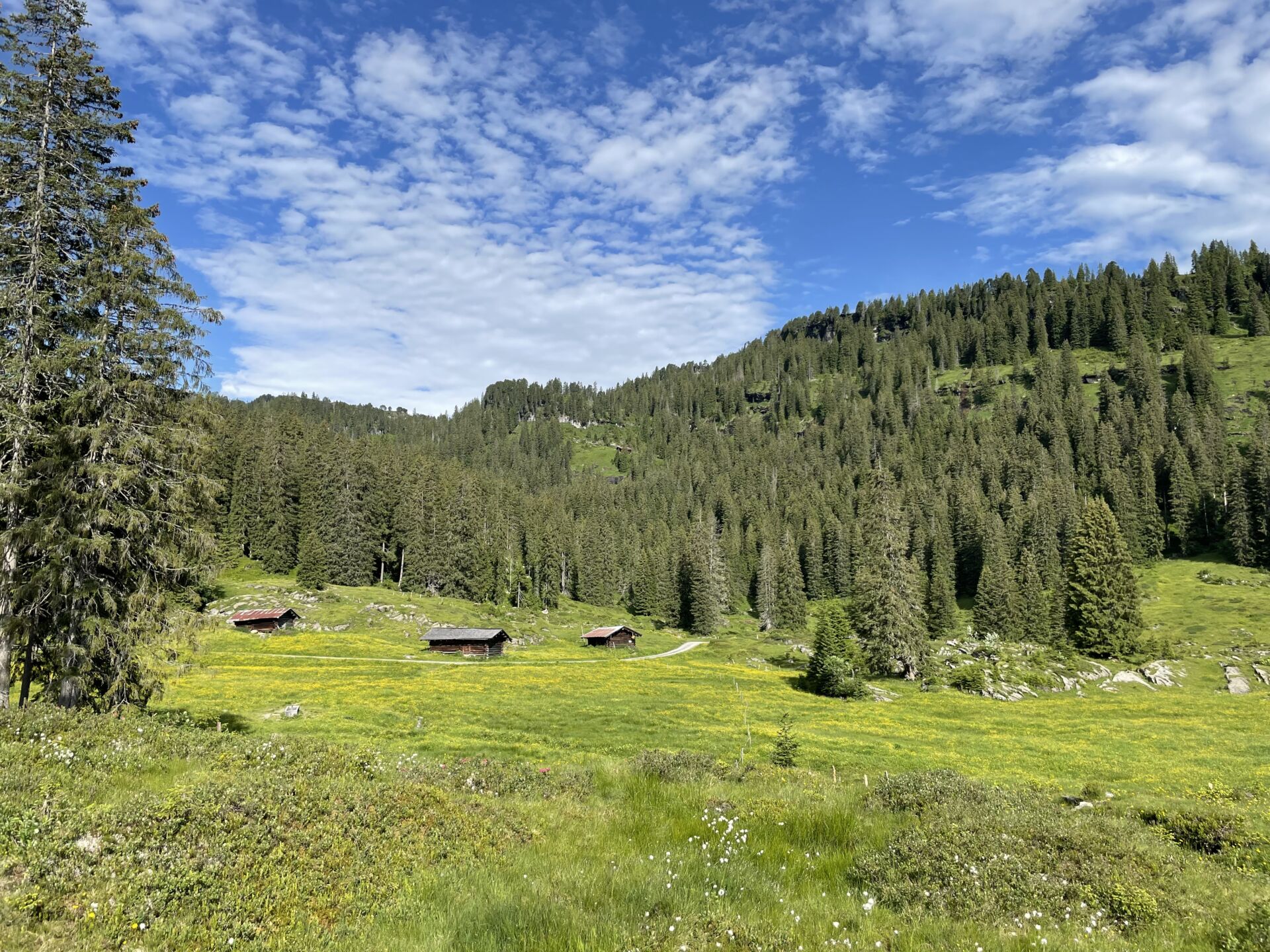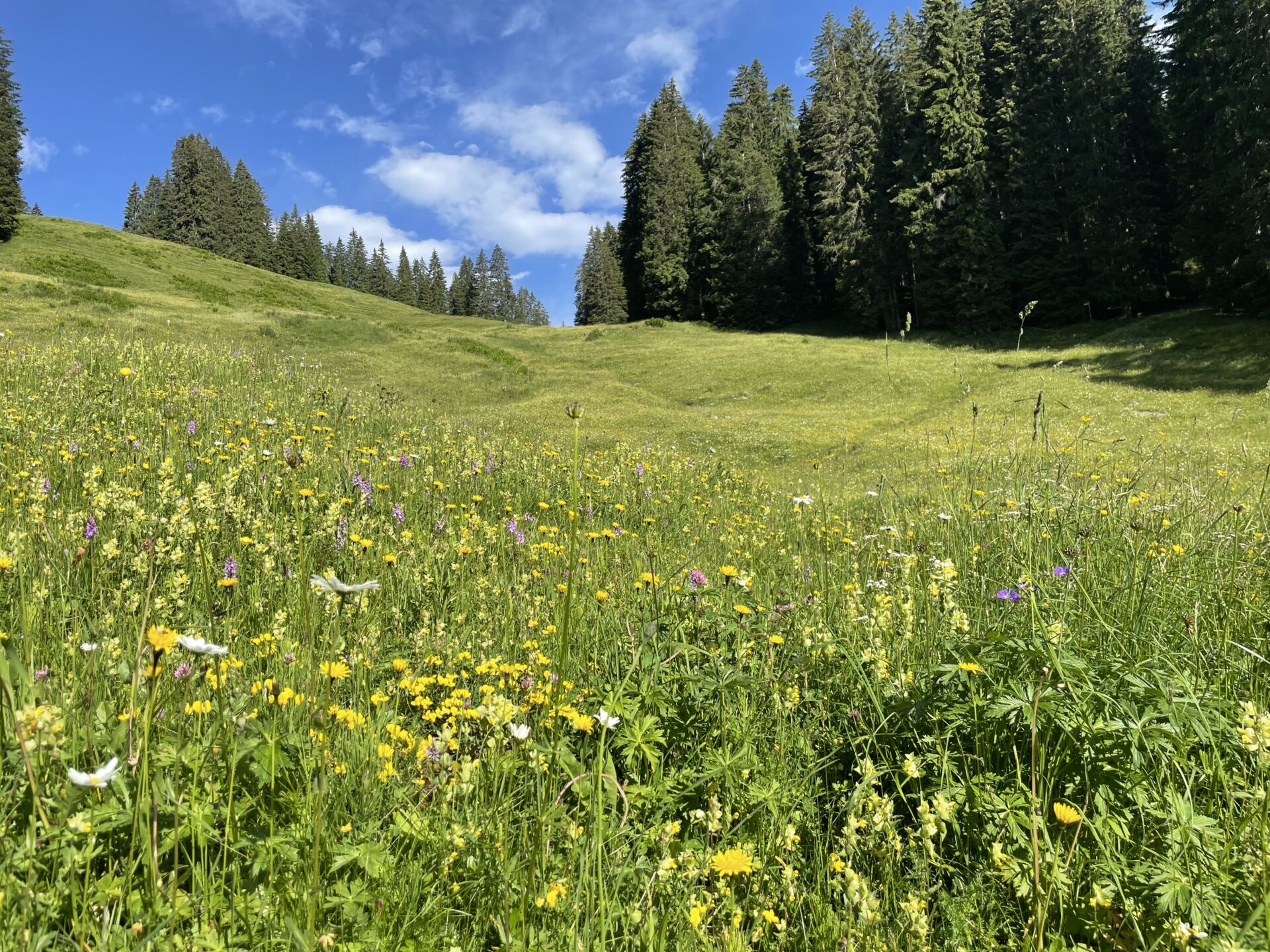 Die blumenstrotzenden Weiden werden nun von intensiv duftenden Nadelbäumen abgelöst. Wir streifen durch den Wald und erreichen bald die Chromatta, eine flache Alp, die wohl einst aus einem verlandeten See entstanden ist. Es folgt eine etwas steilere Rampe, die uns auf das Seefeld führt. So wird das ganze Gebiet genannt, das sich vor den Karrenfelder unterhalb der Sibe Hängste ausbreitet. Es ist ein Traum: Wir wähnen uns in der Taiga: offener Wald, moorige Böden, coupiertes Gelände. Ein markierter Weg führt uns noch bis zum Tropfloch hoch, ein unscheinbarer Zugang zu einem neun Kilometer langen Höhlensystem, das hier oben seinen Anfang nimmt.