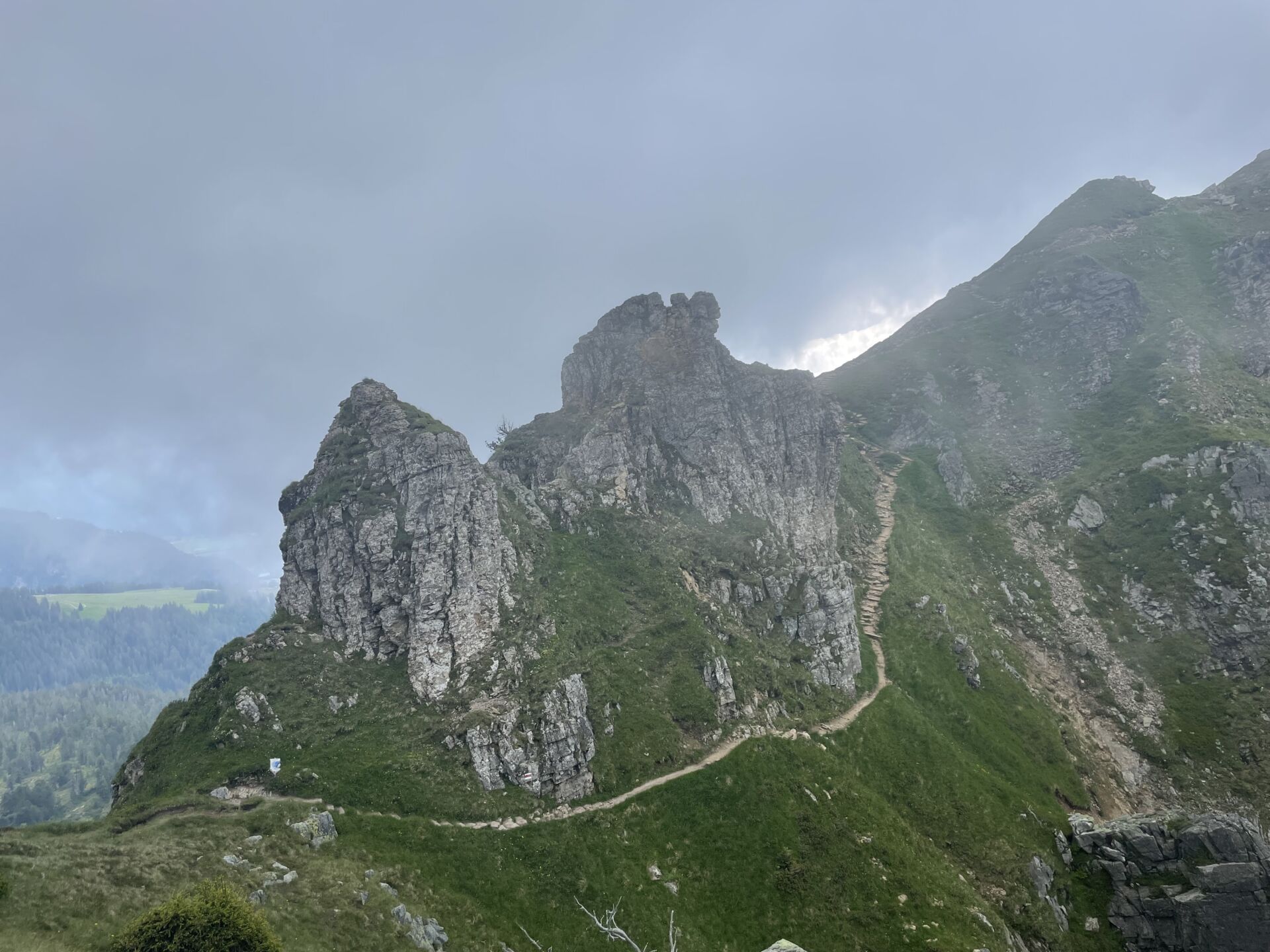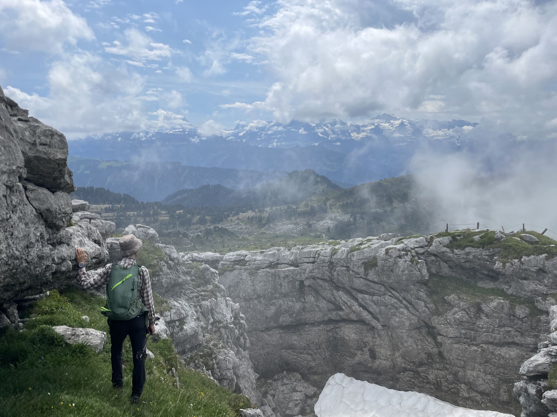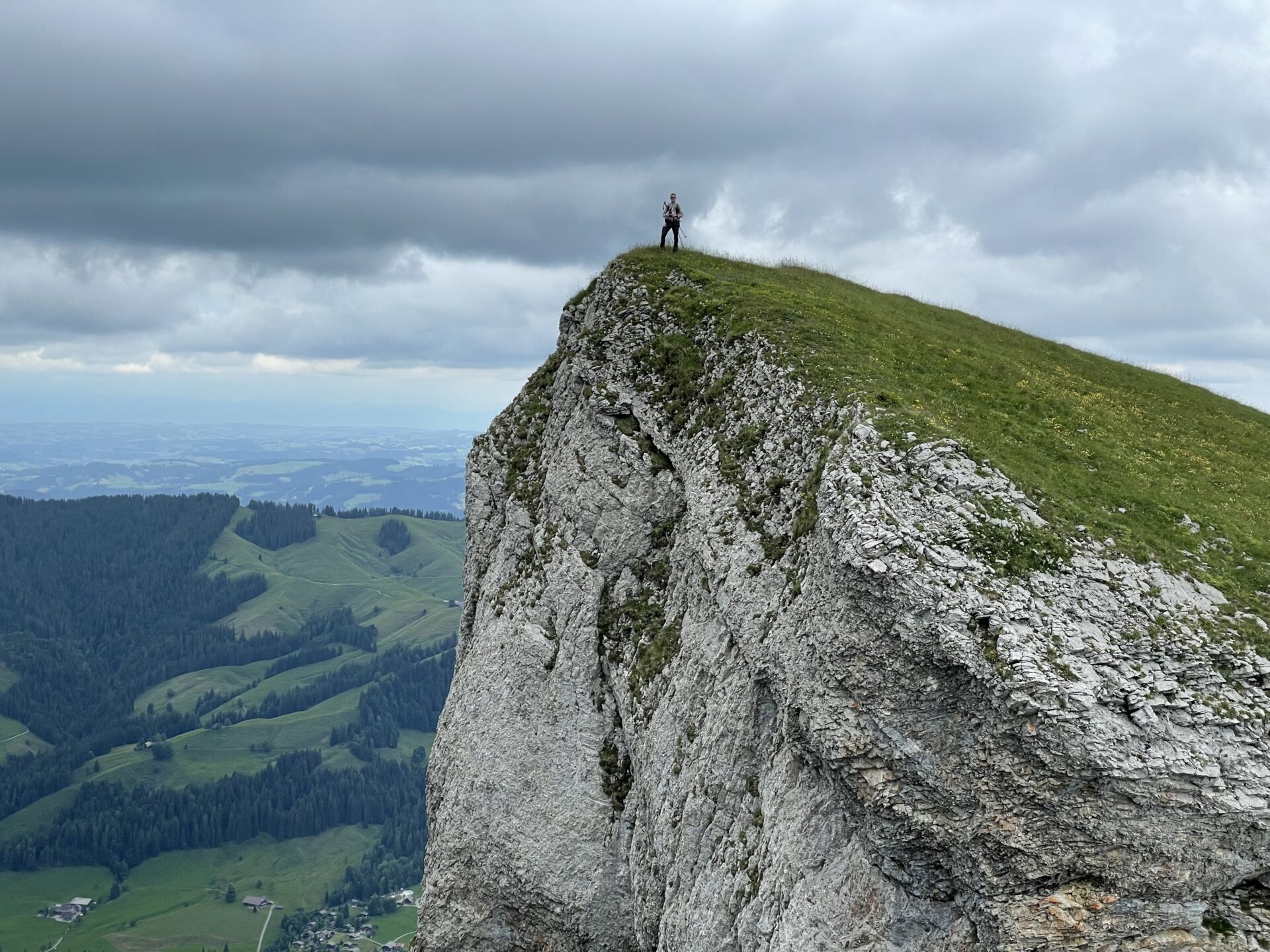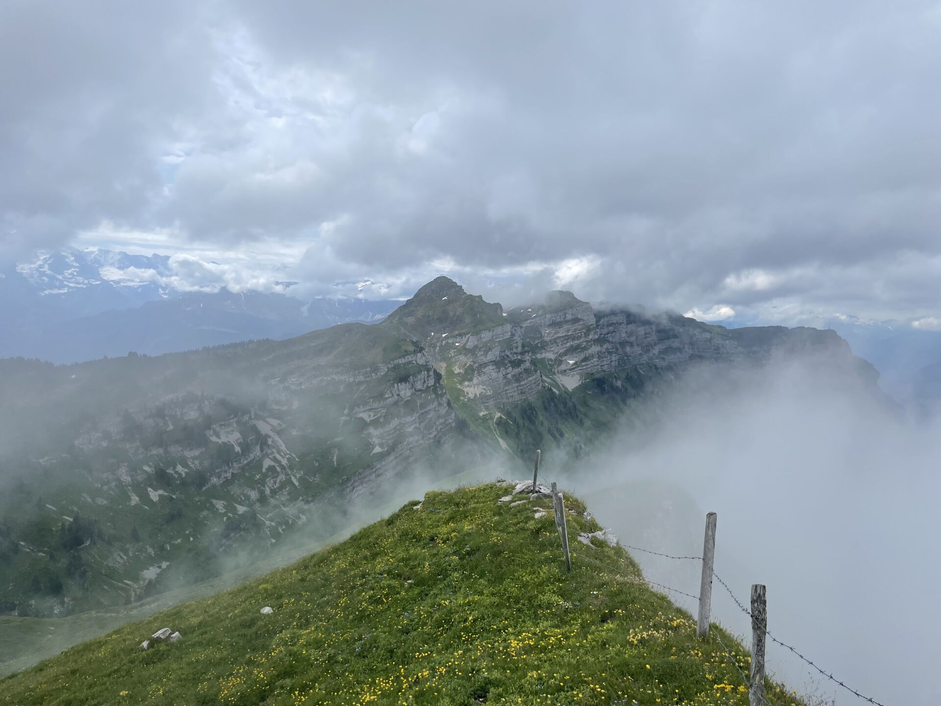 Zügig folgen wir dem Gratweg, zuerst hinunter, dann über den Burgfeldstand wieder hinauf. Nicht ohne die Gegend zu geniessen, aber mit Respekt ins Simmental schauend, von wo aus sich gewaltige Wolkentürme in Richtung Thunersee bewegen. Schon hüllen uns die ersten Wolkenfetzen wieder ein, und böiger Wind zieht auf.