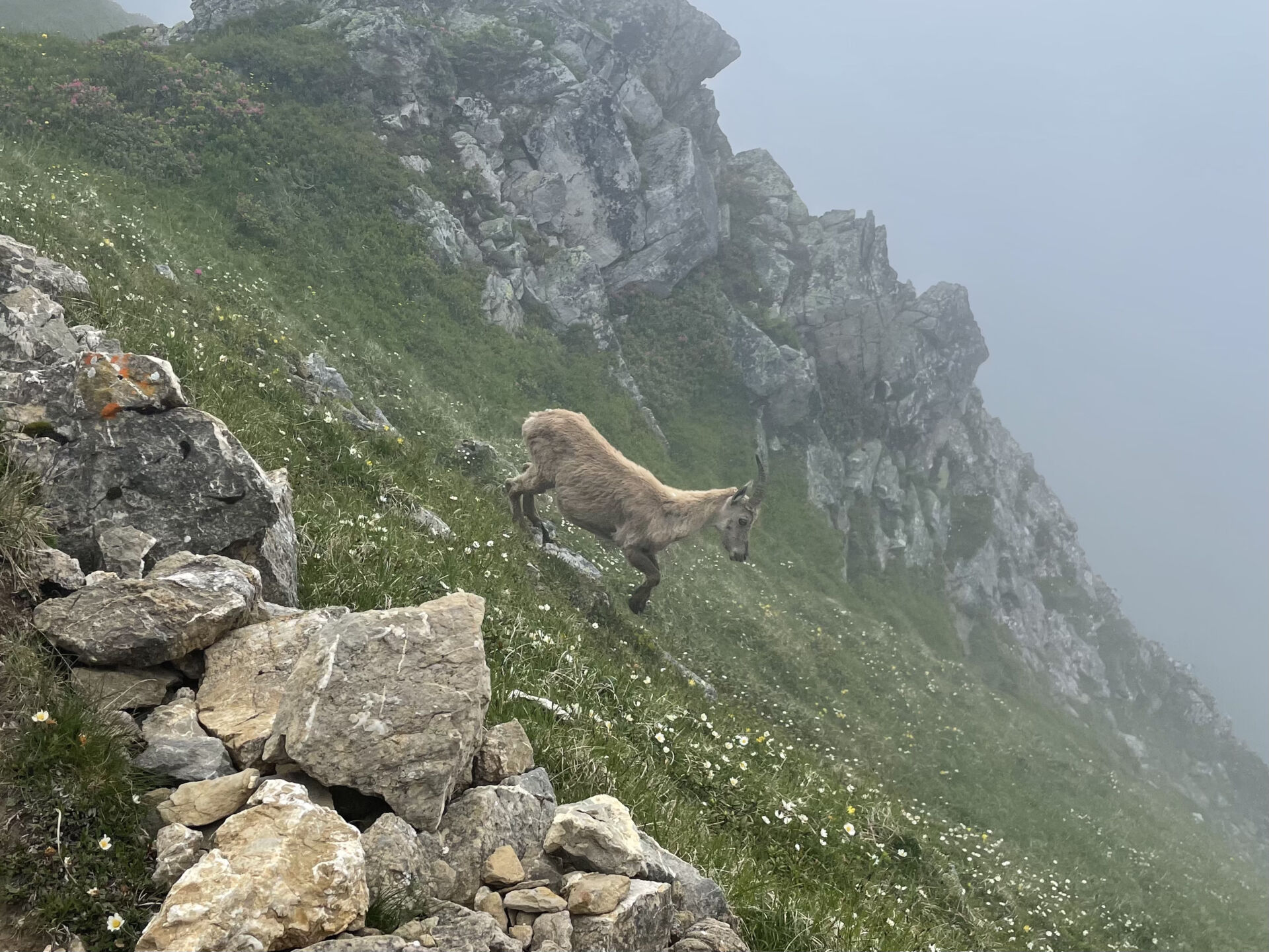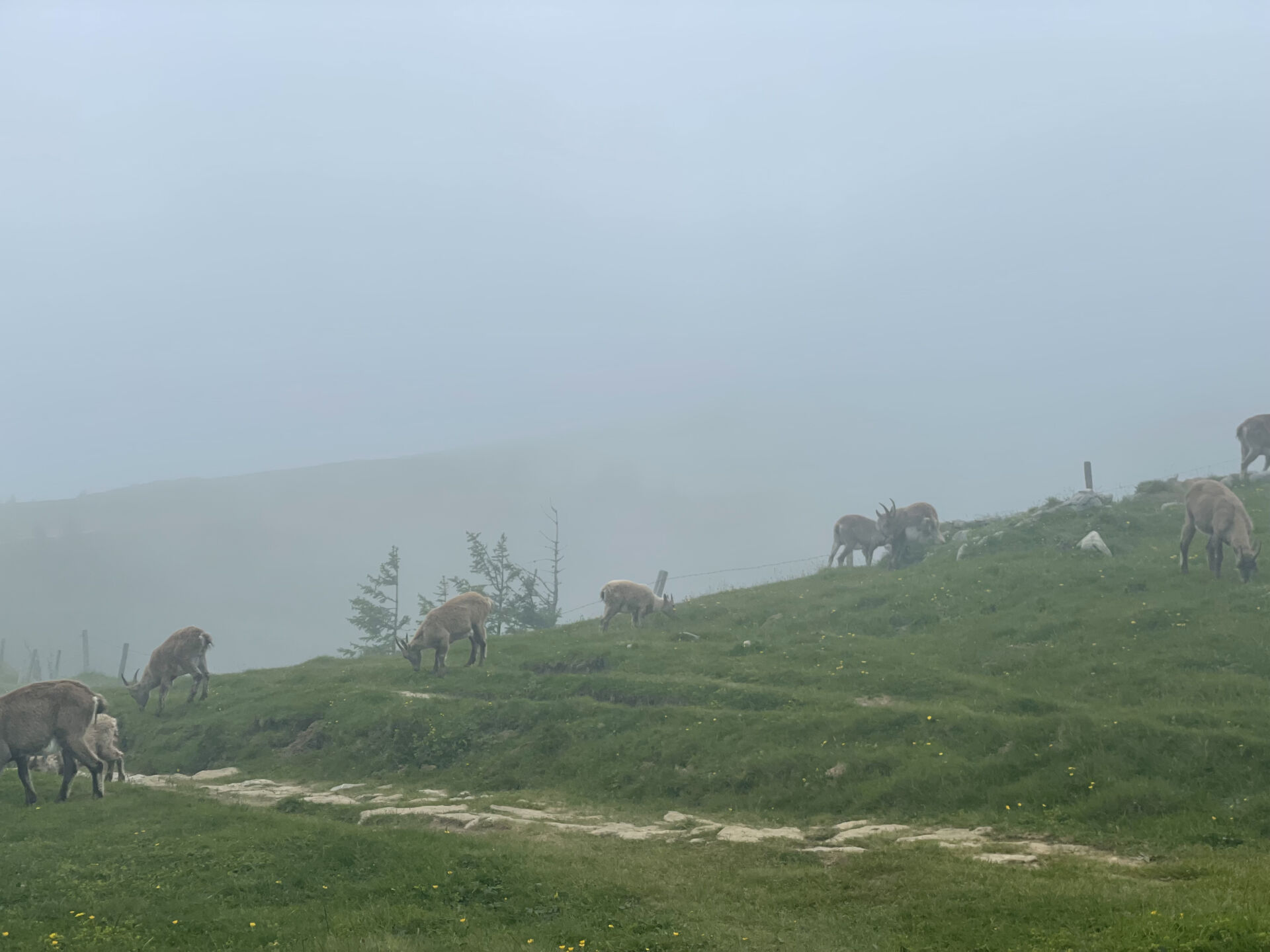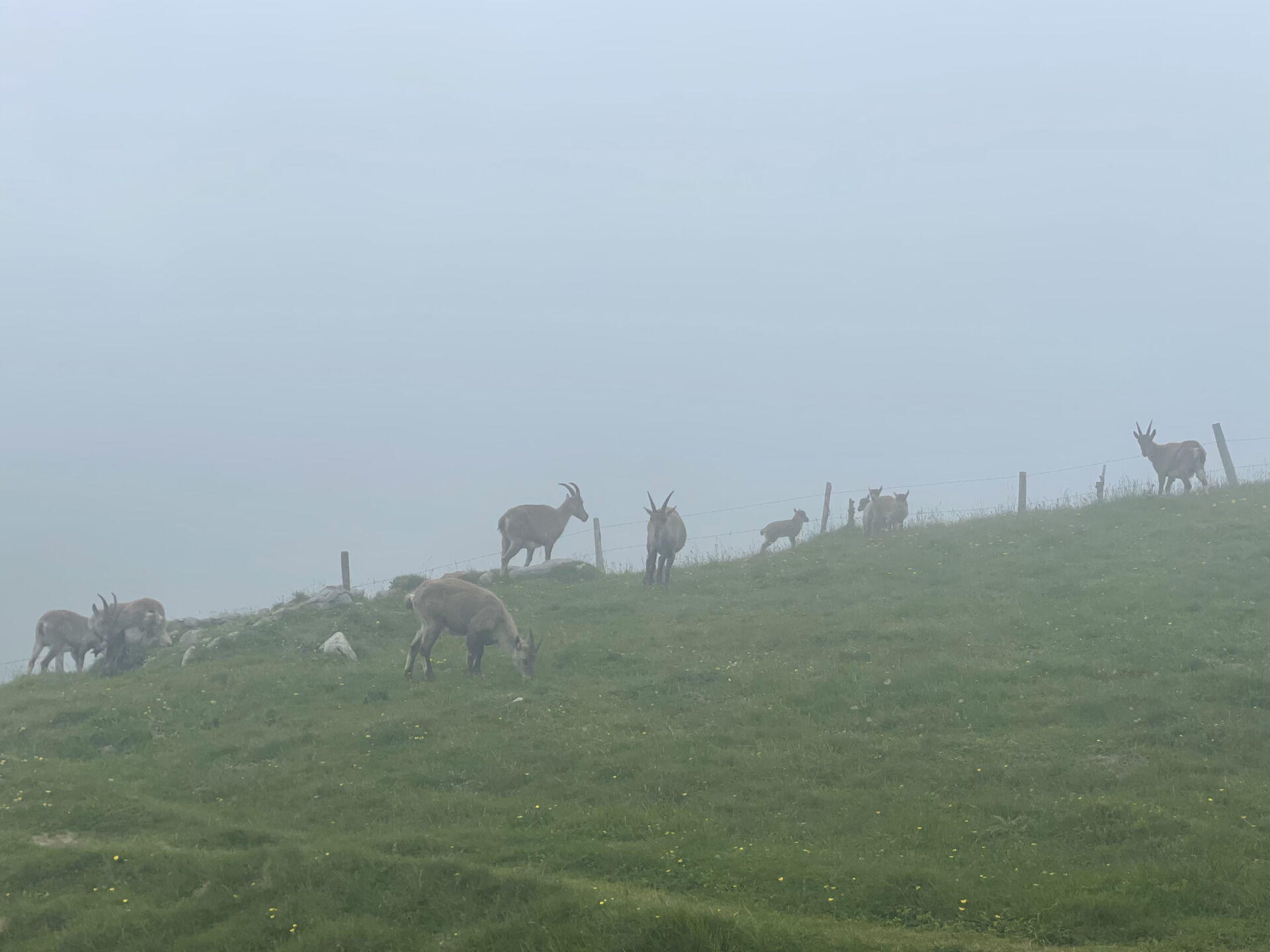 Natürlich halten wir noch kurz ein, um die grosse Steinbockkolonie mit den vielen Jungtieren abzulichten – doch dann joggen wir. Es stürmt, es tropft. Die Front erwischt uns wenige Meter vor dem Berghotel auf dem Niederhorn. Kaum sind wir drinnen, prassen die Wassermassen wolkenbruchartig herunter.