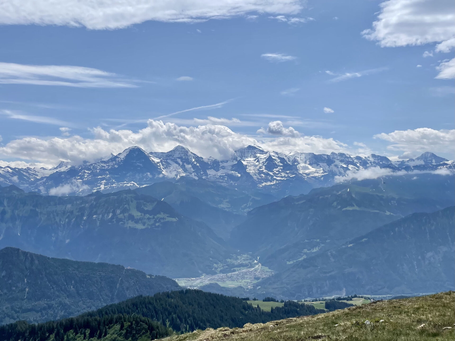 In Habkern erahnt man noch nichts von diesem Meisterwerk der Natur, das wir heute entdecken. Unser Weg führt zunächst über Wiesen zum Waldrand oberhalb des Dorfes, dahinter erkennt man noch nichts. Sobald wir etwas Höhe erreichen, strecken hingegen in unserem Rücken Eiger, Mönch und Jungfrau ihre Köpfe hinter dem Brienzergrat hervor. Eine Augenweide, jedes Mal wieder.