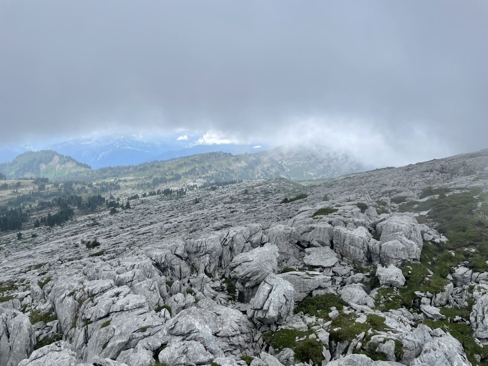 Kurz nach dem Tropfloch endet der Pfad. Das Gelände lässt sich jedoch ziemlich problemlos durchschreiten, nur vor Löchern und Karrenspalten muss man auf der Hut sein. Vergnügt suchen wir uns im Auf und Ab einen Weg zum Fuss des Hengsten-Grats, dort steigen wir durch ein Geröllfeld zum östlichsten, namenlosen Gipfelchen (Pt. 1828) auf. Doch nicht ohne immer wieder anzuhalten, um noch mehr Fotos zu machen. Eigentlich würde man hier Feen und Kobolde erwarten.