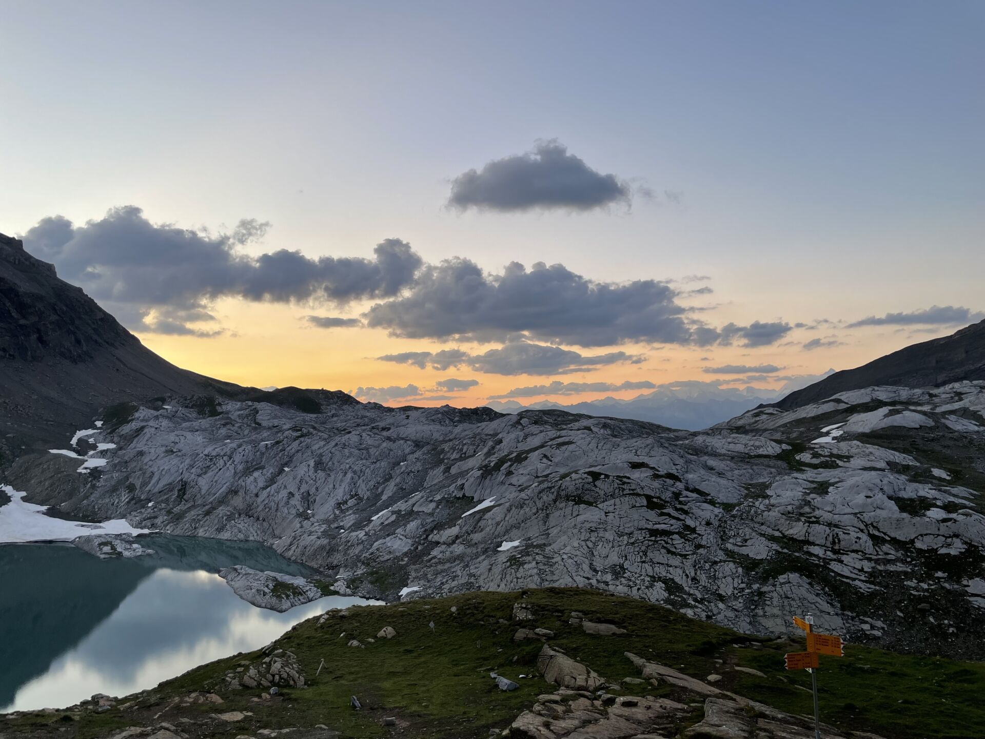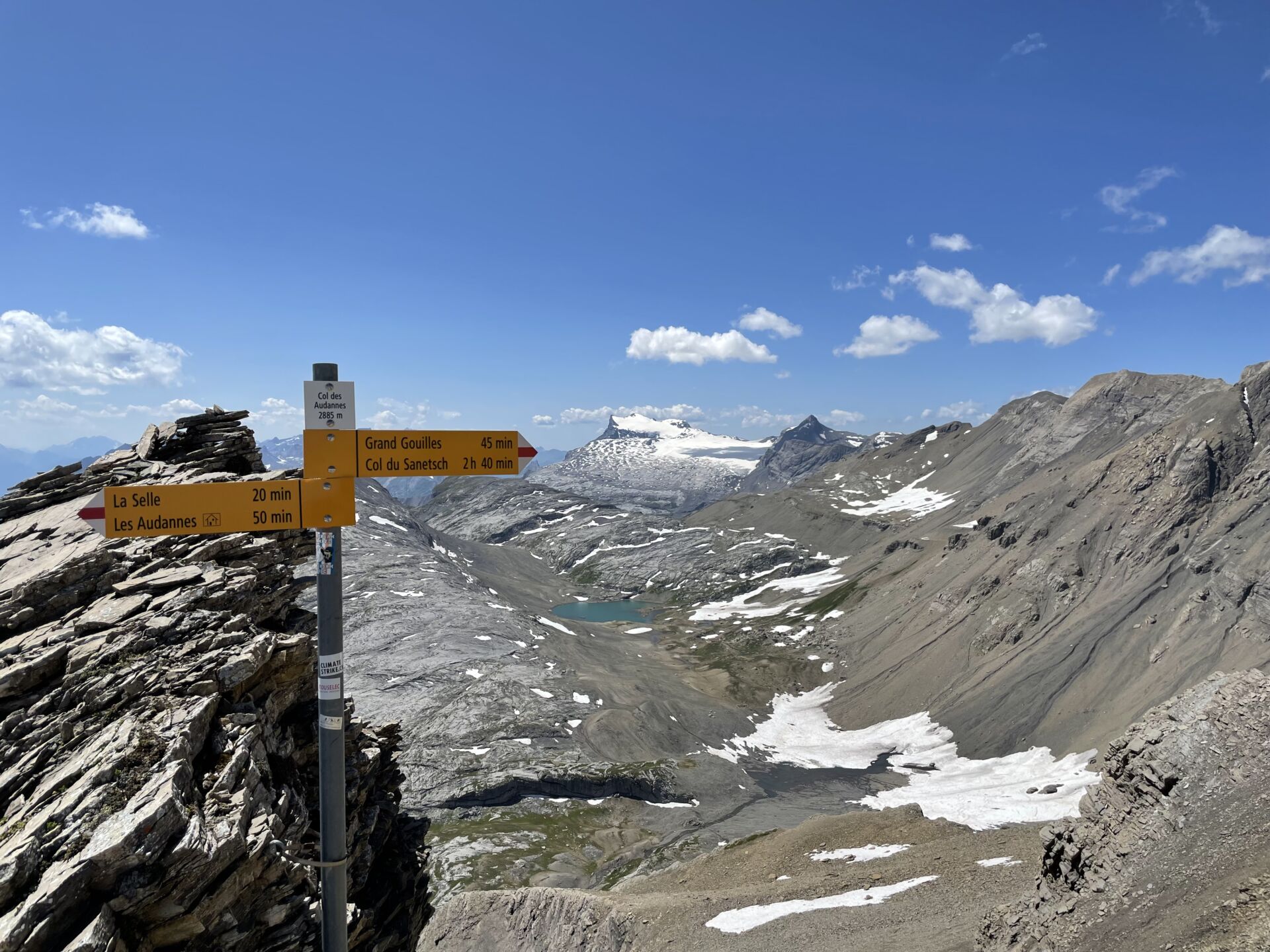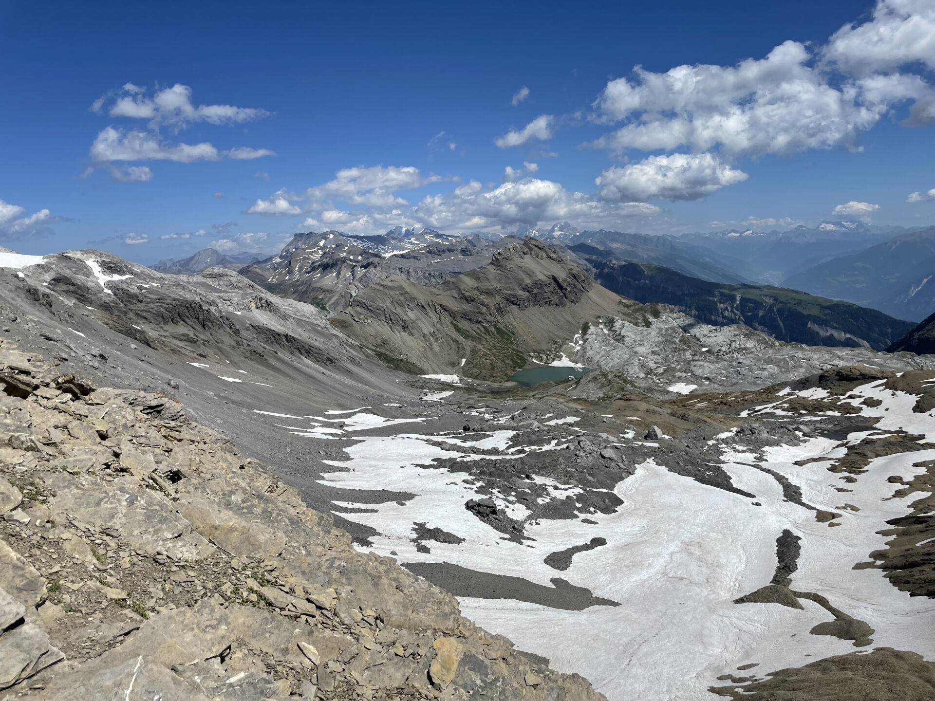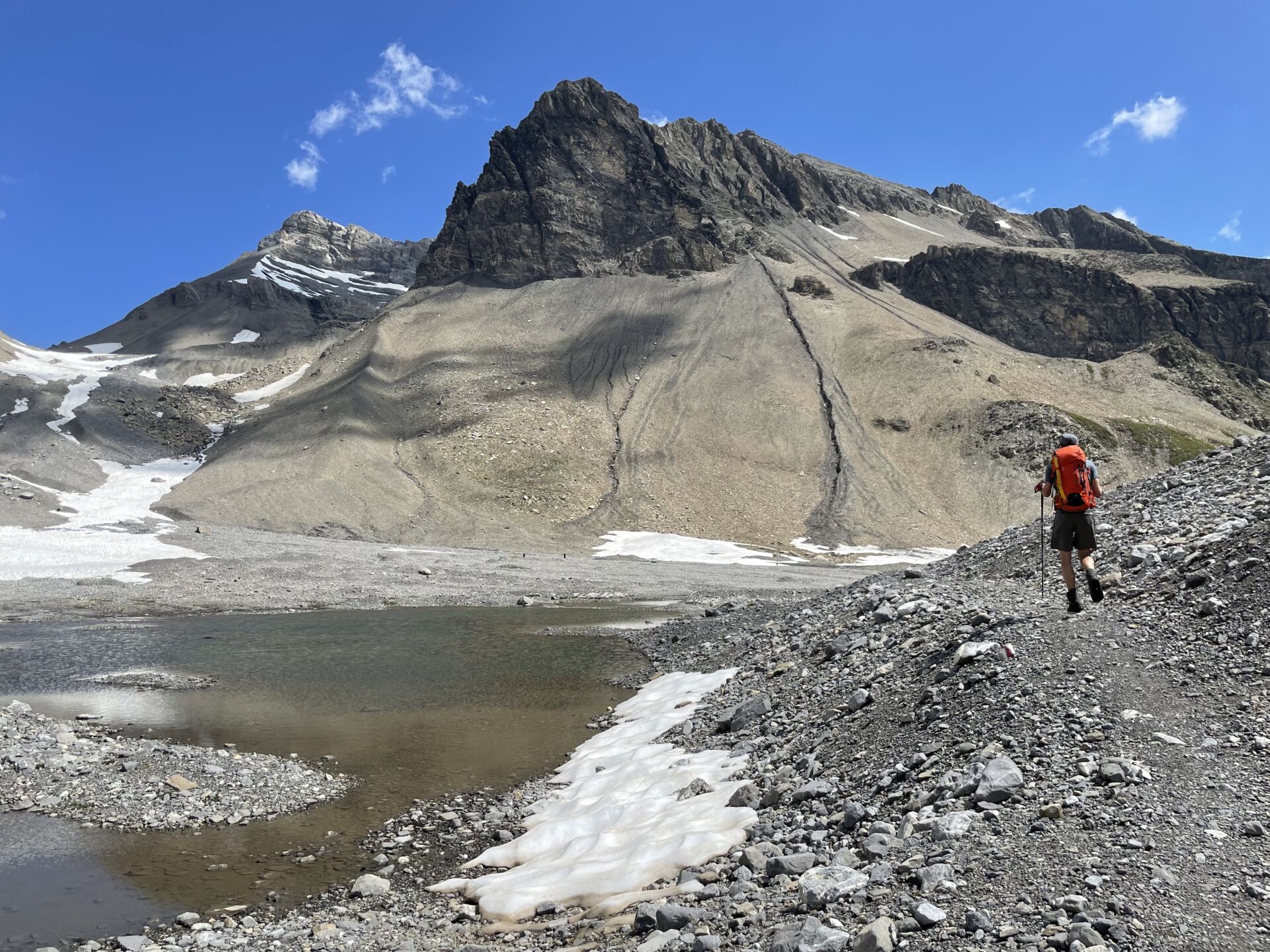 Dann stehen wir an einem windigen, exponierten Punkt auf fast 2900m Höhe, der uns staunen lässt – der Col des Audannes. Die neue Geländekammer sieht komplett anders aus. Kleine Seelein grenzen weiter unten an den Rand der soeben überwundenen Steilwand. Das weite Tälchen ist unten sogar teilweise grün. Und über uns thronen Pucel und Wildhorn mit ihren vorgelagerten Gletschern.