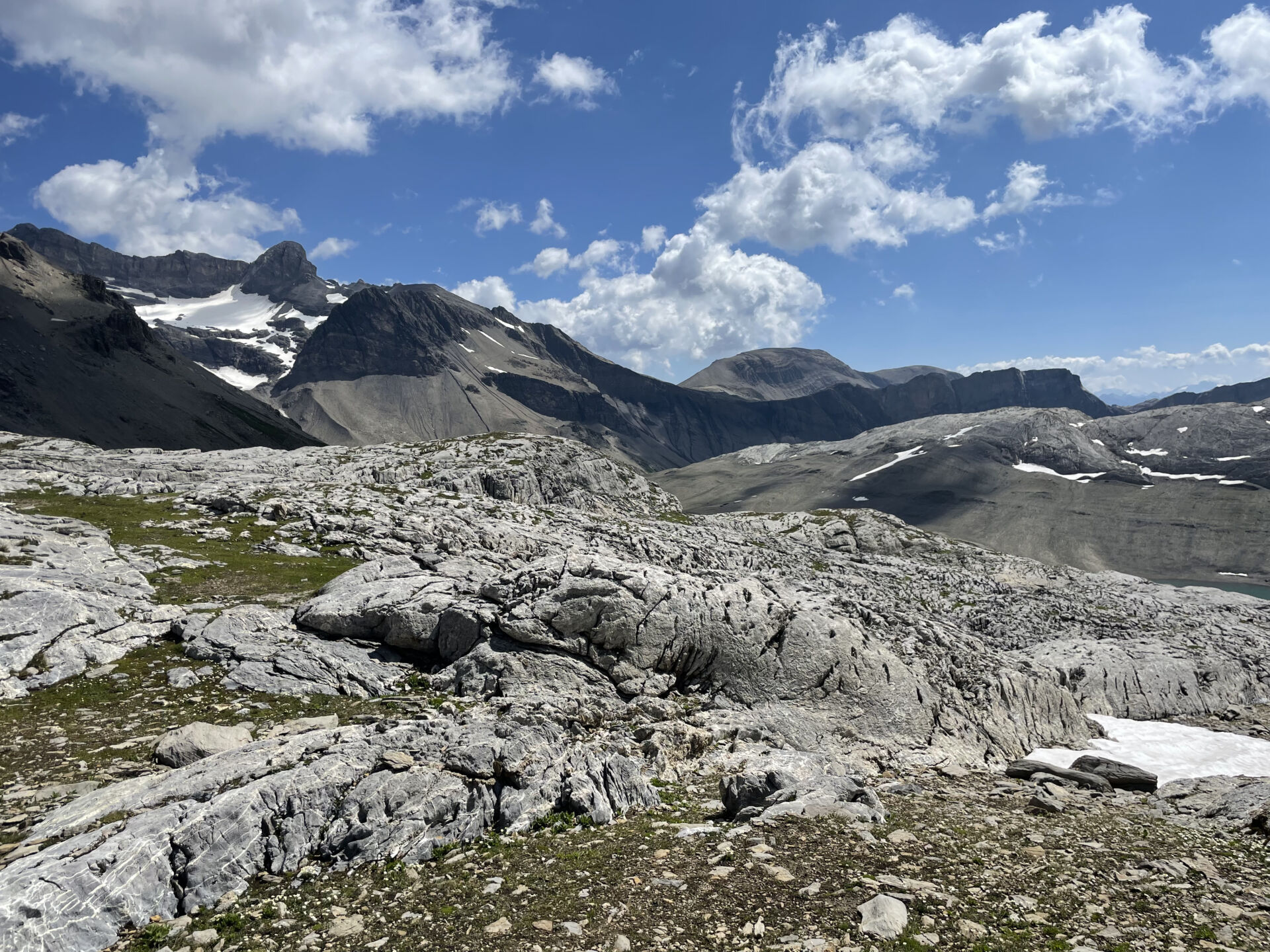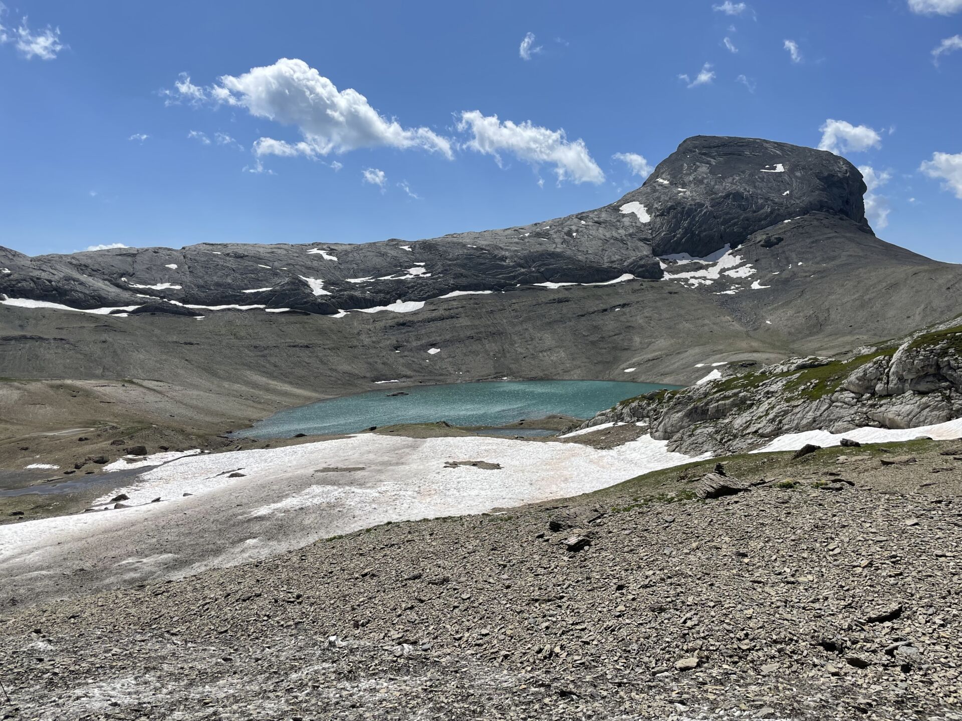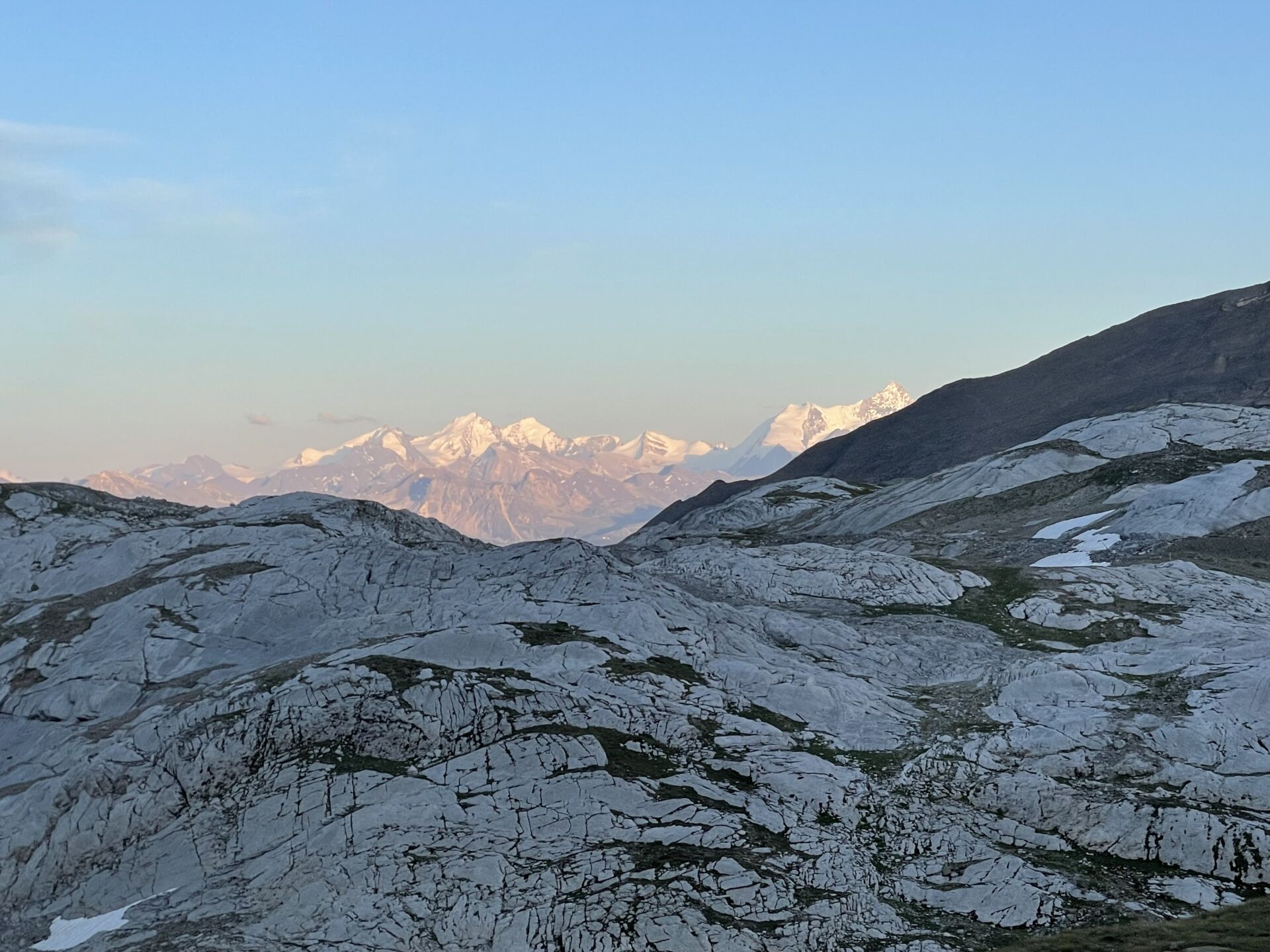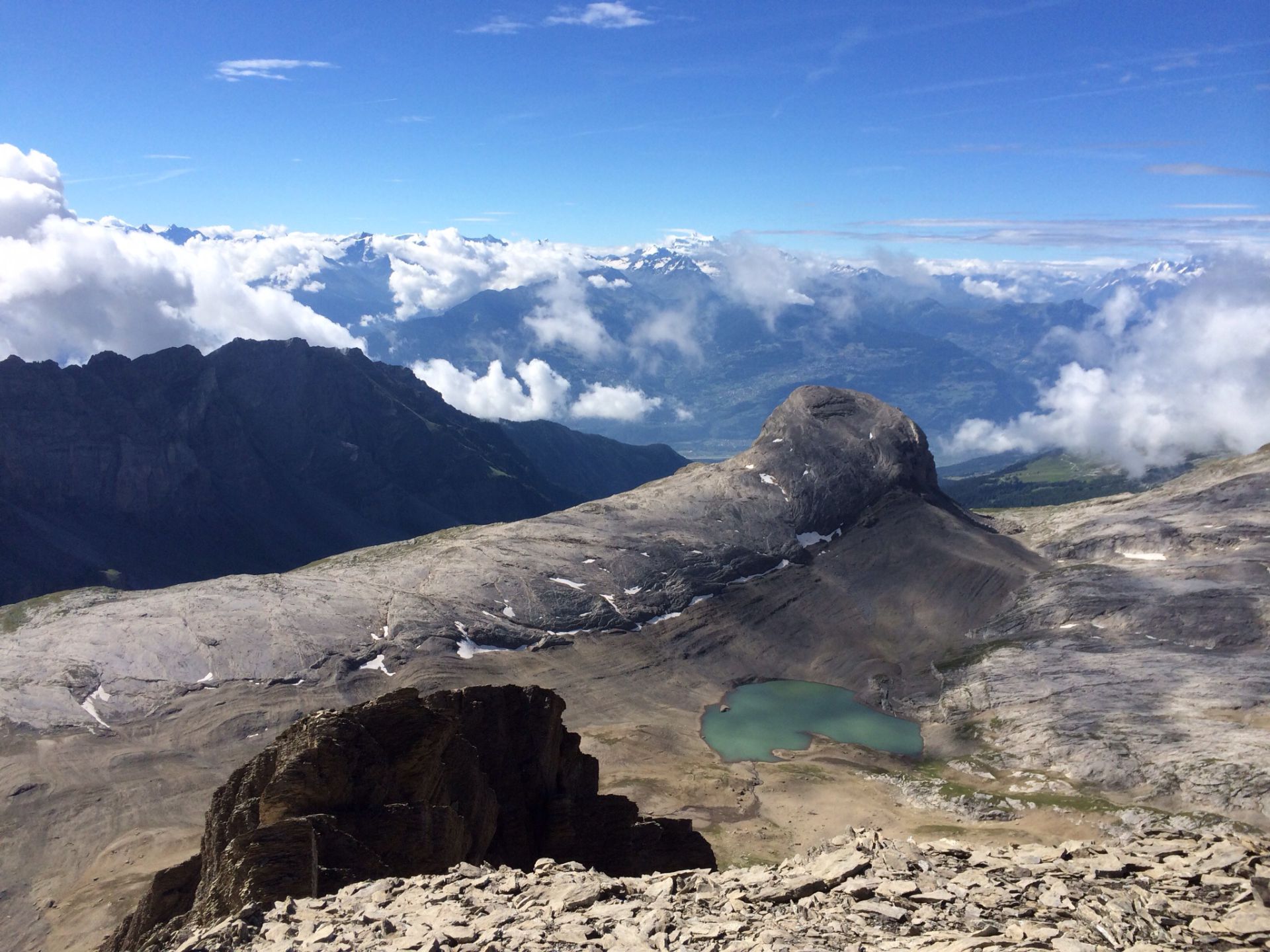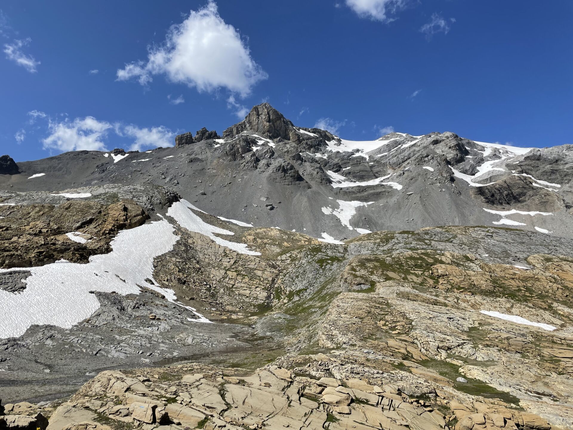 Dann stehen wir an einem windigen, exponierten Punkt auf fast 2900m Höhe, der uns staunen lässt – der Col des Audannes. Die neue Geländekammer sieht komplett anders aus. Kleine Seelein grenzen weiter unten an den Rand der soeben überwundenen Steilwand. Das weite Tälchen ist unten sogar teilweise grün. Und über uns thronen Pucel und Wildhorn mit ihren vorgelagerten Gletschern.