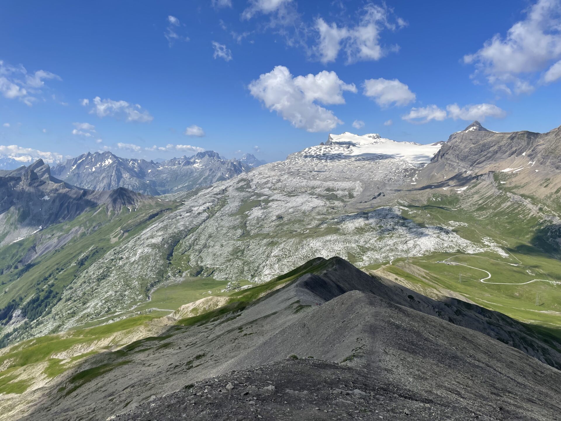 Gleich auf dem Pass beginnt die Arête de l’Arpille. Der Pfad folgt diesem aus feinem Kies wohlgeformten Grat bis zum Gipfelfuss des Arpelistocks, dem westlichsten Gipfel des Wildhornmassivs. Die Aussicht ist grossartig. Hinter uns die Diablerets mit dem ausladenden Tsanfleuron-Gletscher und dem eleganten Oldenhorn, links unten der Stausee mit dem Spitzhorn, dahinter der Fernblick in die Gstaader und Freiburger Dolomiten, rechts die endlose Reihe Walliser 4000er von Weissmies bis Grand Combin und das Mont Blanc Massiv.
