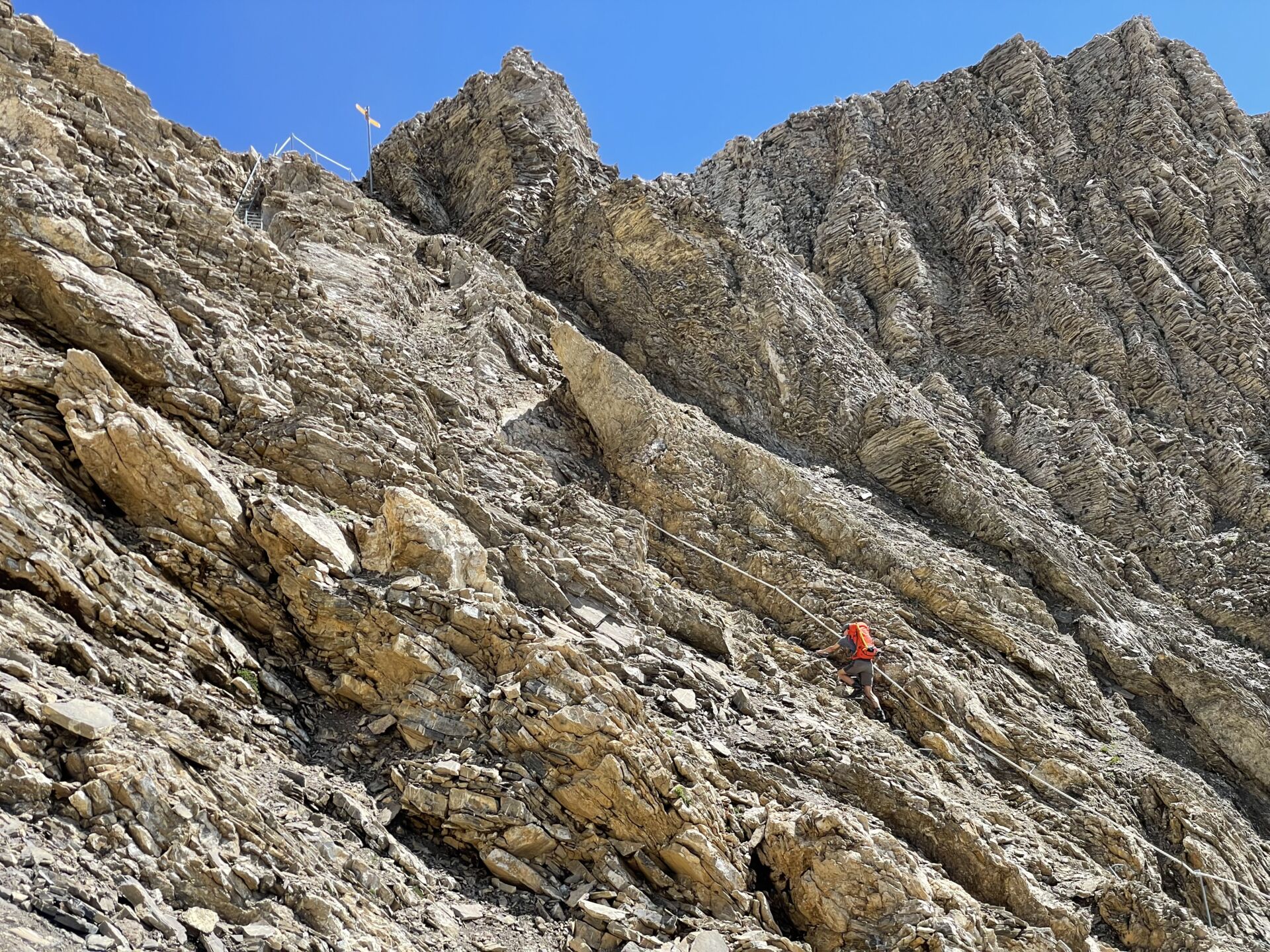 Wir gehen die scharfe Steigung – 400Hm über Schutt – langsam an. Die Sonne brennt, es ist Mittagszeit. Zwischendurch holen wir etwas Luft und machen Fotos. Das – vermeintlich – letzte, sehr steile Stück vor dem Übergang ist mit Seilen gesichert, an denen ich mich gerne hochziehe. Aber da ist noch nicht der Pass… es folgt noch eine kurze Querung (zum Glück ist das Schneefeld gerade genug abgeschmolzen, sonst Steigeisen notwendig) und dann lädt ein mit Leitern und Stahlsprossen ausgestatteter Klettersteig dazu ein, sportlich einen Felsriegel zu überwinden.