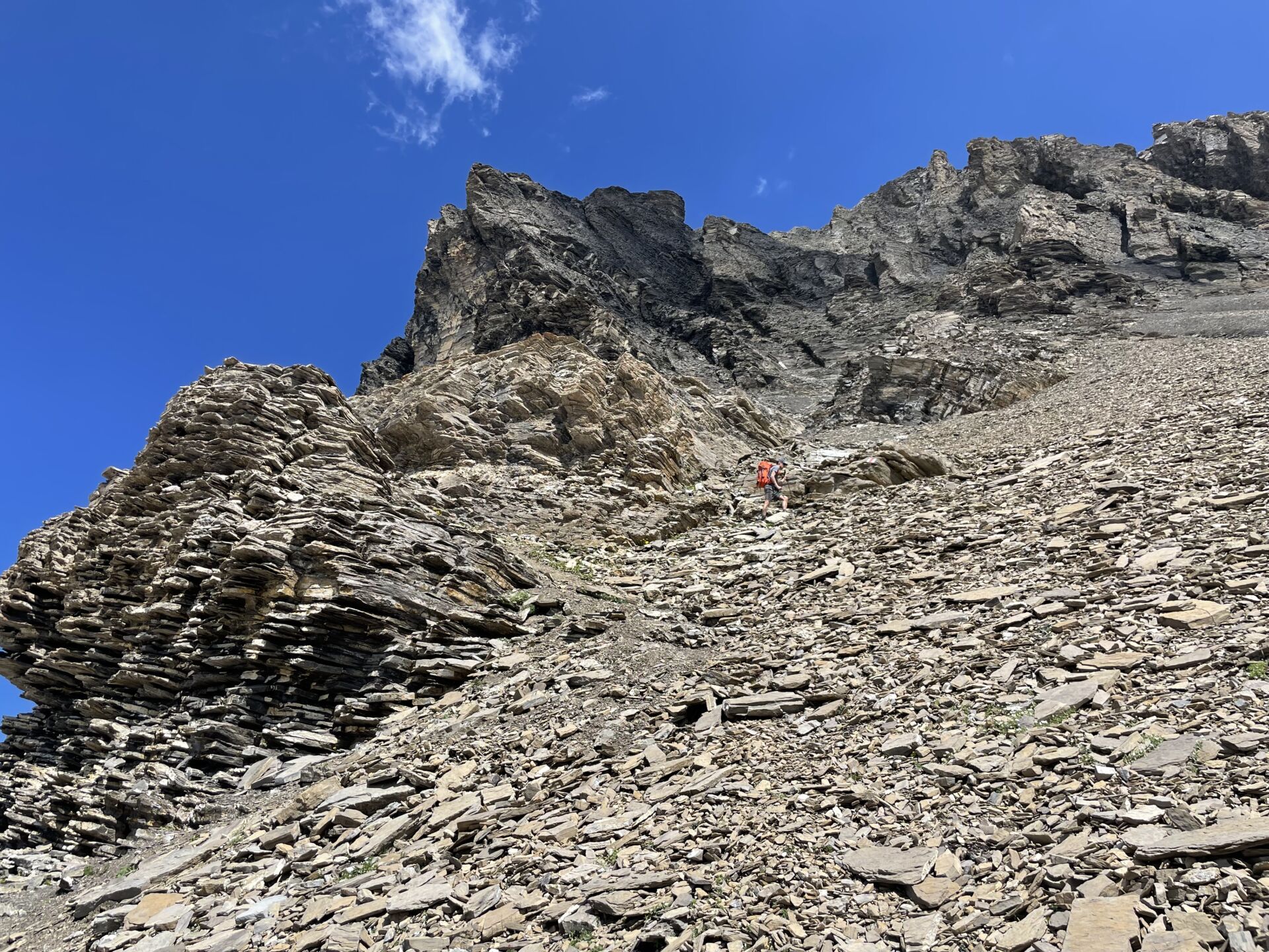 Wir verlieren im leichten Auf und Ab nur etwa 150 Höhenmeter bis wir am Fuss des eindrücklichen Nord-Süd-Felsriegels stehen, der vom Wildhorn über rund acht Kilometer Länge bis zum Prabé oberhalb Sions reicht. Er kann über den Col des Audannes überschritten werden, wobei „Pass“ eigentlich das falsche Wort ist. Es ist nichts anderes als eine Stelle auf dem Grat, wo die Felsen passierbar sind.
