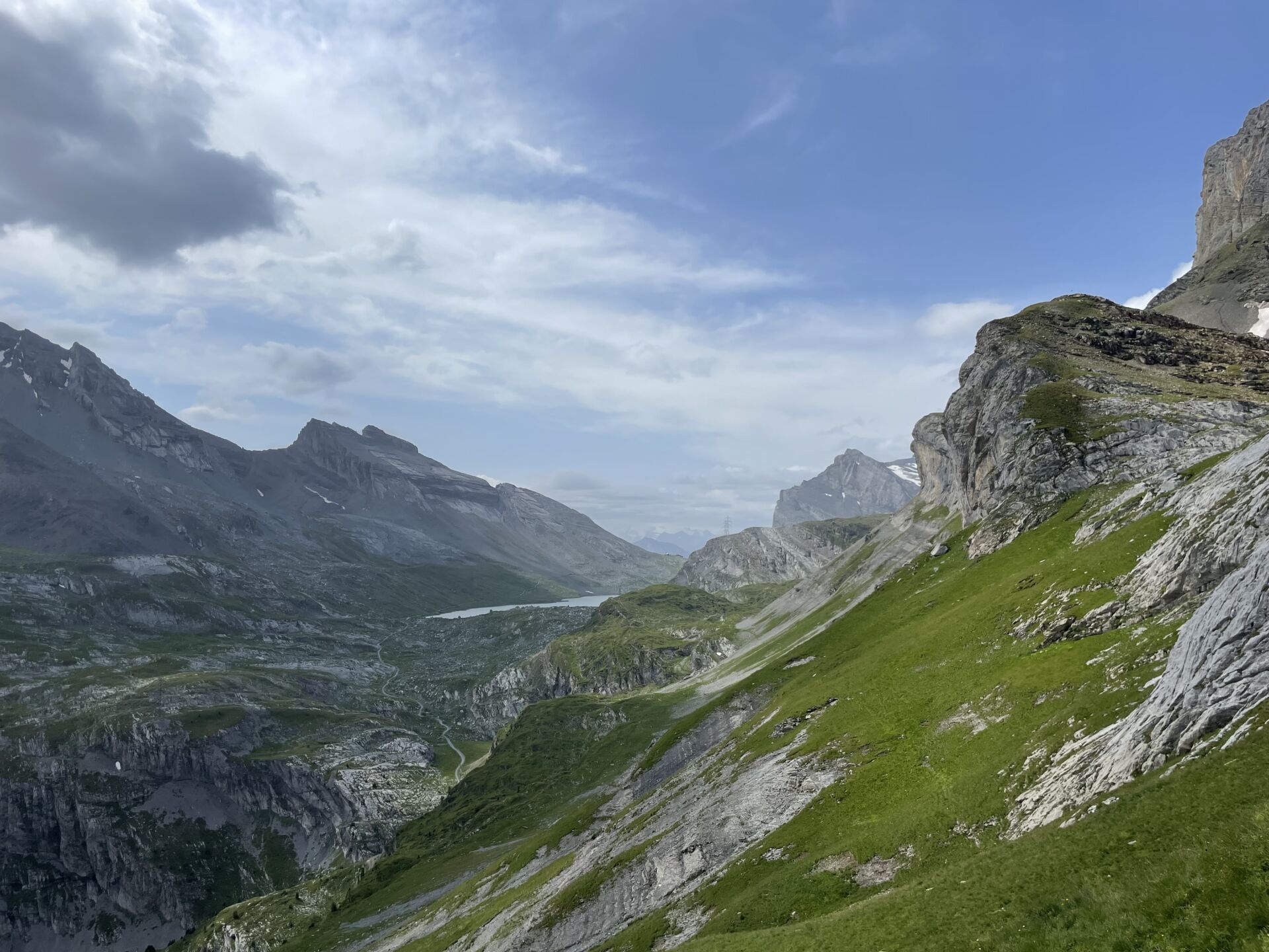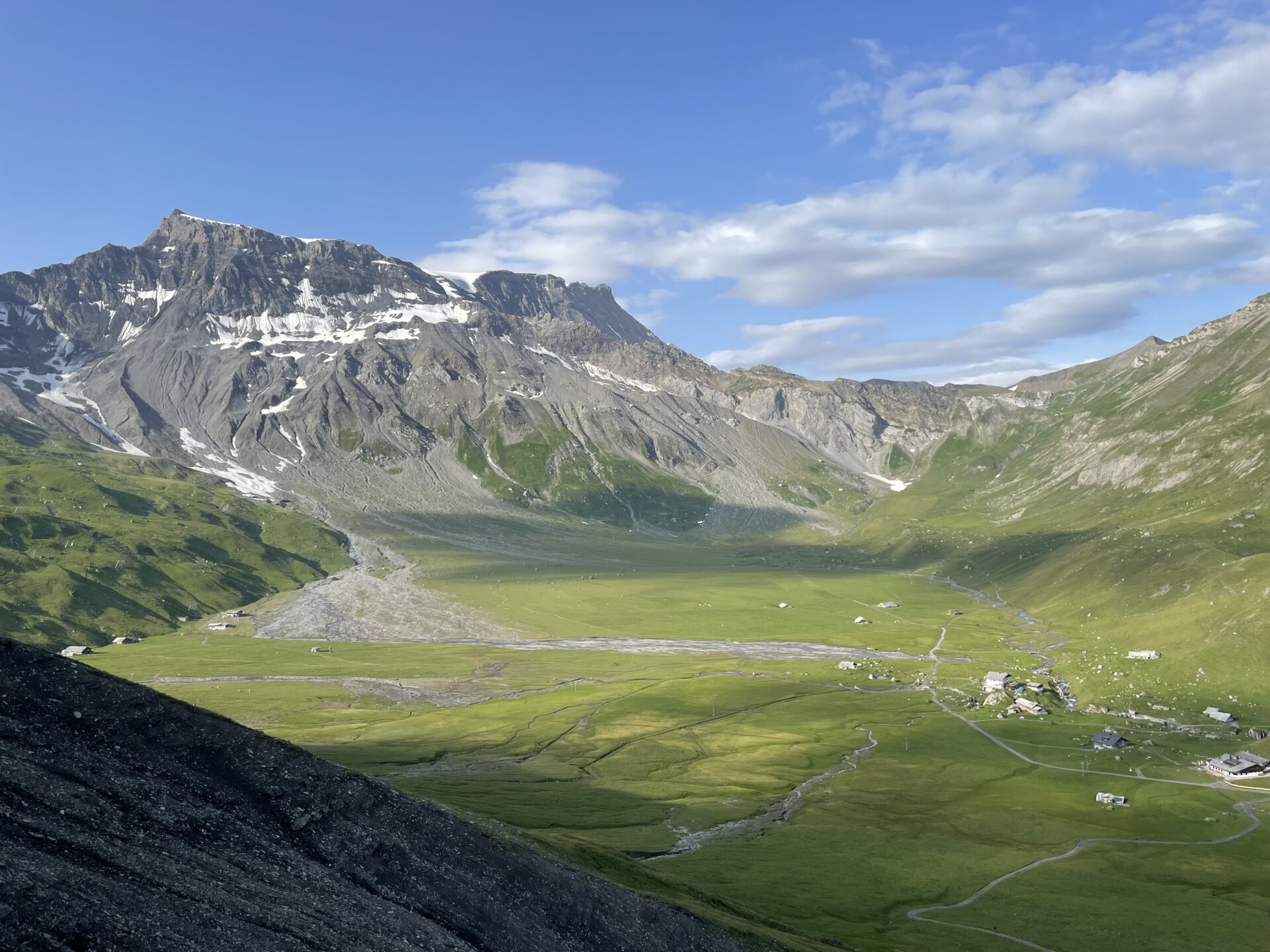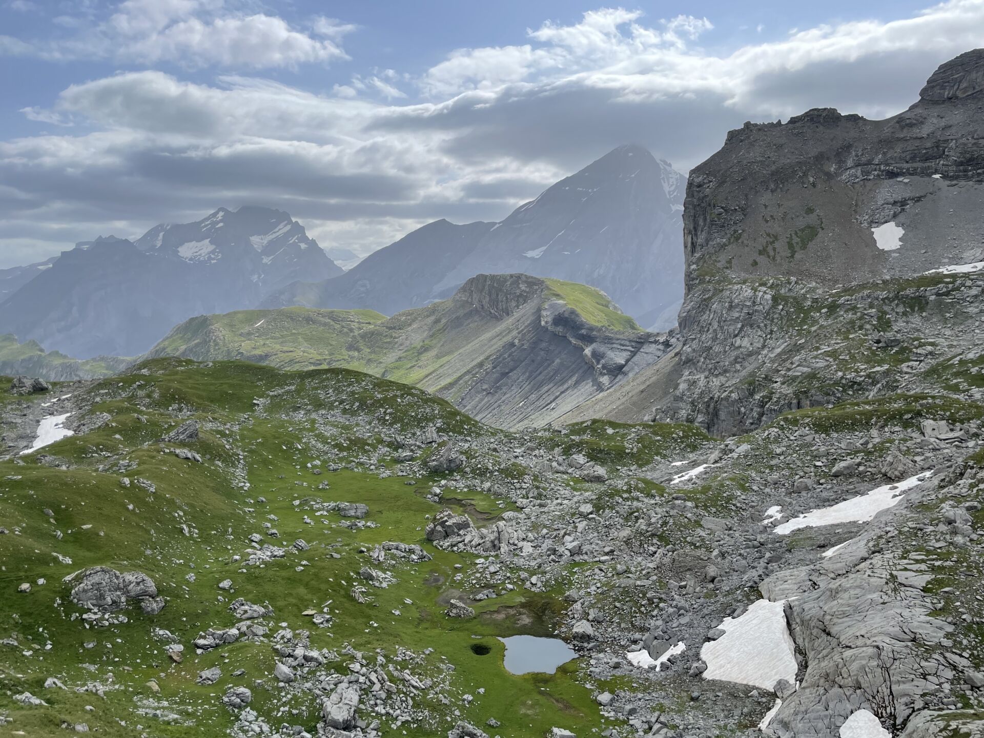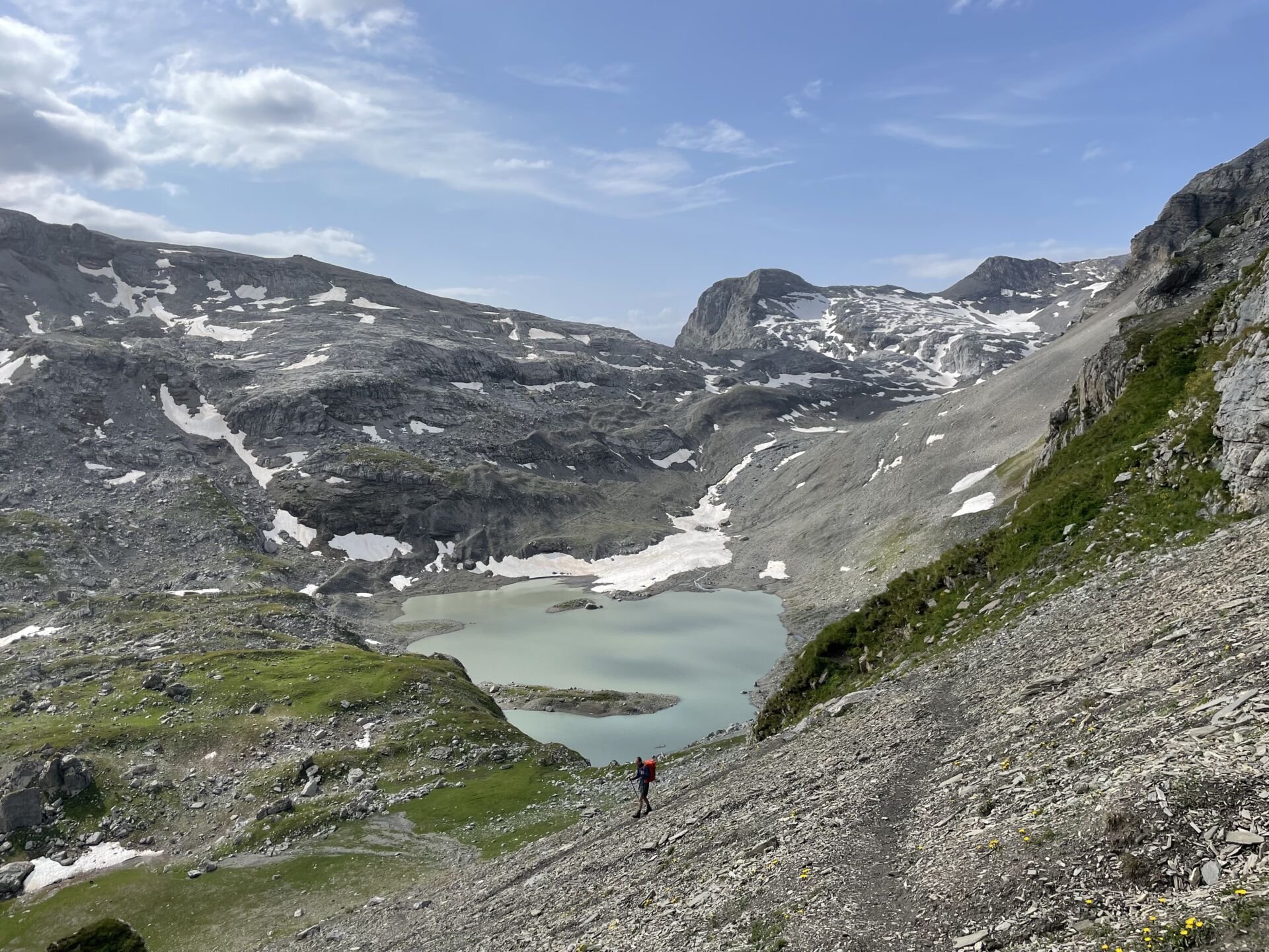 Wir folgen dem breiten Gratrücken bis zur ersten Abzweigung, die uns ins Tälli hinunterführt. Der gleichnamige Gletscher ist bis auf einen kleinen Fleck neben dem Roten Totz verschwunden, dafür hat er eine wohlgeformte, geschliffene Landschaft mit einem See hinterlassen. Darunter wird es bald steinig-grün und blumenreich – sehr schön.