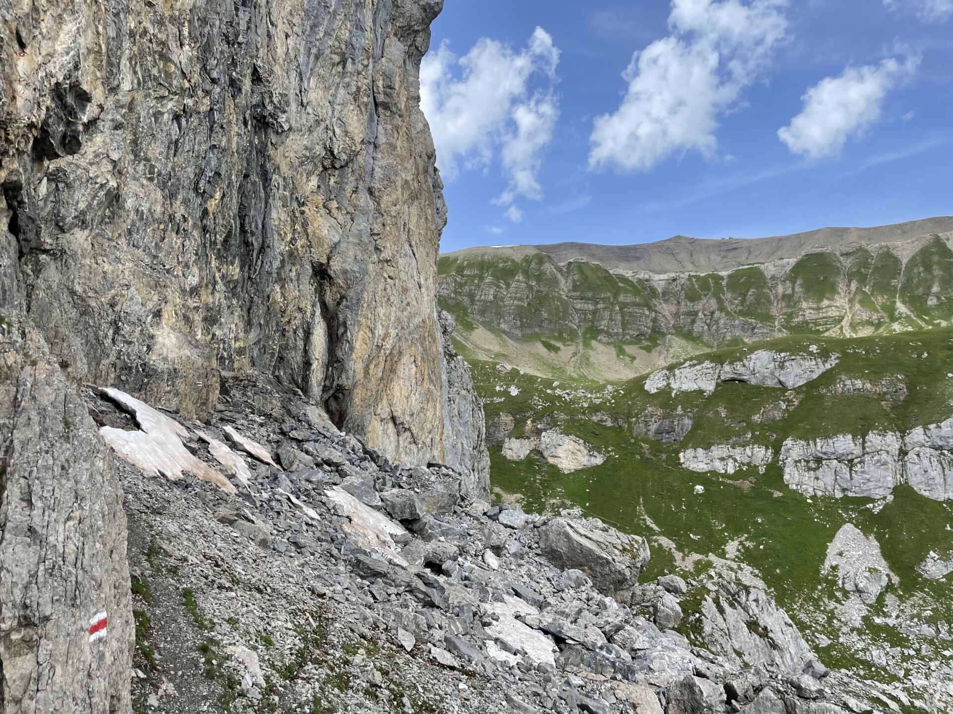Unter der Wand durch geht’s zum Schwarz Grätli. Dahinter Blüemlisalp und Doldenhorn