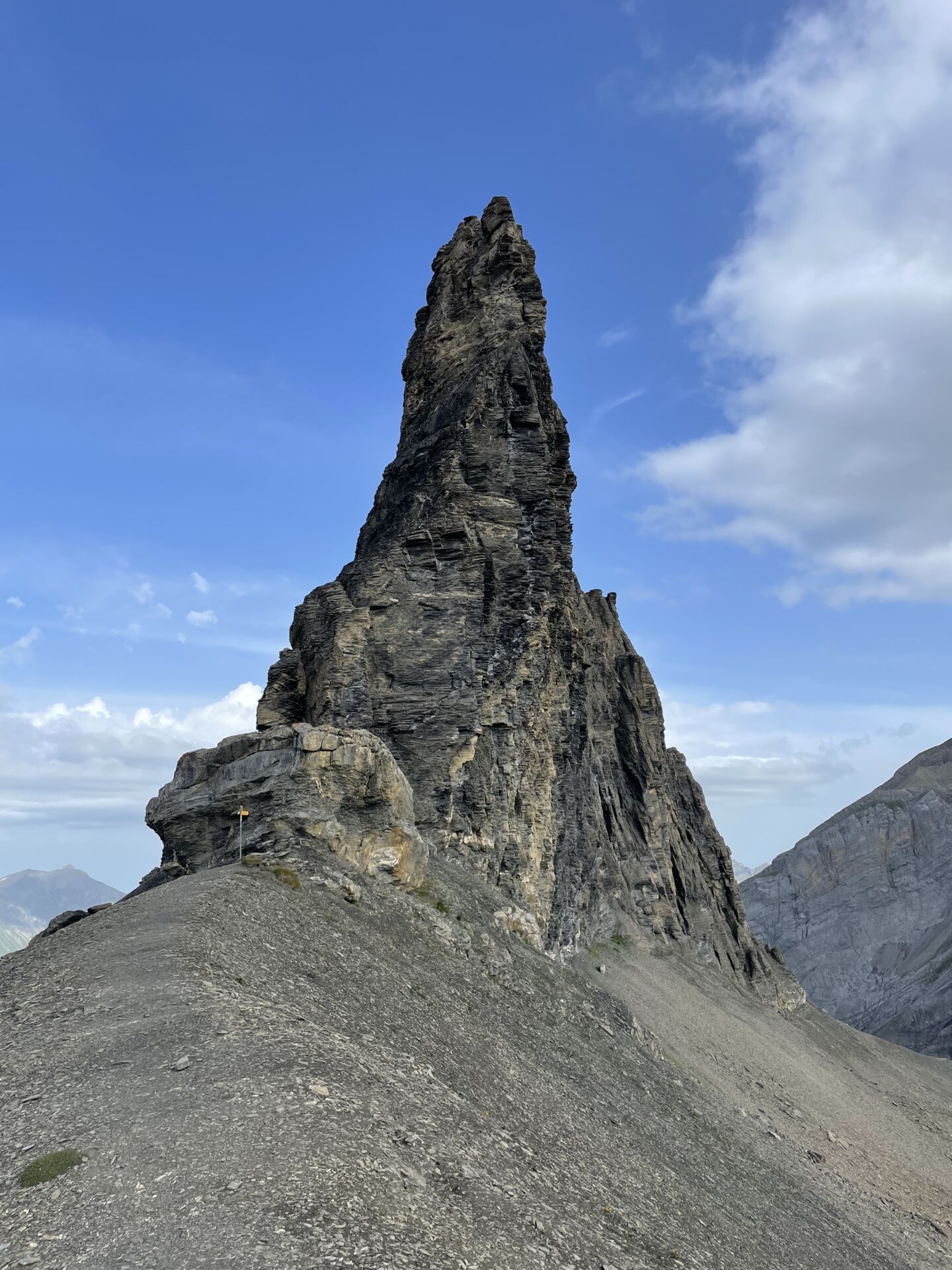 Weiter oben wird es schuttig und das Gelände steilt kräftig auf. Die Stöcke sind hilfreich. Beim südseitigen Umgehen des Tschingellochtighorns wird es sogar etwas abschüssig, aber der Pfad ist gut. Als wir den Engstligengrat erreichen, sehen wir nur noch einen spitzigen Pfeiler. Ein Fotomotiv par Excellence und für mich ein geologisches Wunderding.