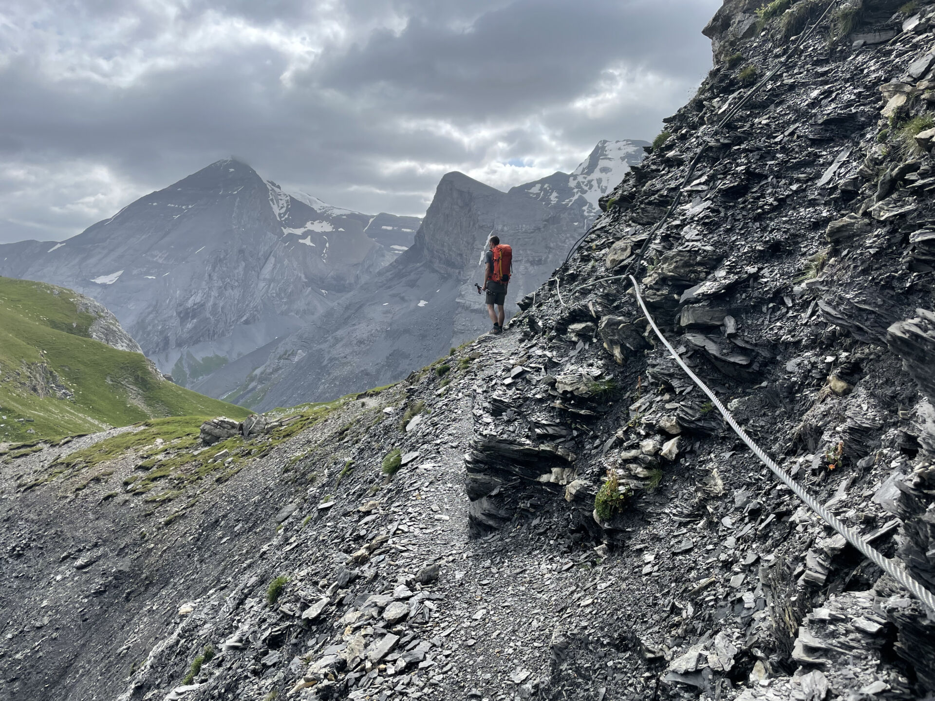 Wir durchqueren das Tälli und zweigen gleich wieder zum Schwarz Grätli ab. Der steinige Pfad dorthin steigt direkt unter einer senkrechten Wand wieder rund 100m hoch. Zuletzt hilft ein Drahtseil die Scheu vor dem abschüssigen Gelände zu nehmen.