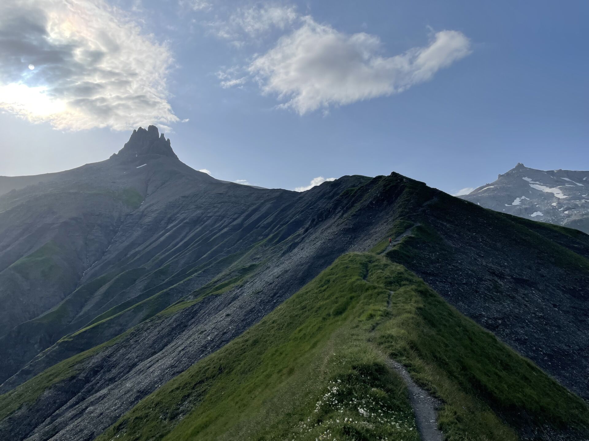 Die Tour am letzten Tag dieser Transversale-Woche soll kurz sein. Gestern war anstrengend, heute wollen wir gemütlich „auslaufen“. Ganz ohne schwitzen geht das natürlich nicht. Knapp 700 Höhenmeter Steigarbeit fordert der Artelegrat von uns um den anvisierten Enschligengrat zu erreichen. Das geht zunächst gemächlich von statten, der gutmütige Grasrücken ermöglicht zur rechten Hand wunderbare Blicke über die weite Engstligenalp zum Wildstrubel, links gehen die Tiefblicke nach Adelboden hinunter.