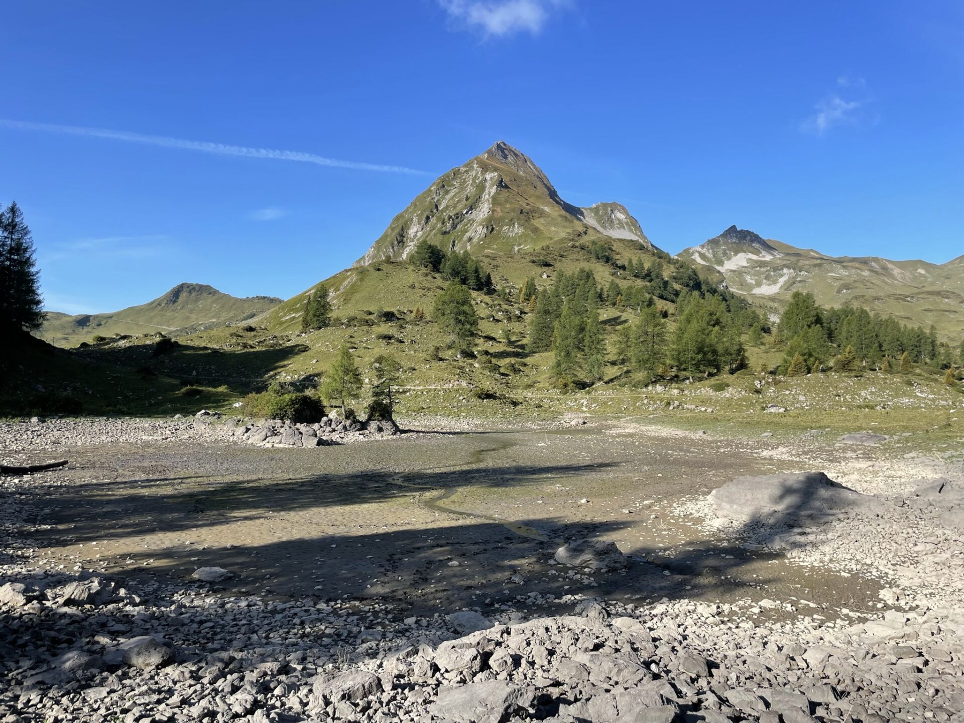 Die erste Gondel der Älplibahn um acht Uhr morgens hievt mich von Malans auf 1700 Meter. Das ist auch nötig, sonst ist das für heute geplante Auf und Ab kaum zu schaffen. Bis zum (im September leider ausgetrockneten) Fläscherseeli ist es „déjà-vu“, ich folge nämlich ein gute Stunde im Gegenuhrzeigersinn der Route einer früheren Tour zum Falknis. Es ist sehr still, und ich spüre den Herbst, auch wenn sich die Sonne alle Mühe nimmt, das zu übertünchen. Das Gras ist nicht mehr sattgrün, die Bäche führen kaum mehr Wasser, die Murmeltiere sind pummelig.