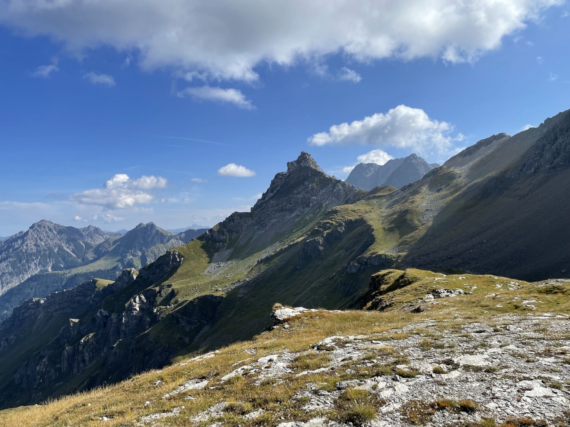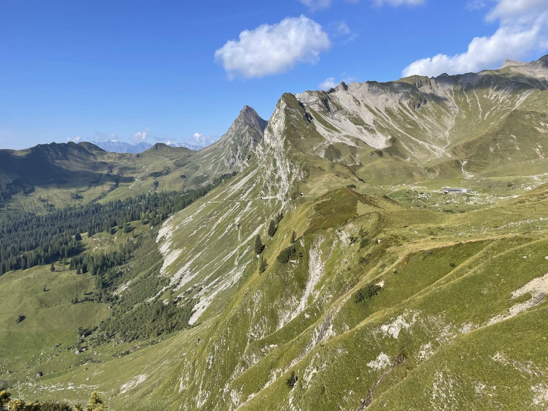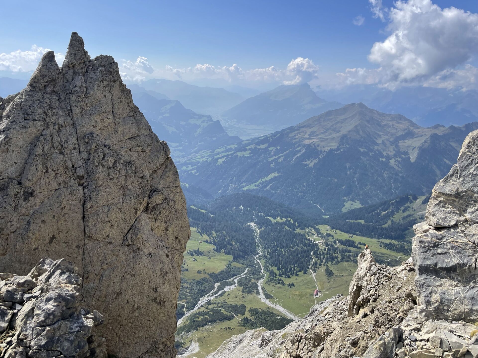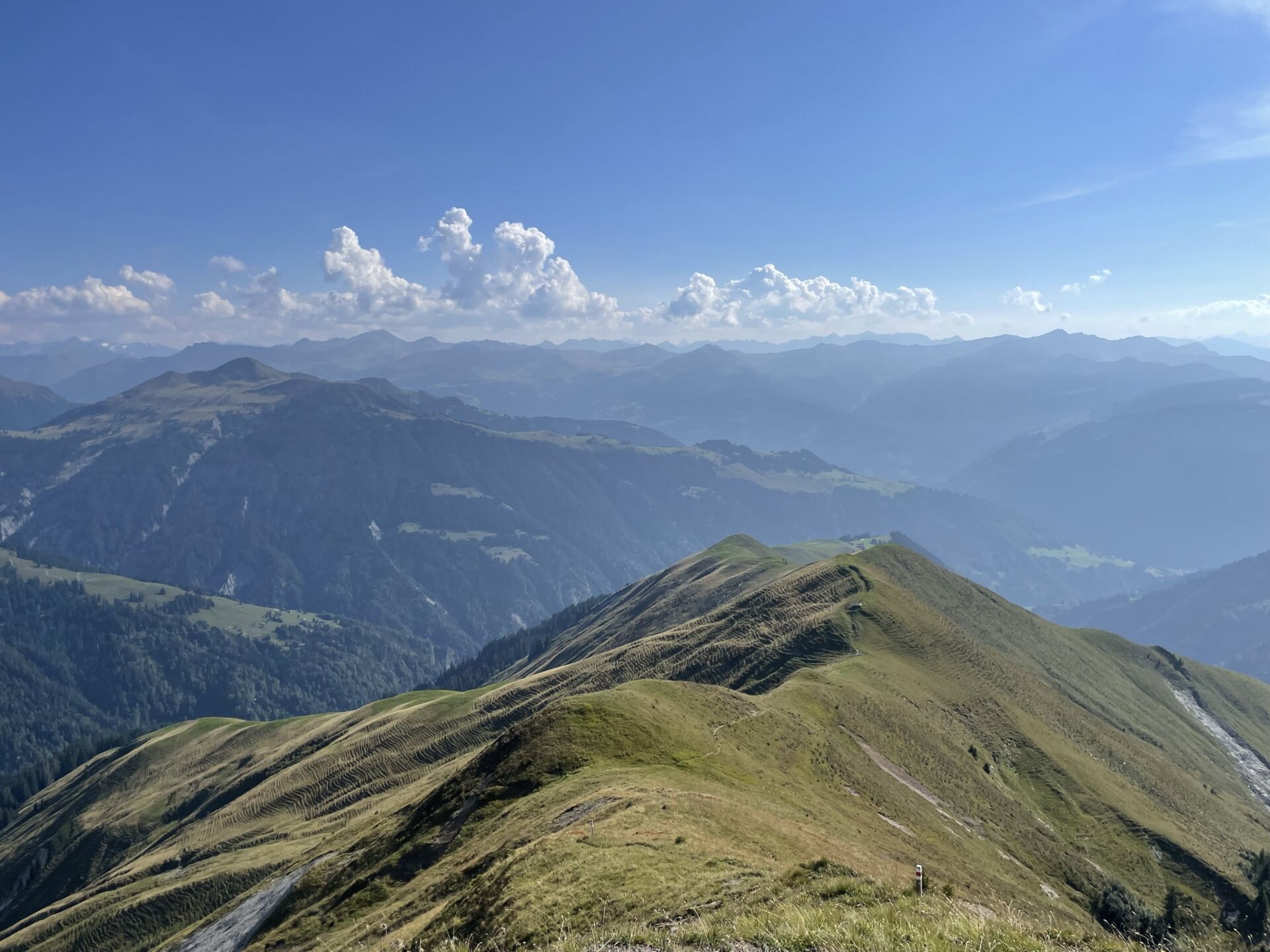 Rehydriert und gut gelaunt folge ich schliesslich dem Pfad zum Schuderser Maiensäss. Dieser führt nochmals leicht steigend – ich beginne langsam die müden Beine zu spüren – auf einen ellenlangen Grasgrat, der einen herrlichen Blick ins Prättigau bietet. Ich surfe hinunter und werfe auch immer mal wieder einen Seitenblick auf die mächtige Sulzfluh im schönen Vesperlicht, der schöne Erinnerungen an eine spannende Klettertour mit Lea hervorruft.
