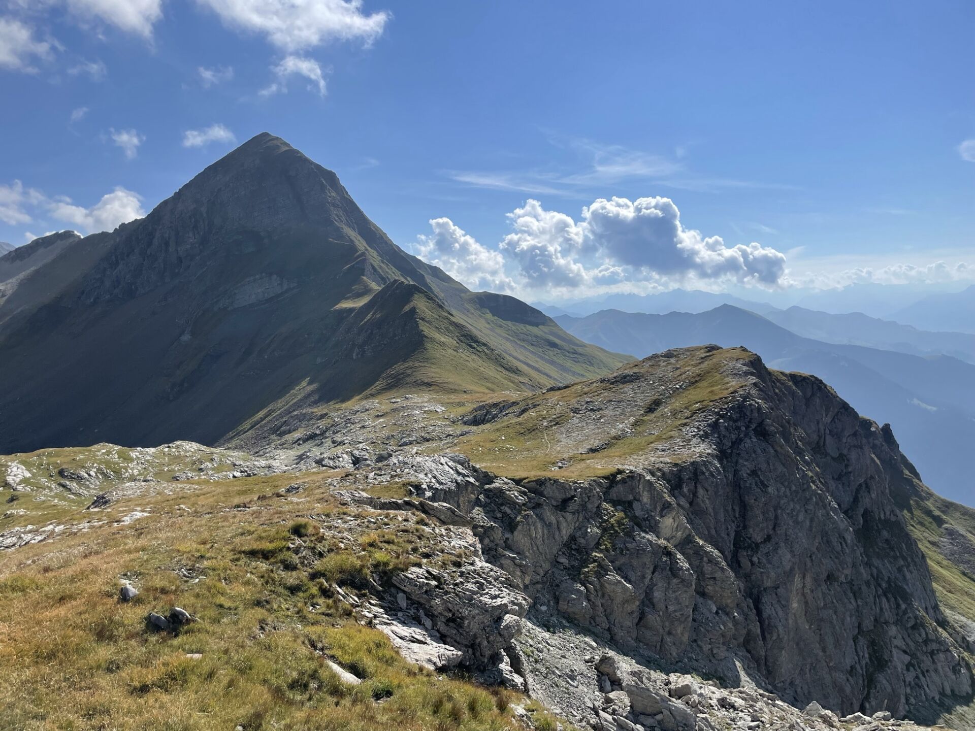 Bald zweigt ein steiler Pfad vom Wanderweg zur Schesaplanahütte nach oben ab, der mich rasch an Höhe gewinnen und bald auf dem Barthümeljoch die österreichische Grenze erreichen lässt. Ein paar Meter unter dem plateauähnlichen Gelände – schöne Sicht nach Süd und Nord! – treffe ich auf den Liechtensteiner Höhenweg, der mich nach einem kurzen Abstieg gleich wieder steigend über die Gross Furgga in die Schweiz zurückführt. Der Hornspitz vor mir gibt dabei ein gutes Fotosujet her.