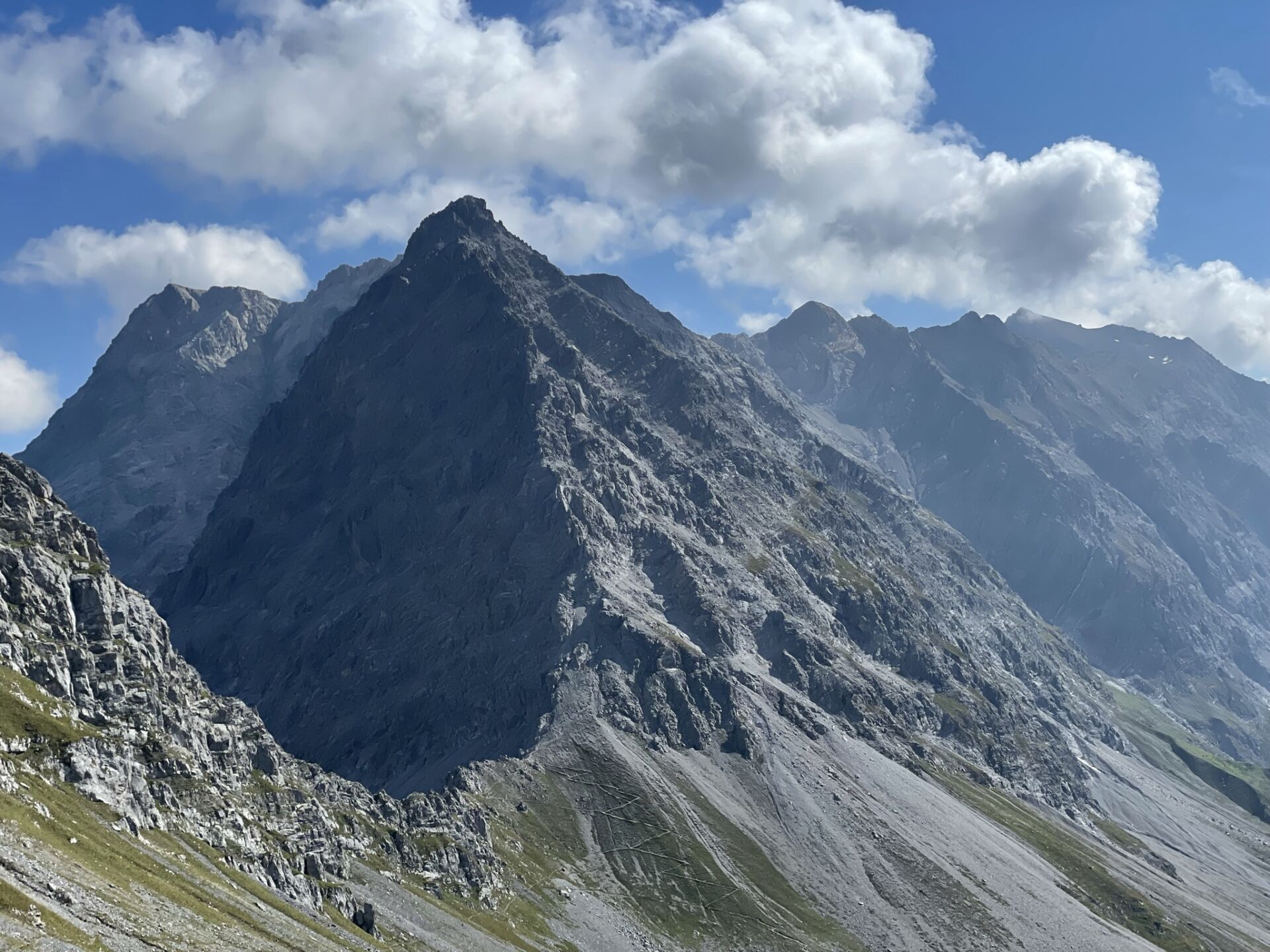 Nach einer erholsamen Pause – meine Beine spüren die 2000 Meter Steigung, switche ich erneut nach Österreich hinüber. Ich steige über die bei Nässe knifflige Ostflanke zur steinigen, ehemaligen Gletscherlandschaft der Totalp ab. Es zieht sich, bis die markante Gamslugga (nach einem kurzen, giftigen Gegenanstieg) erreicht wird, die mich für heute definitiv in die Schweiz zurückbringt.