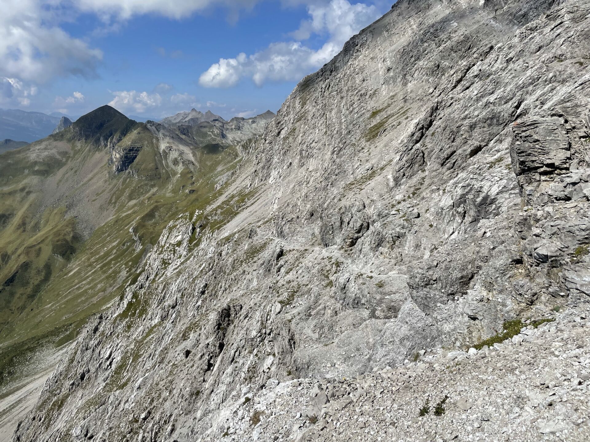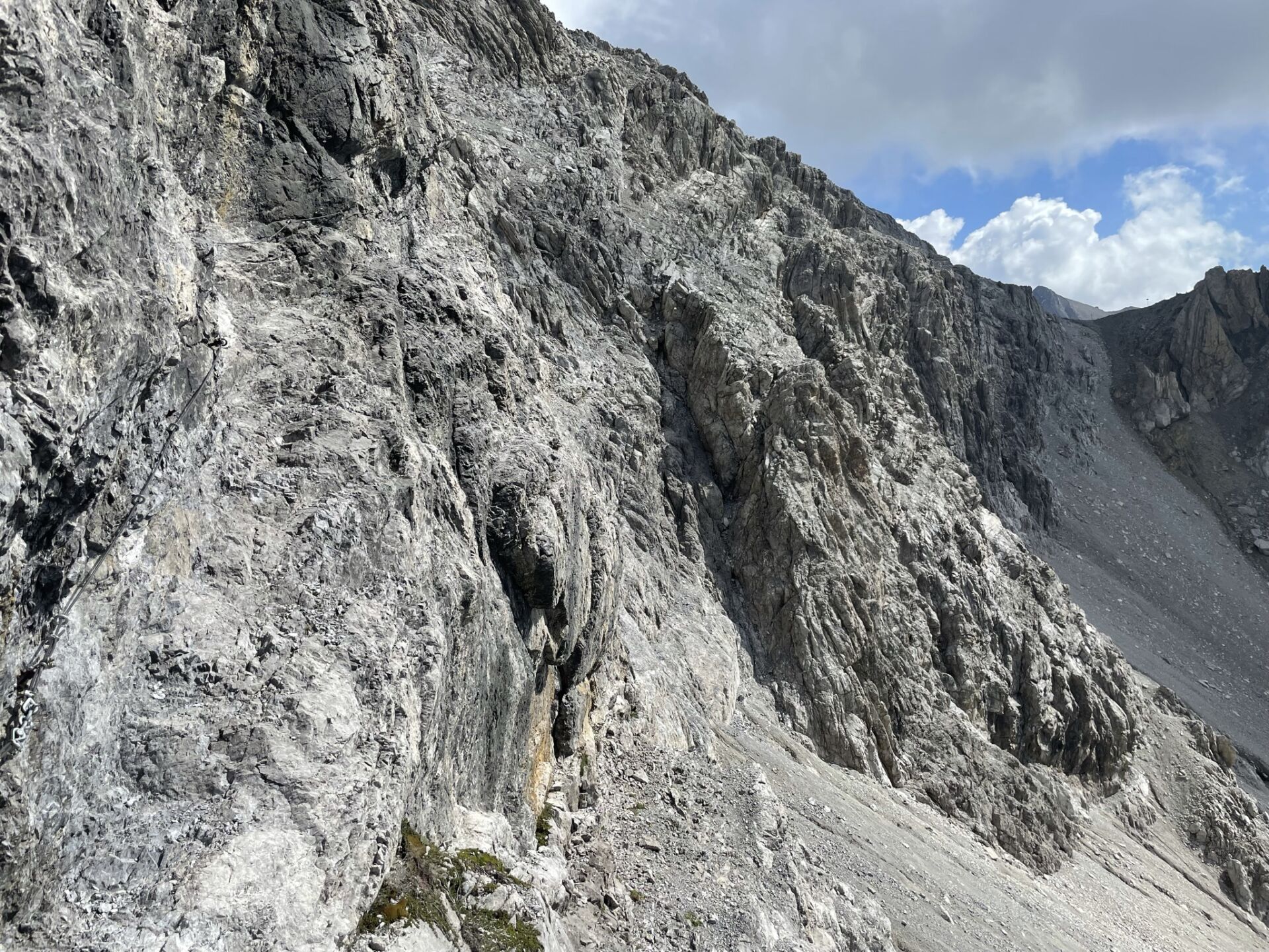 Dieser beginnt auf dem nächsten Grenzübergang, dem Salarueljoch. Der Pfad führt zunächst leicht ausgesetzt entlang der südlichen Kalkwände des Schafbergs, dann durch Schutt steil hinauf zum Fuss des Salaruelkopfs. Dort schlucke ich kurz trocken – die seilgesicherte, lange Traversierung der Wand über dem Schafsloch wirkt extrem ausgesetzt und scheint nur für gute Nerven geeignet zu sein. Doch wie so oft täuscht der erste Eindruck! – die Passage ist viel weniger schwierig zu überwinden als befürchtet. Nur Höhenangst ist hier ein schlechter Begleiter.