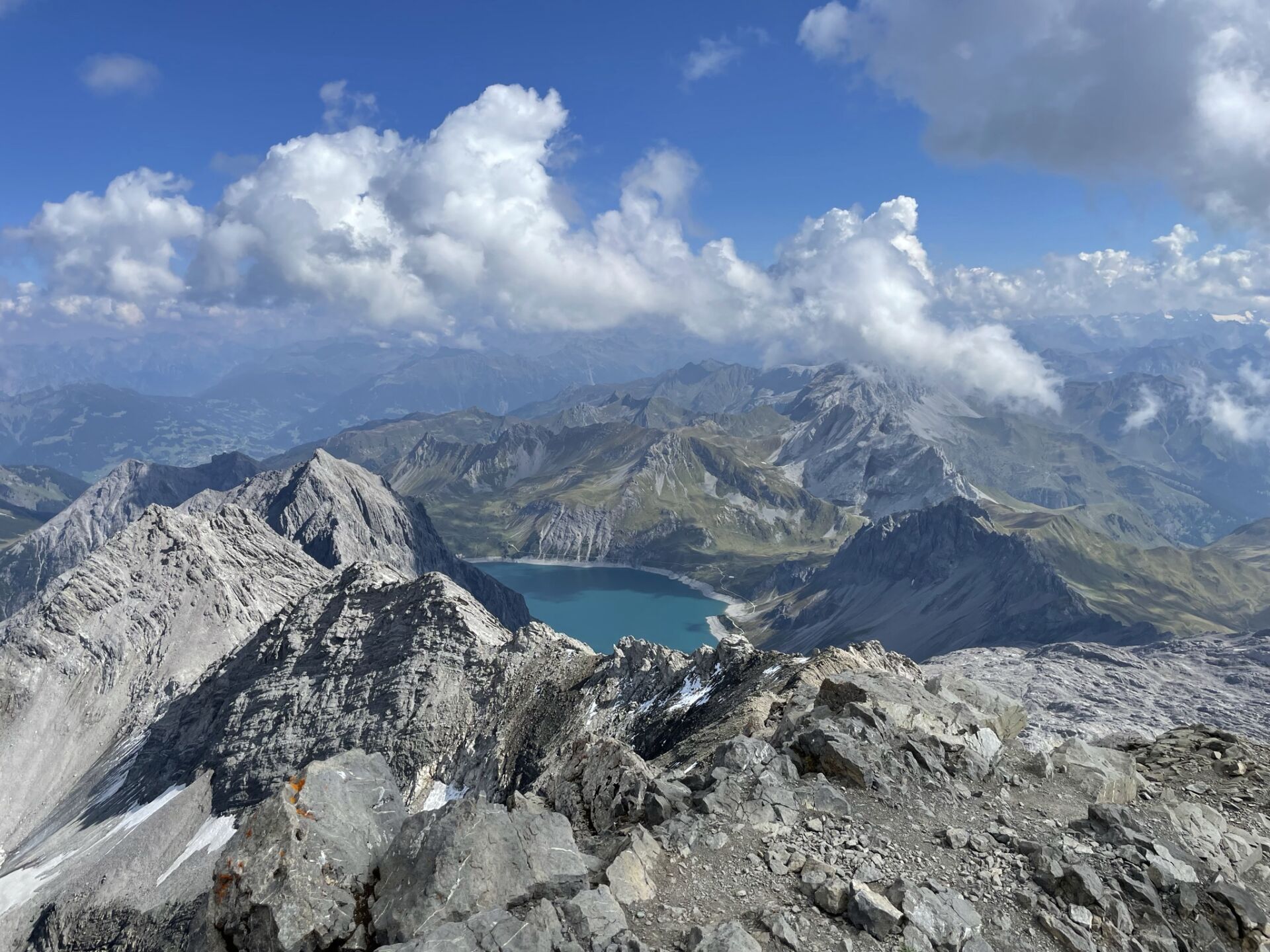Gipfelblick nach Osten zum Lünersee (Stausee) und ins Montafon
