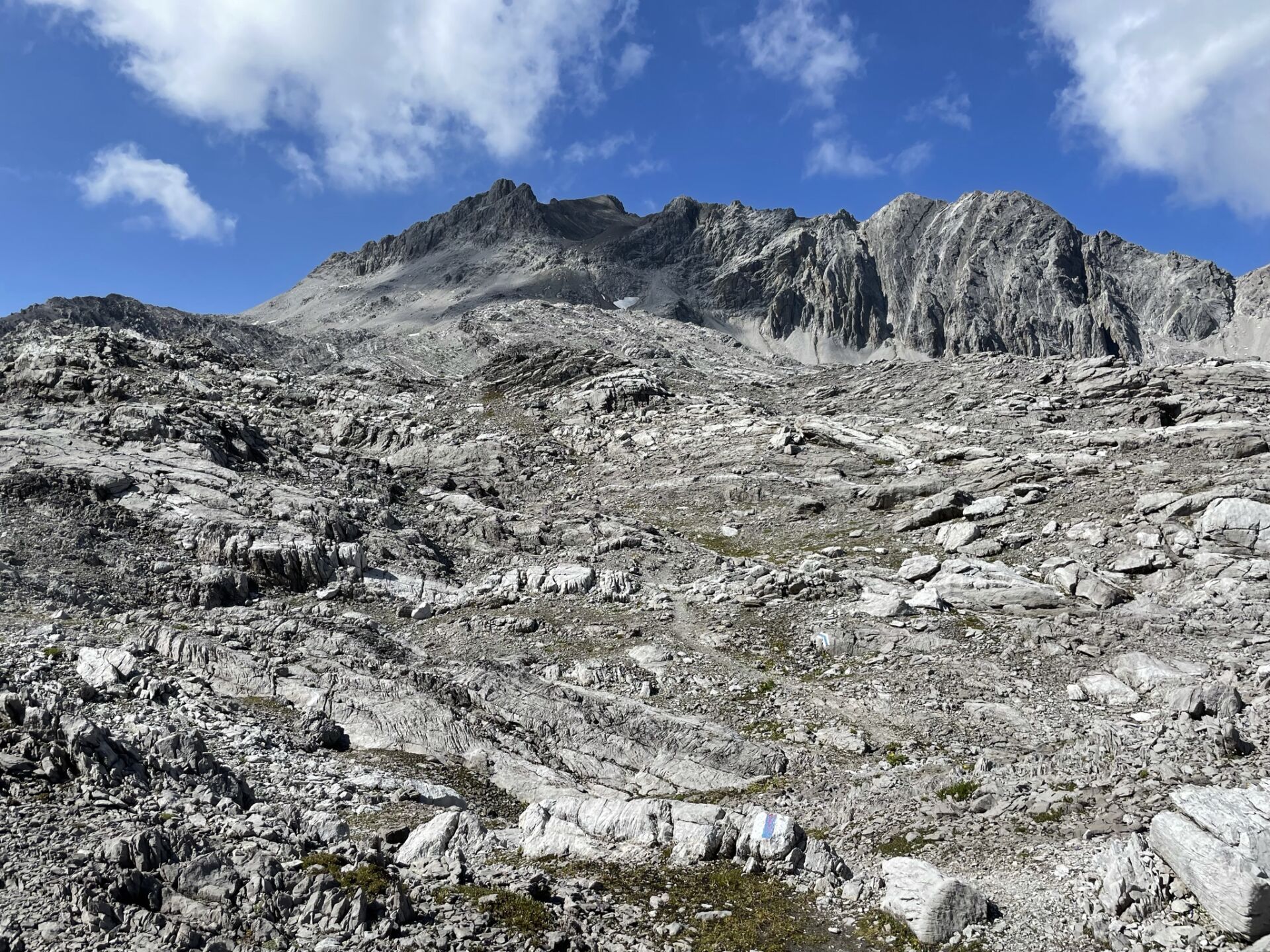 Ich muss nun zwischen zwei Varianten wählen – entweder die leicht absteigende Route über den spaltenlosen Gletscher, oder jene über die Schafköpfe, die auf der Karte nicht eingezeichnet ist, aber mit Wegweiser und (unregelmässigen) weissen Punkten markiert ist. Ich entscheide mich für die Letztere, die zwar über einige Schneefelder und Blöcke führt, aber immer eindeutig und nie schwierig ist (T4). Nach dieser weglosen Passage erreiche ich den nächsten Pass mit dem vielbegangenen, von der Schesaplana-Hütte kommenden Wanderweg, der nun wiederum auf der Schweizer Seite durch feinen Schutt auf die Schesaplana führt.