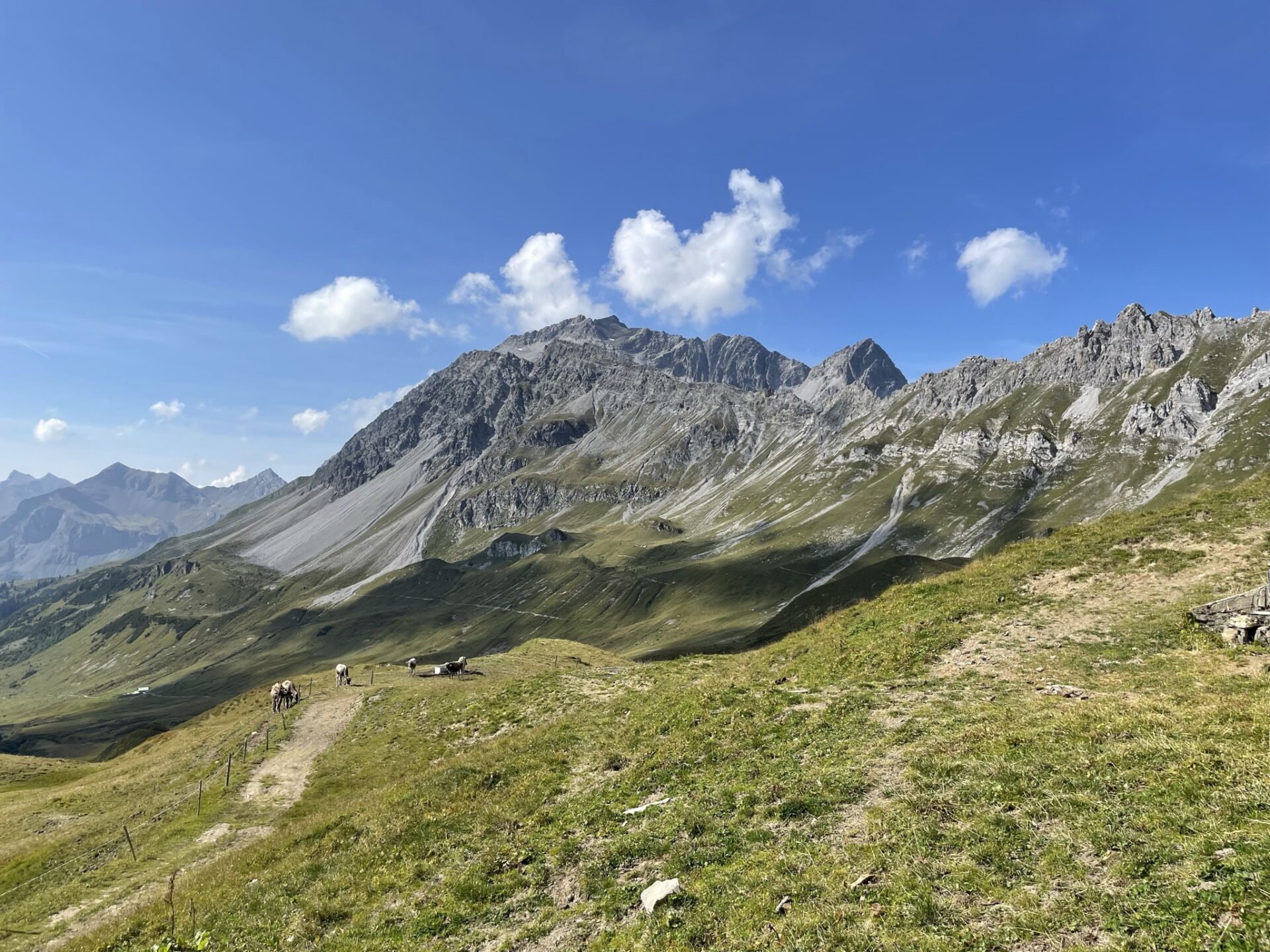 Es folgt ein ziemlich ausgesetzter, aber gut gesicherter Abstieg zu den grünen Wiesen des Rätikons hinunter. Ich benutze eine Schafspur, die mich entlang der Höhenkurve zur Golrosa bringt. Das Passhäuslein ist privat und leider keine Beiz, aber ein schöner Brunnen leistet perfekte Dienste. Mein eindeutig zu klein bemessener Wasservorrat ist längst aufgebraucht und das kühle Nass deshalb ein wahrer Segen.