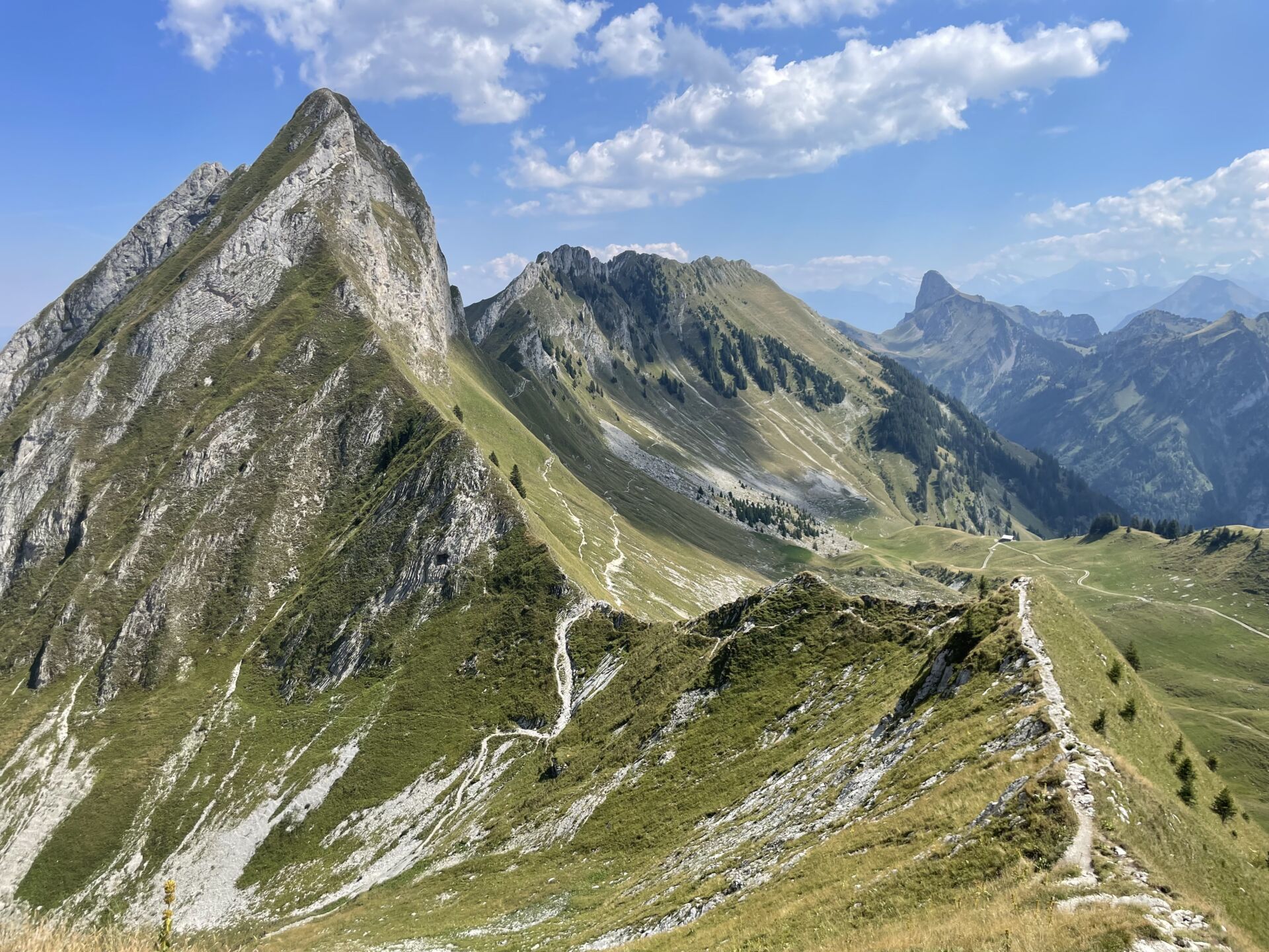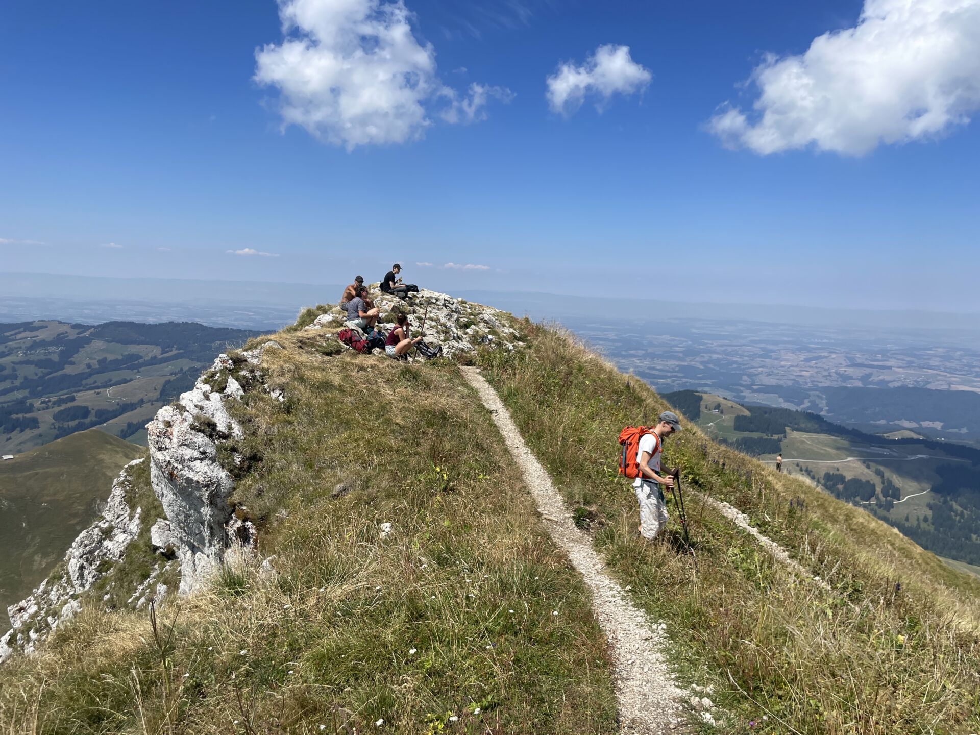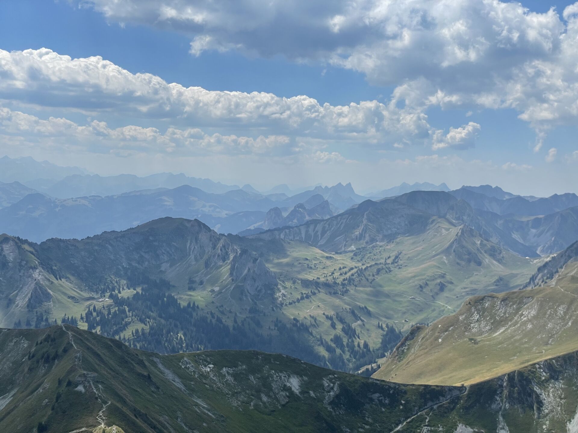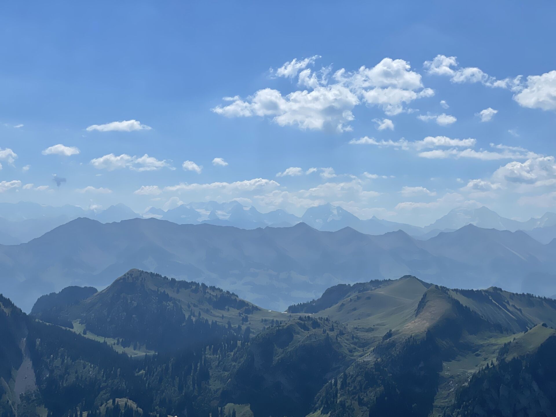 Es ist ein Panoramafest, nur die Alpengipfel zieren sich jetzt immer mehr an diesem heissen Augusttag. Umso mehr Aufmerksamkeit bekommen dafür die unzähligen Simmentaler und Fribourger Gipfelchen, die uns von ihnen trennen.