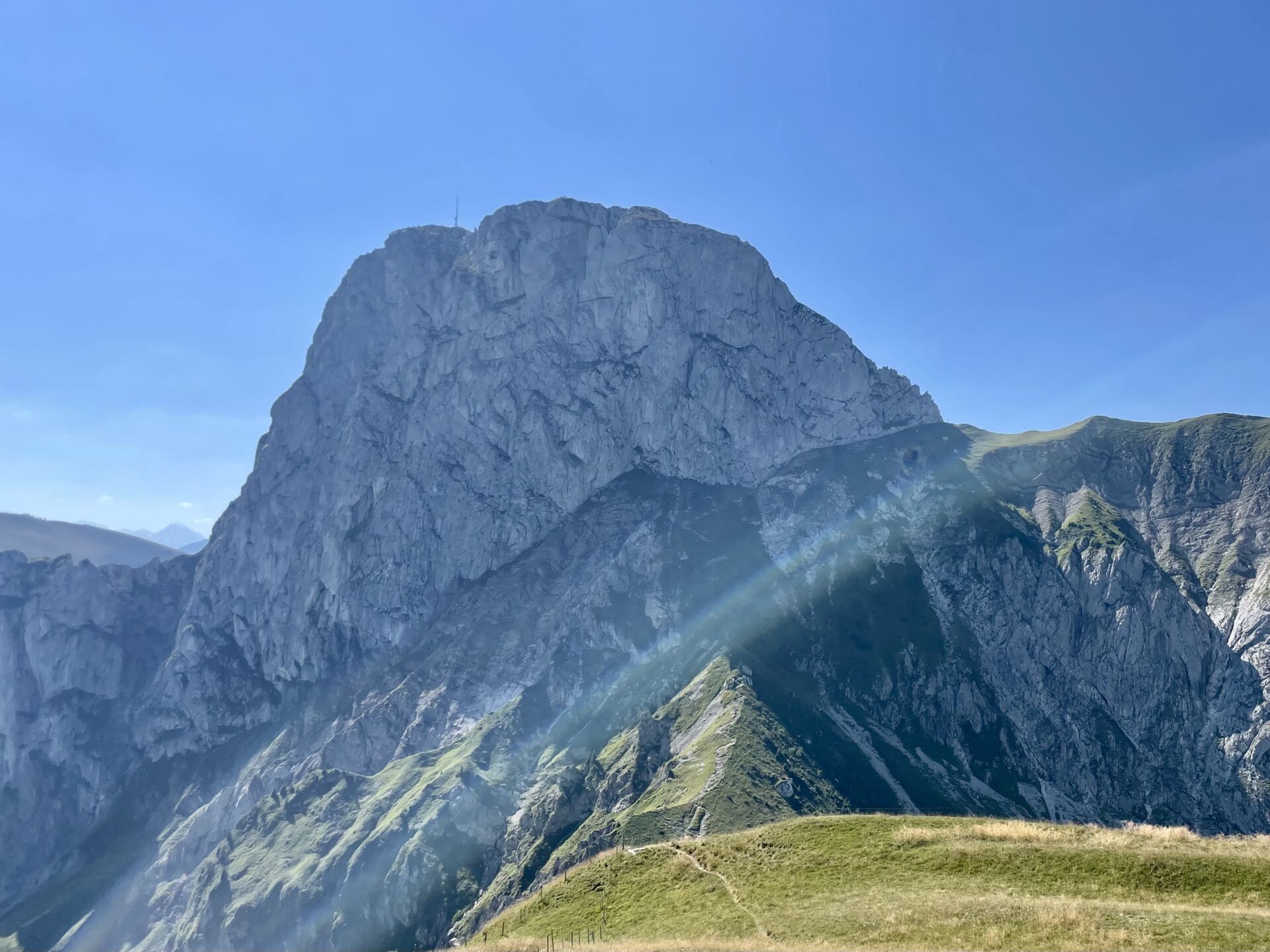 Beim Homadsattel verlassen wir den Grat. Wanderfreund Gabriel würde hier geradeaus weiter gehen, aber das wird dann bald ein anspruchsvolles T5-Gelände und braucht Mut und Zeit. Wir steigen zum Flankenweg ab, kürzen aber über gut sichtbare Spuren etwas ab und sparen dadurch ein paar Höhenmeter. Wenig später baut sich der Gantrisch vor uns auf. Was für ein eleganter Stock!