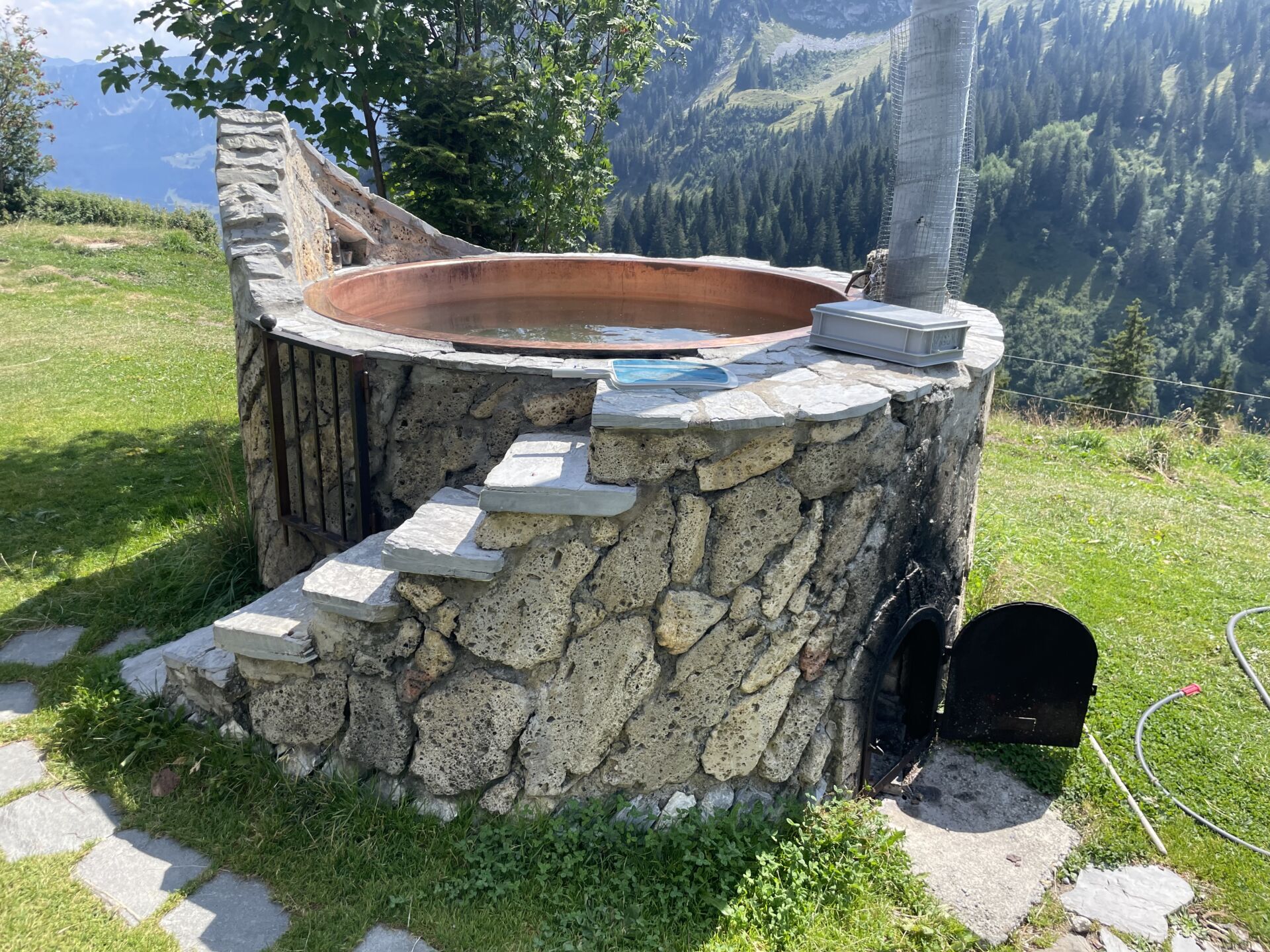 Nach dem Sandwich steigen wir ab und gelangen über den Schibespitz – mit gut erhaltenem Bunker – zum Morgetepass. Ein Schild beschreibt diesen Übergang als jahrhundertealten Saumpfad, was mich etwas überrascht. Warum gingen die denn nicht „untenrum“ über Wimmis ins Simmental? Konnte man so Zölle sparen? In der Alpwirtschaft Morgete können sie mir das auch nicht erklären. Aber dafür überrascht uns das superfreundliche Alpteam mit ihrer Location, zu der ein Hot Tub im Chäs-Chessi und liebevolle Zimmer in drei Gastgebäuden gehören. Jedes ein Unikat. Ein toller Ort für Feste im kleineren Kreis! Auch das Plättli mit heimischem Käse und Wurst ist fein.