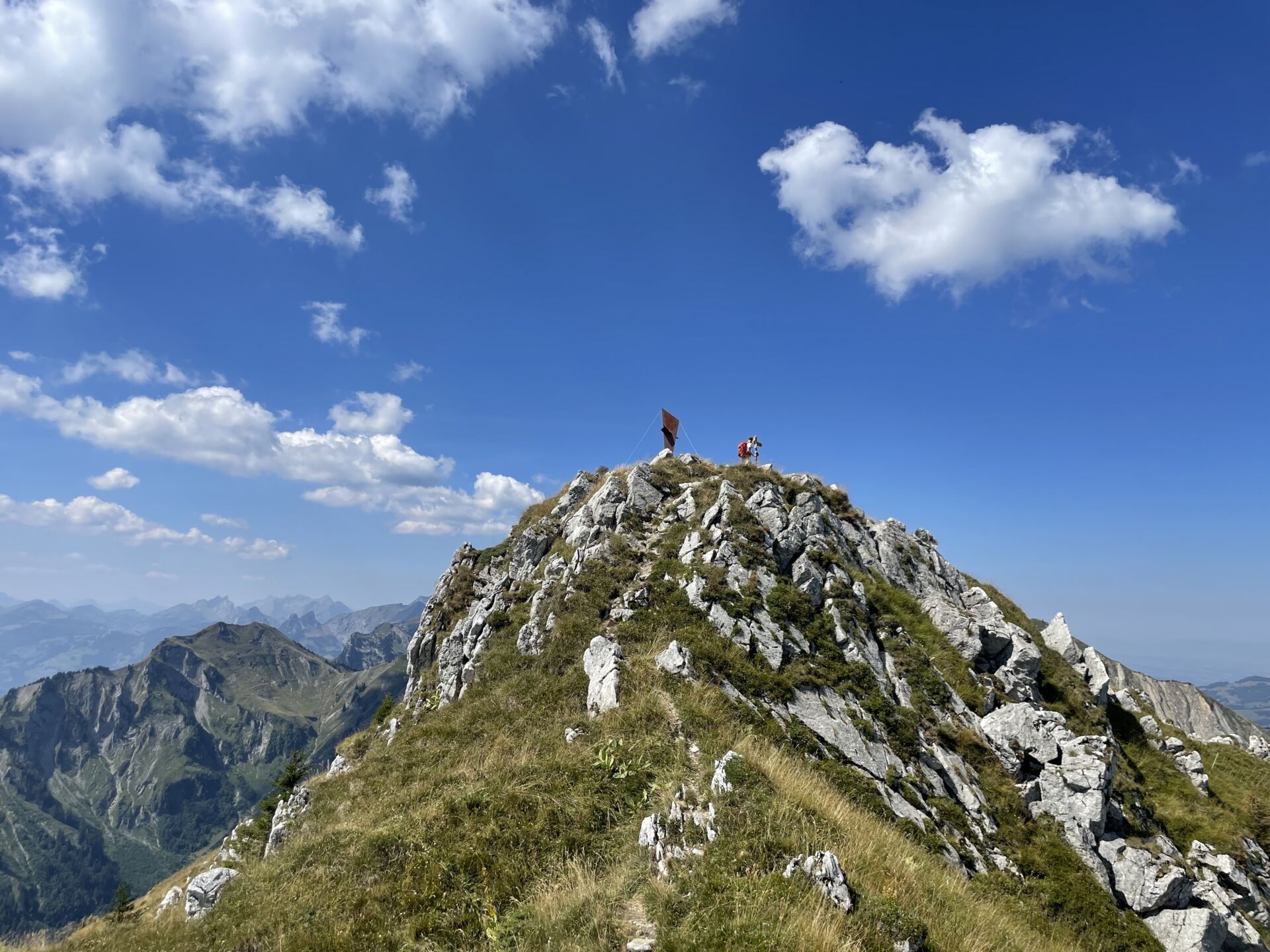 Kurz vor dem Gipfel helfen Ketten über ein felsiges, etwas ausgesetztes Teilstück hinweg, dann stehen wir auf einem gutmütigen, grosszügigen Grasplateau und schütteln uns die Hand. Die Bernerinnen singen inzwischen nicht mehr, ihnen ist jetzt offenbar die Luft etwas ausgegangen…