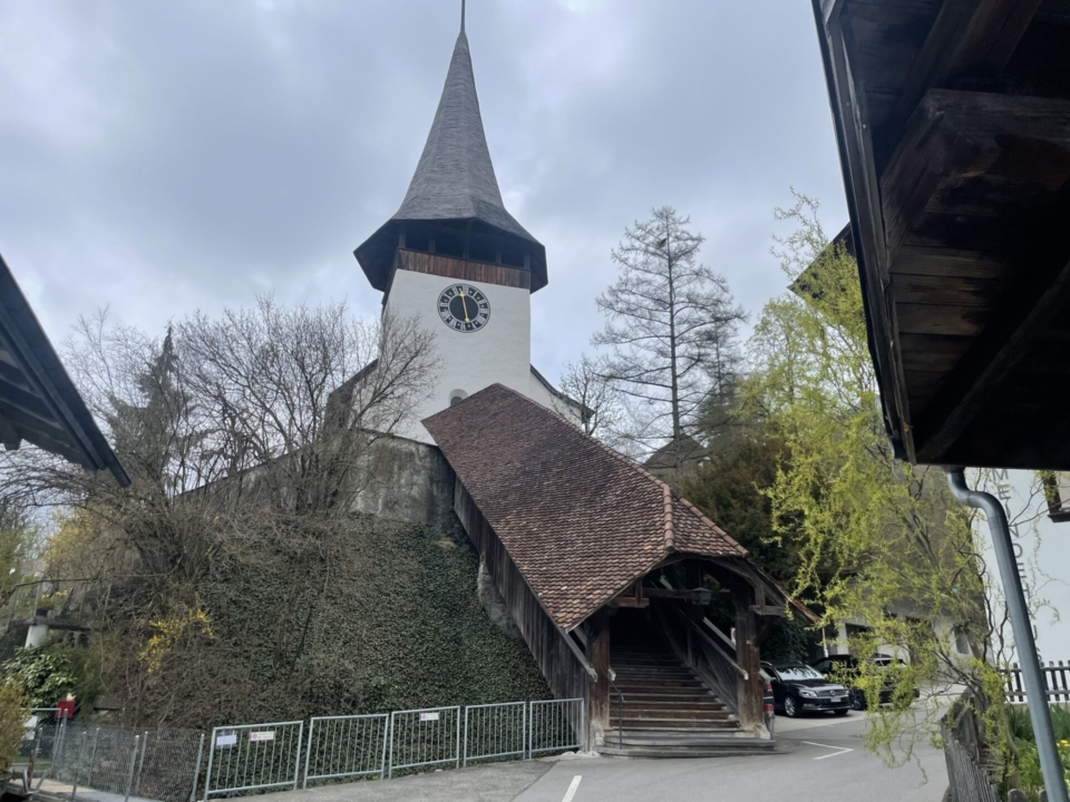 Die Tour beginnt am Bahnhof Erlenbach, der soeben für viele BLS-Millionen edel mit Unterführung und rollstuhlgängigen Perrons ausgestattet worden ist. Der „Huusweg“ Wegweiser führt mich hoch ins Dorf, wo ich die stark befahrene Kantonstrasse überquere. Hier stehen jahrhundertealte Bijou-Chalets – leider am falschen Ort, um davon zu träumen. Doch nur schon wenig oberhalb der Strasse wird es lebenswert, der Stolz der Gemeinde präsentiert sich zum Beispiel mit der kunstvoll überdachten Passarelle zur Kirche. Ein Sennenhund knurrt, eine Kuh muht, dann erreiche ich die saftigen Wiesen oberhalb des Dorfes.