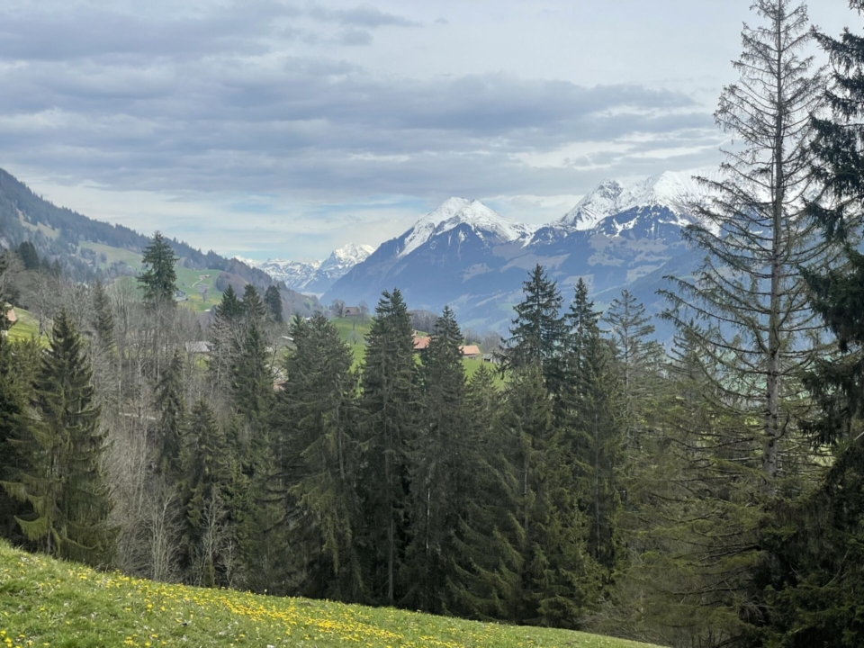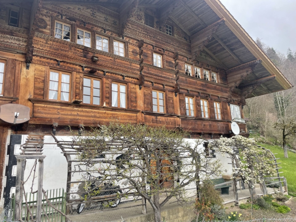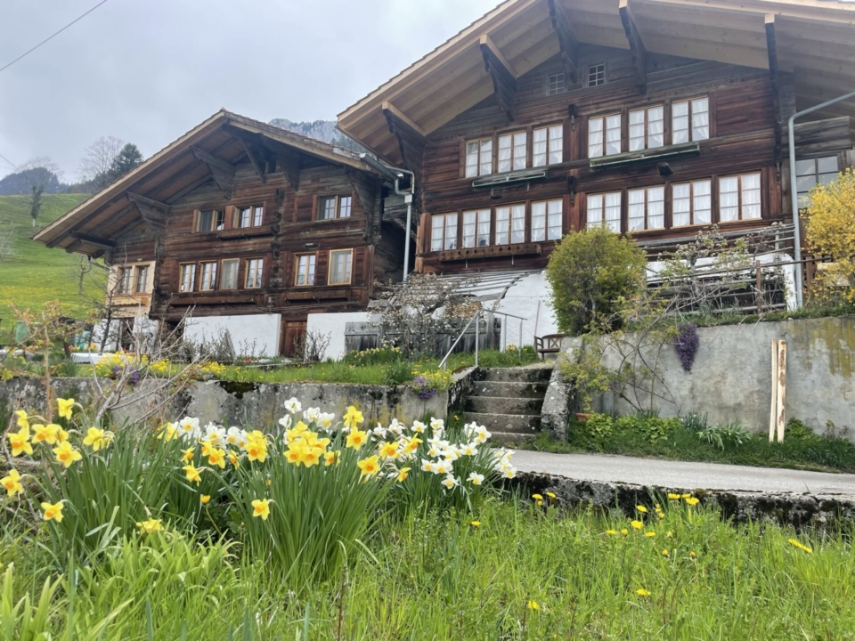 Der schmale Pfad führt langsam steigend talaufwärts hoch, bald unterlaufe ich die Kabel der Stockhornbahn. Mein Blick richtet sich auf die Niesenkette. Ich denke sofort an die Monstertour von Bergfreund Gabriel, der diese vor kurzem in nur einem Tag überquert hat. Jetzt sind die Gipfel allerdings noch sehr weiss und wirken wenig einladend für Wanderer. Ich erfreue mich deshalb lieber des Frühlings, der um mich herum in allen Facetten spürbar ist. Die gelben Blumen, die spriessenden Knospen an den Bäumen, die herumtollenden Kälber. Bald bin ich hoch genug über dem Talboden und der Weg folgt nun im Auf und Ab etwa der 1000er-Höhenkurve. Ich passiere eine Siedlung nach der anderen. Die Häuser sind reizvoll, die Verzierungen (oft) auch. Doch nicht so reichlich und kunstvoll wie ich das in Bhutan vor wenigen Wochen gesehen habe! Das Bauernleben mag heute leichter geworden sein, aber früher war das ein Kampf mit der Natur um die Existenz, da blieb nicht viel Zeit für Luxusarbeiten am Haus.