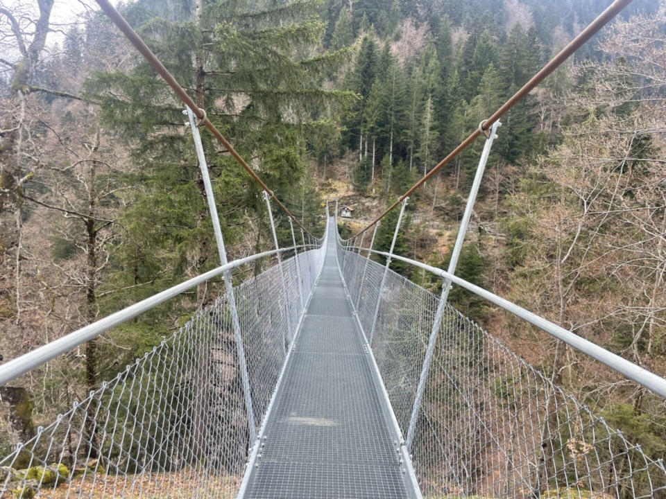 Trotzdem beeindruckt folge ich der immer enger werdenden Schlucht weiter nach hinten. Dort, wo sie sich zweiteilt, führt ein steiler, kettengesicherter Treppenweg rund 170 Meter hoch. Mit deutlich höherem Puls am Schluchtrand angekommen erwartet mich eine tolle Hängebrücke. Die Überquerung braucht etwas Mut. 170m Tiefe sind wirklich viel, vor allem wenn da weit unten wilde Wasser tosen.