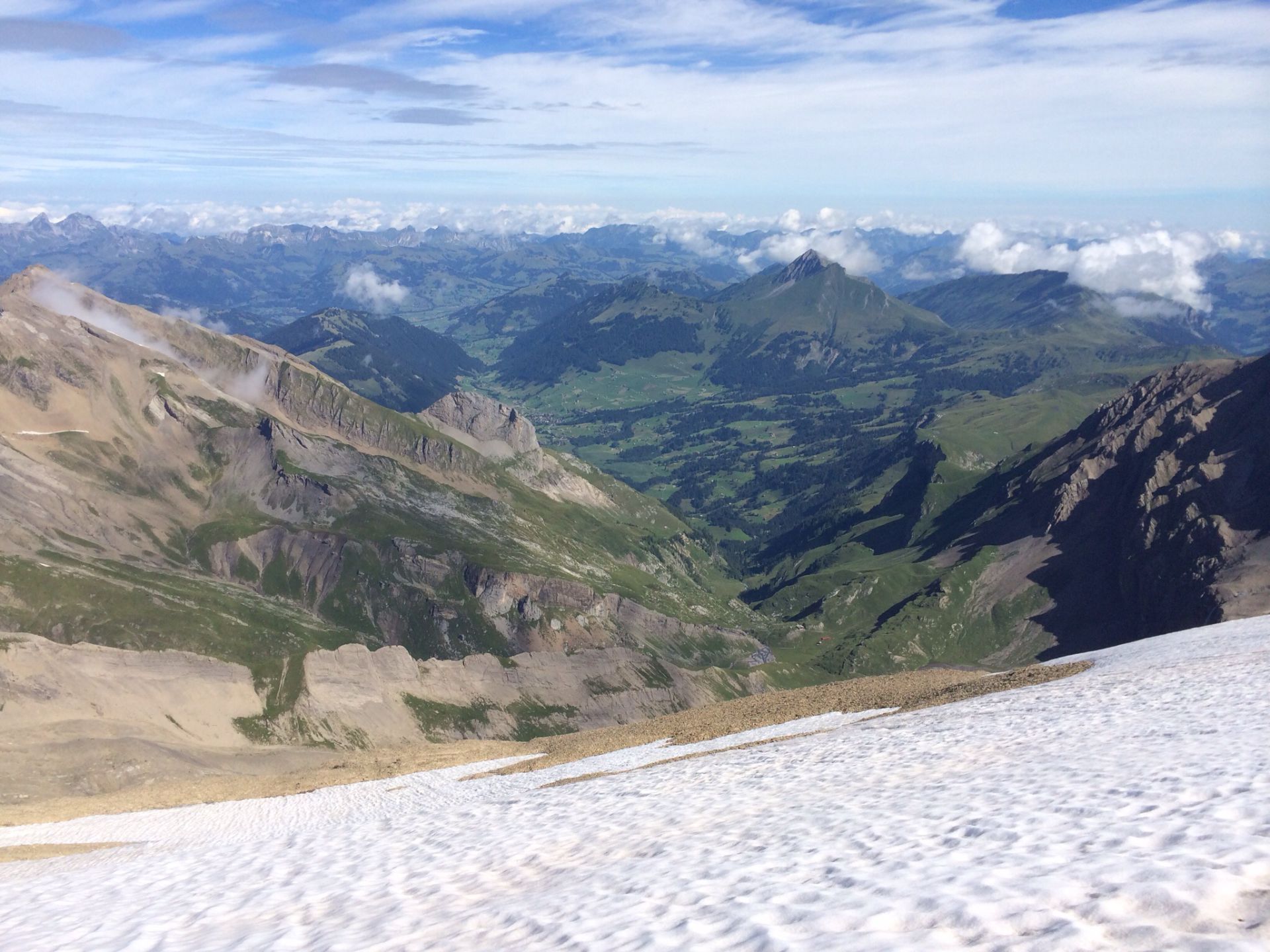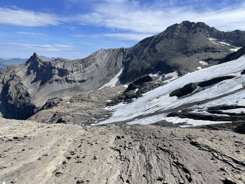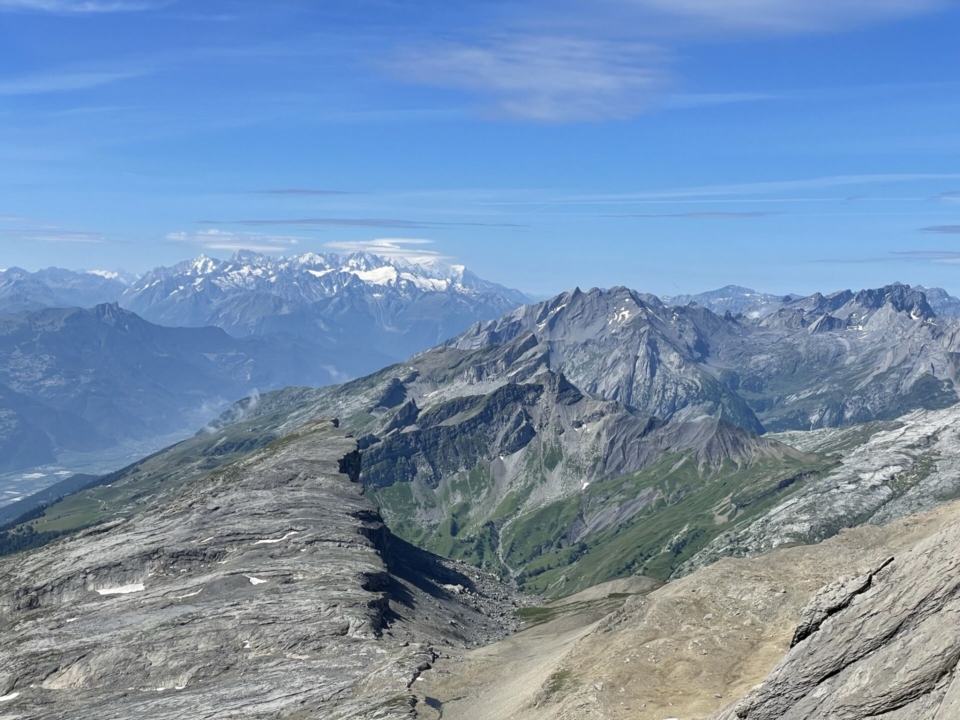 Auf einmal öffnet sich der Horizont, und die Walliser Viertausenderkorona lacht mich an. Auf den letzten Metern zum verwächteten Gipfel meine ich zu schweben, der Rundblick ist umwerfend. Es bläst allerdings ein zügiger Talwind von Süden, ich kann nicht lange stehen bleiben. Auf der Nordseite unterhalb des Gipfels finde ich ein geschütztes Plätzchen für die verdiente Gipfelrast. Sonne pur und Wärme, Stille, ein Rivella und ein Landjäger – was will man mehr? Tief unter mir die wunderbare Route zur Cabane des Audannes, die ich vor zwei Jahren mit Reto begangen habe.