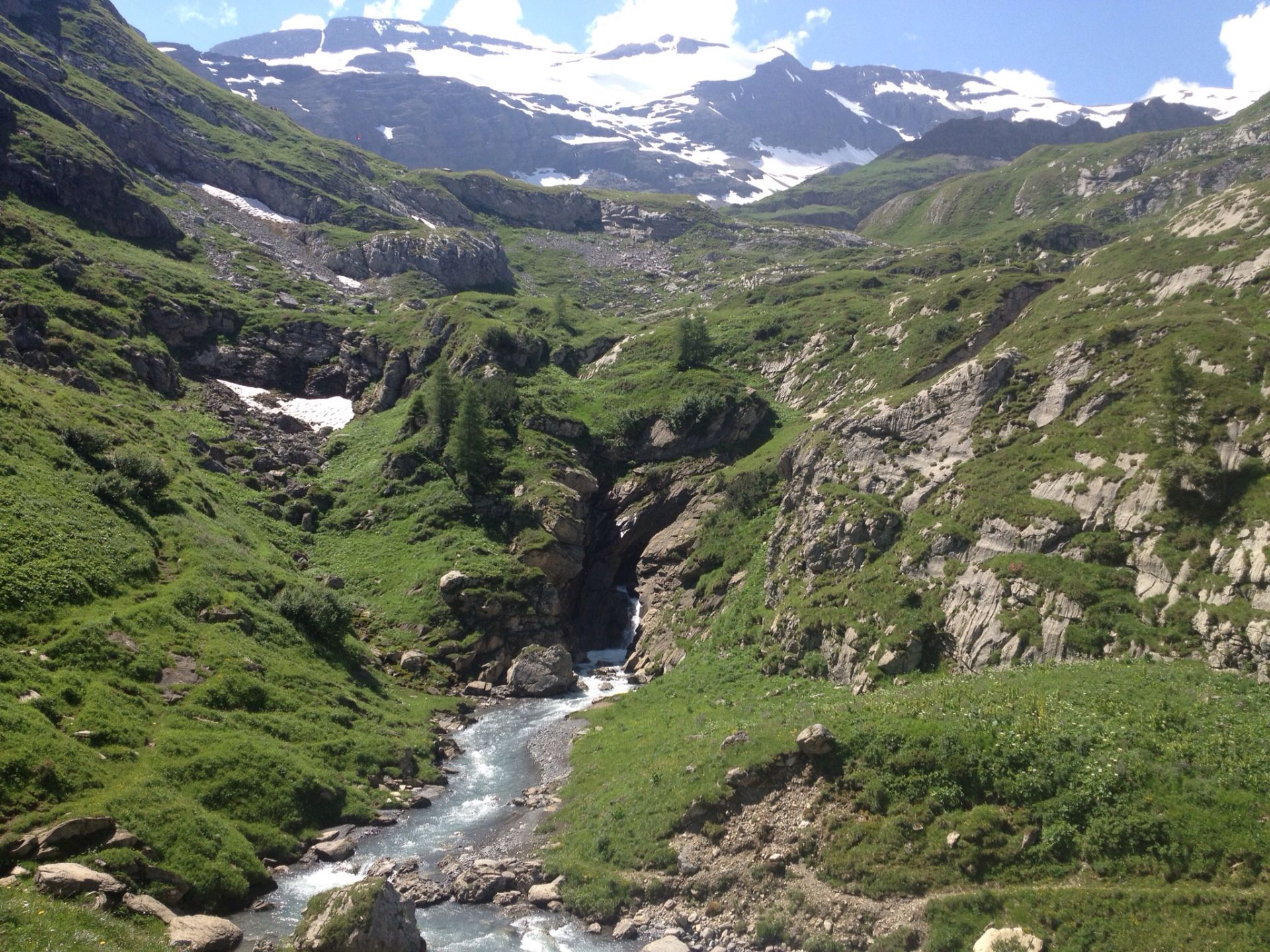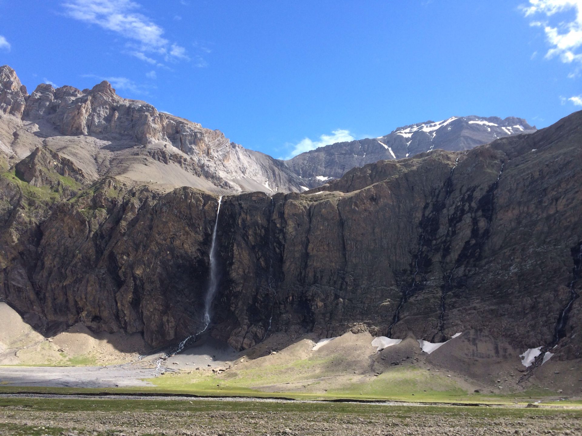 Die Markierung wechselt hier von Rot-Weiss auf Blau-Weiss. Schon kurz nach der Hütte weist eine kurze Kletterei Ungeübte in die Schranken. Am Fuss des Wildhorns erreiche ich die „Kathedrale“, ein Flussdelta unterhalb einer breiten, hohen Felsenkulisse. Bis zu 14 Wasserfälle stürzen hier hinunter. Am morgen ist es noch ruhig hier, aber sobald es wärmer wird nimmt das Rauschen des geschmolzenen Gletscherwassers kräftig zu.