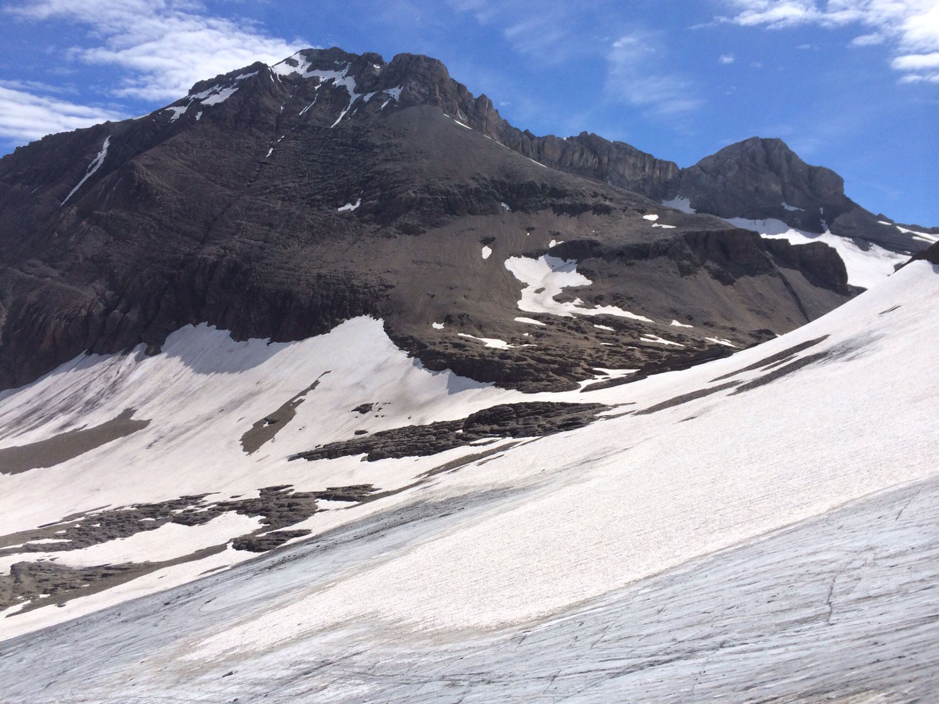 Durch das Rottal führt der schmale Pfad jetzt östlich steil hinauf in Richtung des Arpelistocks. Über letzte Grasflächen, die von ein paar Schafen und einer Herde Yaks kahlgefressen werden, erreiche ich die Abzweigung zum Col du Brochet (aufgepasst, nur durch ein Steinmännchen gekennzeichnet). Jetzt weisen nur noch ein nicht immer gut sichtbarer Pfad und Steinmännchen den Weg. Die Route führt spannend über Felsbänder, Schutthalden und Steinblöcke zur Zunge des Geltengletschers. Ich hole einen älteren Einheimischen ein, der auf dem Weg zum Wildhorn ist. Wir plaudern ein Weilchen, er erzählt von früher und gibt mir eine paar wertvolle Hinweise mit.