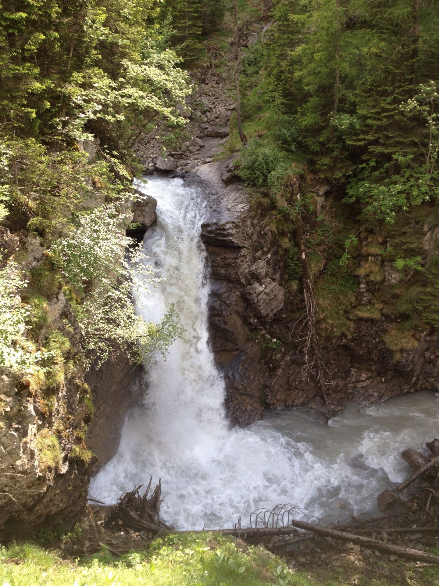Jetzt folgt ein steiler Zickzackweg nach oben, die Geltenschuss-Stufe muss überwunden werden. Der schweisstreibende Anstieg findet sein Ende an einer Felswand, über die ein Wasserfall herabplätschert. Die paar kalten Tropfen auf der Nase kühlen angenehm.