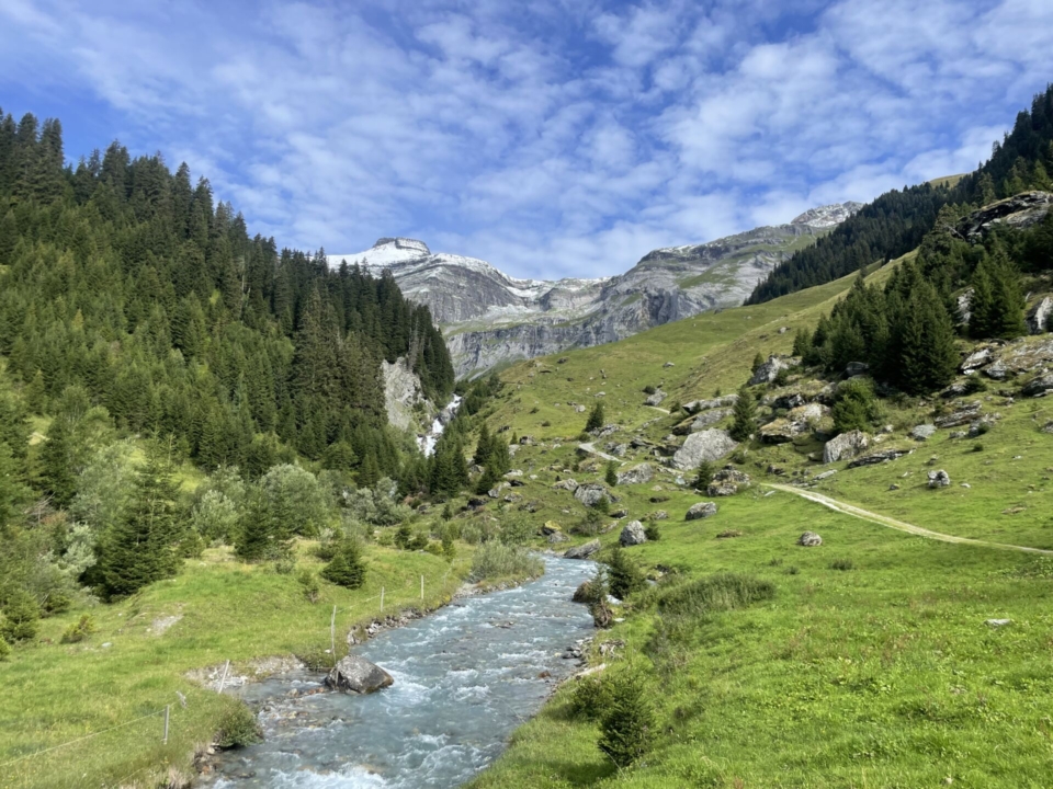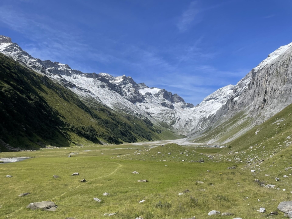 Es folgen noch ein paar hundert Meter durch Gras und bald erreichen wir die Absperrung für die Kühe und etwas später den Hüttenweg. Das war super! Wir setzen uns auf einem Felsvorsprung ins Gras und blicken nochmals hinunter in diese wilde Wand und ins daruntergelegene, prächtige Val Frisal. Zeit für ein Picknick!