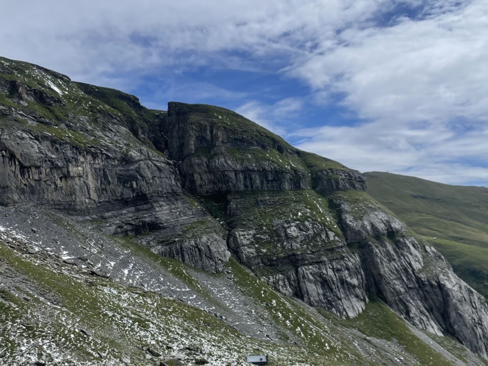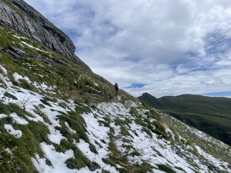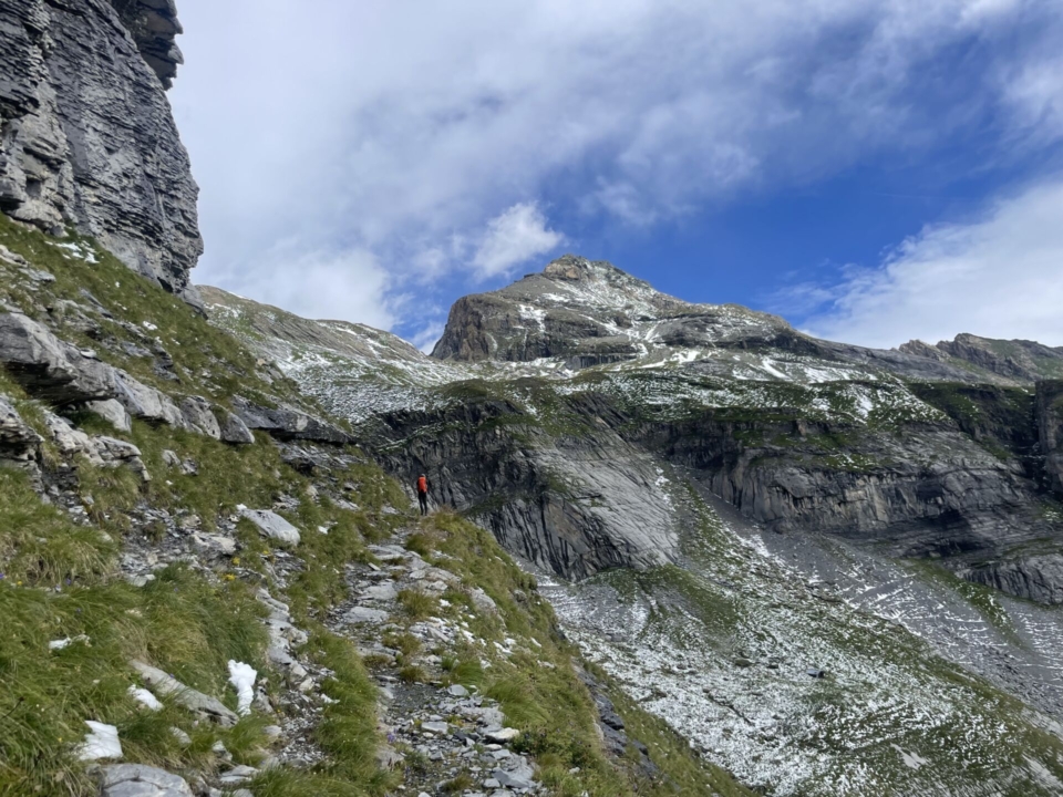 Wir suchen im grasigen Steilhang nach Wegspuren und werden bald fündig. Nach 30-40 Höhenmetern durch Gras stehen wir auf einem Pfad, der seinem Namen zumindest ein Weilchen lang gerecht wird. Dieser windet sich sehr steil ansteigend um die Felspartien, dann verschwindet er im Gras und die Route muss erahnt werden, bald auch noch durch Schneereste erschwert. Steinmänner hat es keine, aber mit Hilfe des GPS geht es eigentlich gut. Dann beginnt die Querung nach Osten und bald erreichen wir das erste Band, das sich erfreulicherweise wie ein richtiger Pfad präsentiert. Dieser führt nun leicht hinunter und verliert sich dann in hohes, mit Felsbrocken durchsetztes Gras. „Oberhalb der Hüttchens“ bleiben, erinnere ich mich an den Hikr-Bericht. „Aber wo beginnt nun dieses nächste Band (siehe Foto unten)?“.