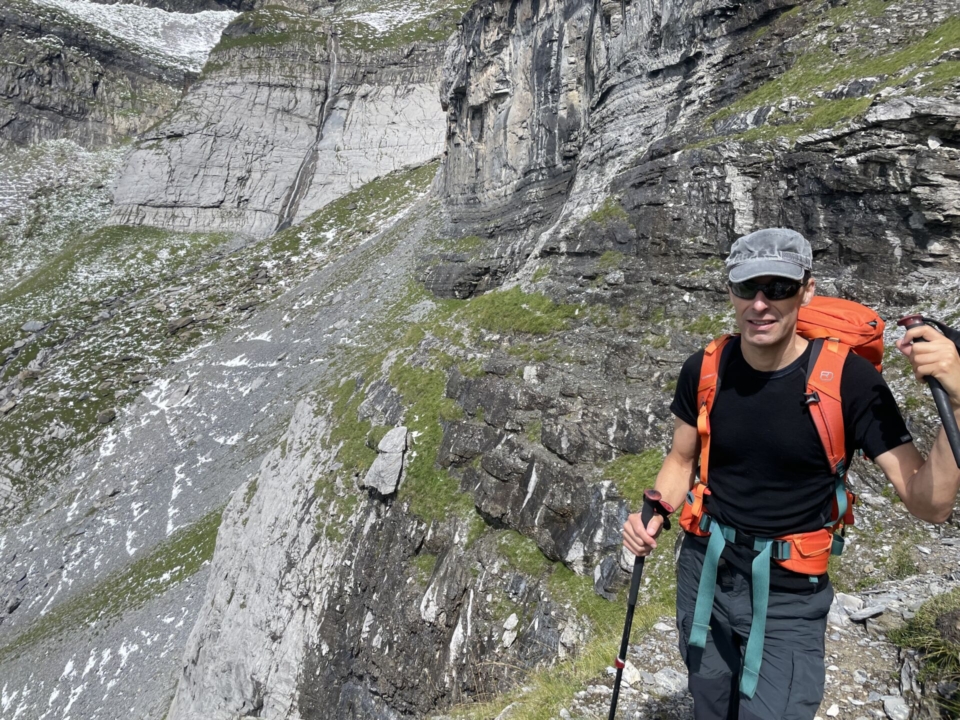 Aber auch das ist eigentlich eindeutig. Bei einem grossen Felsbrocken geht‘s los (wir haben für unsere Nachfolger ein Steinmännchen darauf gebaut). Reto kann‘s kaum glauben, aber es geht ganz leicht. Nur gerade an zwei Stellen wäre eine Kette gut für die Psyche und für die Linderung der Sorgen der Zuhausegebliebenen. Bald wandert sich es aber auch hier ganz wohlig auf einem guten Wildwechsel um die ganze Felswand herum.