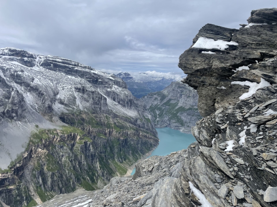 Aber natürlich ist es noch viel zu früh, um an den Hüttenchill zu denken – dieses Gipfelchen muss noch her! Und tatsächlich ist der Schnee um das Kistenstöckli schon vielerorts wieder geschmolzen und der Schutt des Kegels wieder sichtbar. Wir wagen es – aber lassen die schweren Rucksäcke in der Hütte zurück. Dann erstürmen wir dieses Kleinod nur mit den (sehr hilfreichen) Wanderstöcken in den Fäusten. Es ist steil, aber nicht zu steil, kurz vor dem Gipfel geht es in die Felsen und der schaudernde Tiefblick auf die Nordseite wird frei – unten schimmert der Limmerensee: wow! Doch Achtung – konzentriert bleiben und vorsichtig weitersteigen. Das letzte Stück mit Hilfe von Ketten, dank derer sich die Brocken ganz einfach bezwingen lassen. Nach 28 Minuten stehen wir auf dem Gipfelplateau. Und dann beginnt ein Riesenfest!