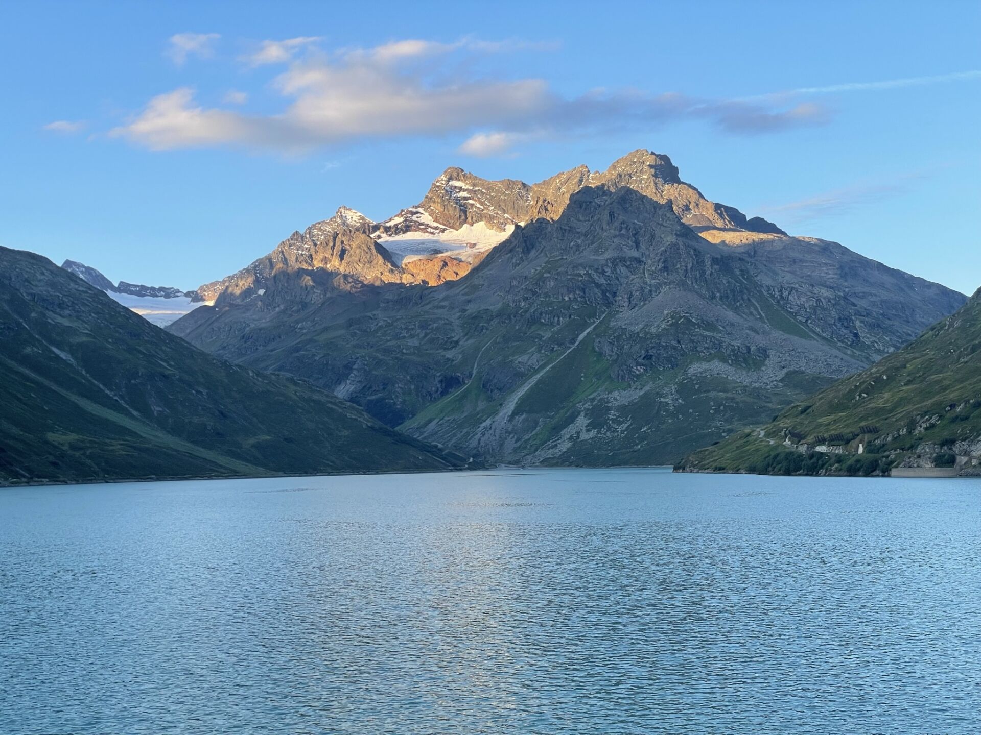 Kurz danach zurre ich den Rucksack fest und lege los. Zuerst hoch zum Staudamm, dann rund um den Silvrettasee zum Ostufer, von wo aus ein Alpsträsschen ins Ochsental führt. Ich freue mich über die ersten Sonnenstrahlen, die sanft über die grimmigen Felszacken streichen und ihnen das Bedrohliche nehmen. Was Tageszeiten doch ausmachen!