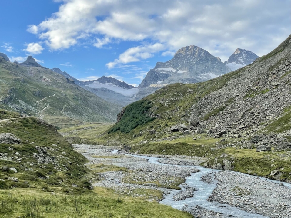 Bald biege ich in das Ochsental ein, der stolze Piz Buin und das Silvrettahorn tauchen vor mir auf. Beide mit üppiger – oder zumindest noch fast üppiger – Gletscherzier eingekleidet. Zum Anbeissen schön! Das Zusammenspiel des Panoramas mit dem rauschenden, mäandernden Bach ist grandios – ich bleibe immer wieder stehen, um ein noch besseres Foto zu machen. So kommt man natürlich nicht vorwärts, aber ich habe ja Zeit.