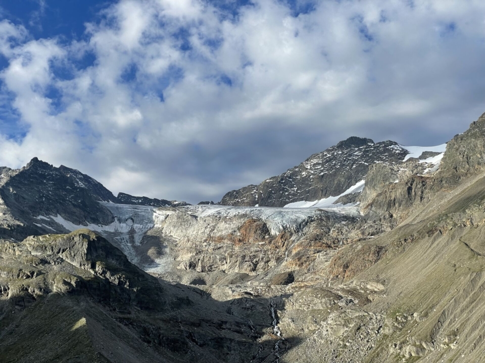 Die Tuoihütte musste kürzlich (und noch immer) ein bisschen leiden, wie mir der Hüttenwart erzählt. Der drohende Abbruch von über 700’000 Kubikmeter Fels führten zur Schliessung der Hütte im letzten Winter. Jetzt muss (oder müsste) man einen kleinen Umweg einschlagen, um sicher von der Hütte weg zu kommen. Sie liegt genau am Rand der berechneten Gefahrenzone. Aber heute ist alles ruhig und ich beisse auf der Terrasse entspannt in ein Stück Nusstorte, hinunterspühlend mit viel Rivella.