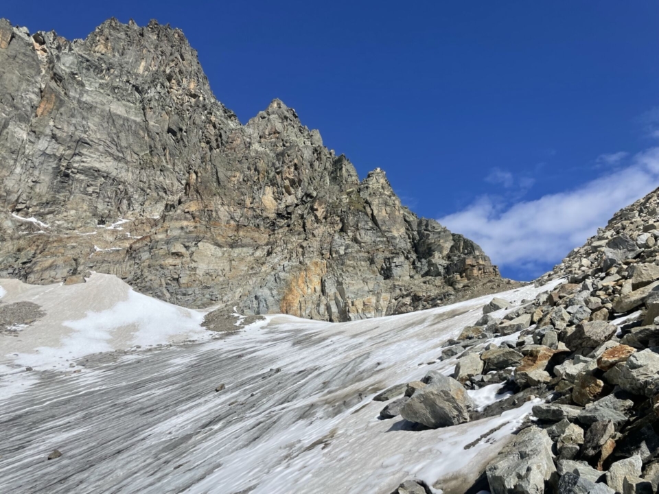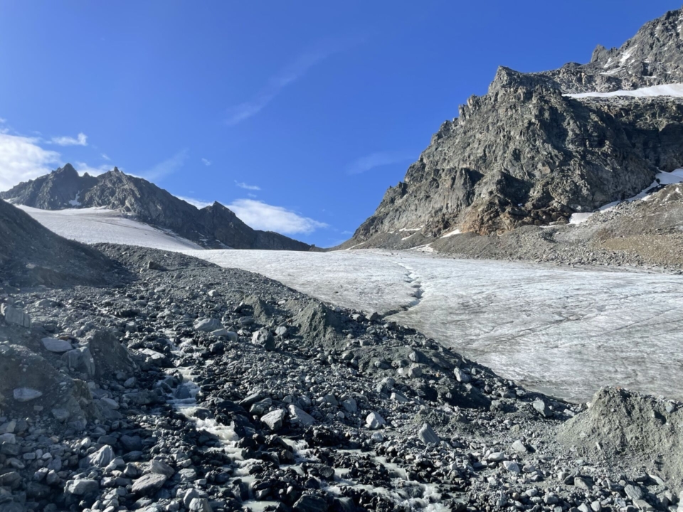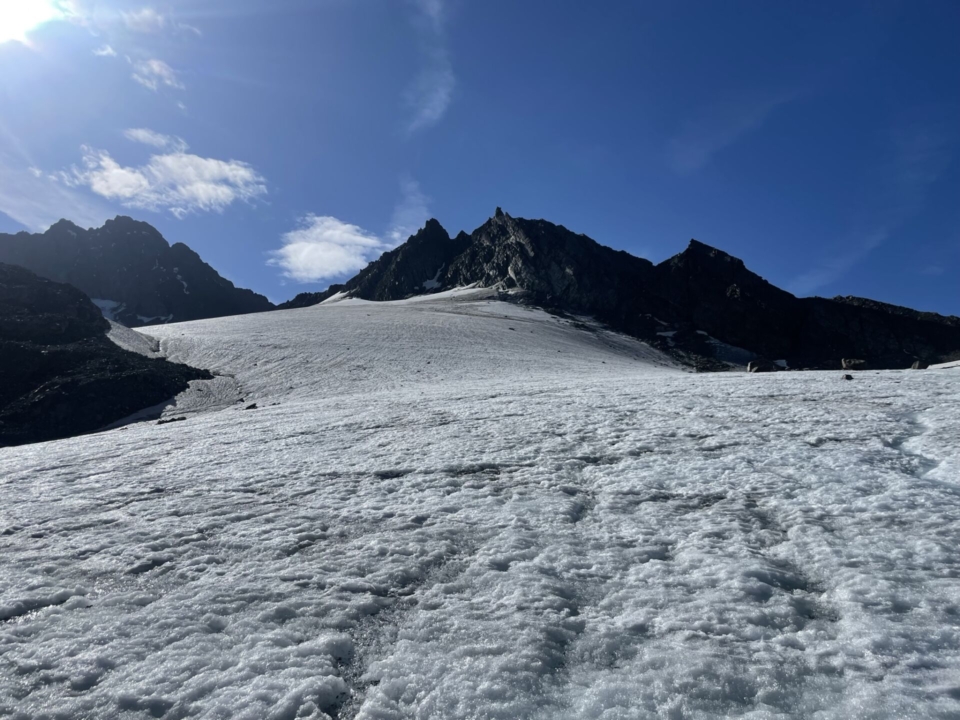 Mich kümmert’s nicht, ich peile gerne auf den anfangs guten, dann zunehmend schwächeren Pfadspuren auf den Gletscher zu. Die Richtung ist klar – einfach der Nase folgend zum Gletscher und zur dahinterliegenden Lücke. Bald erreiche ich den grossflächigen Eispanzer, der zwar sicher auch kleiner geworden ist, aber hier wohl noch einige Jahrzehnte ausharren wird. Spalten weist er kaum auf, deshalb ist er problemlos begehbar. Nur die Spikes ziehe ich über die Schuhe, sonst wird das trotz des bescheidenen Steigungswinkels ein Rutschfestival.